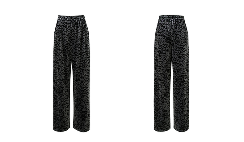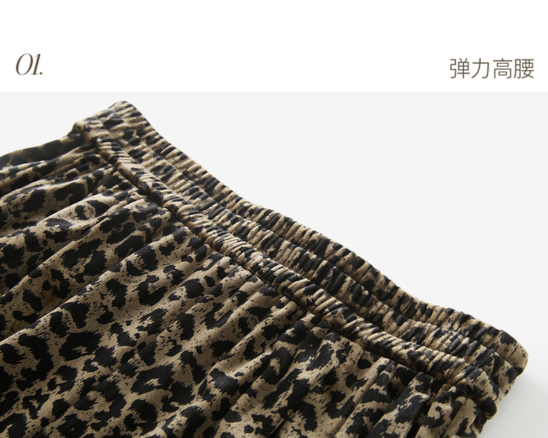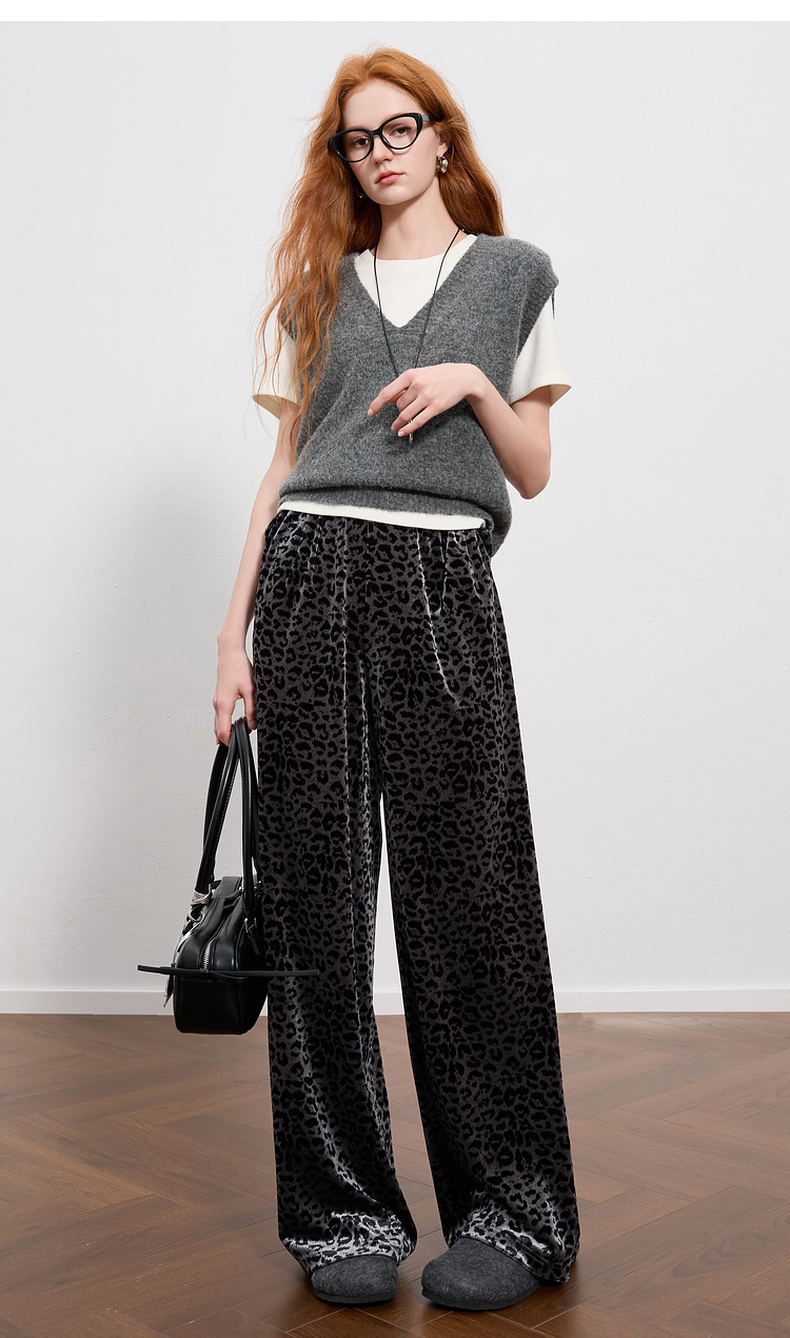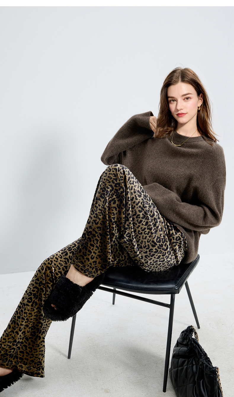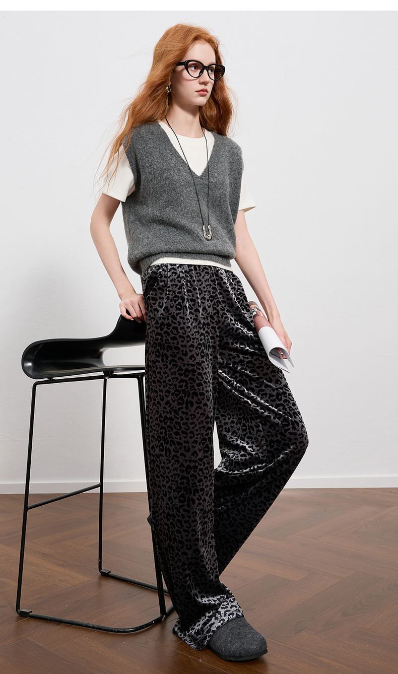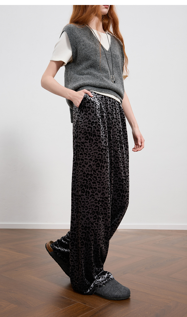 三彩2025冬季新款豹纹丝绒长裤高腰松紧直筒裤宽松拖地裤休闲M