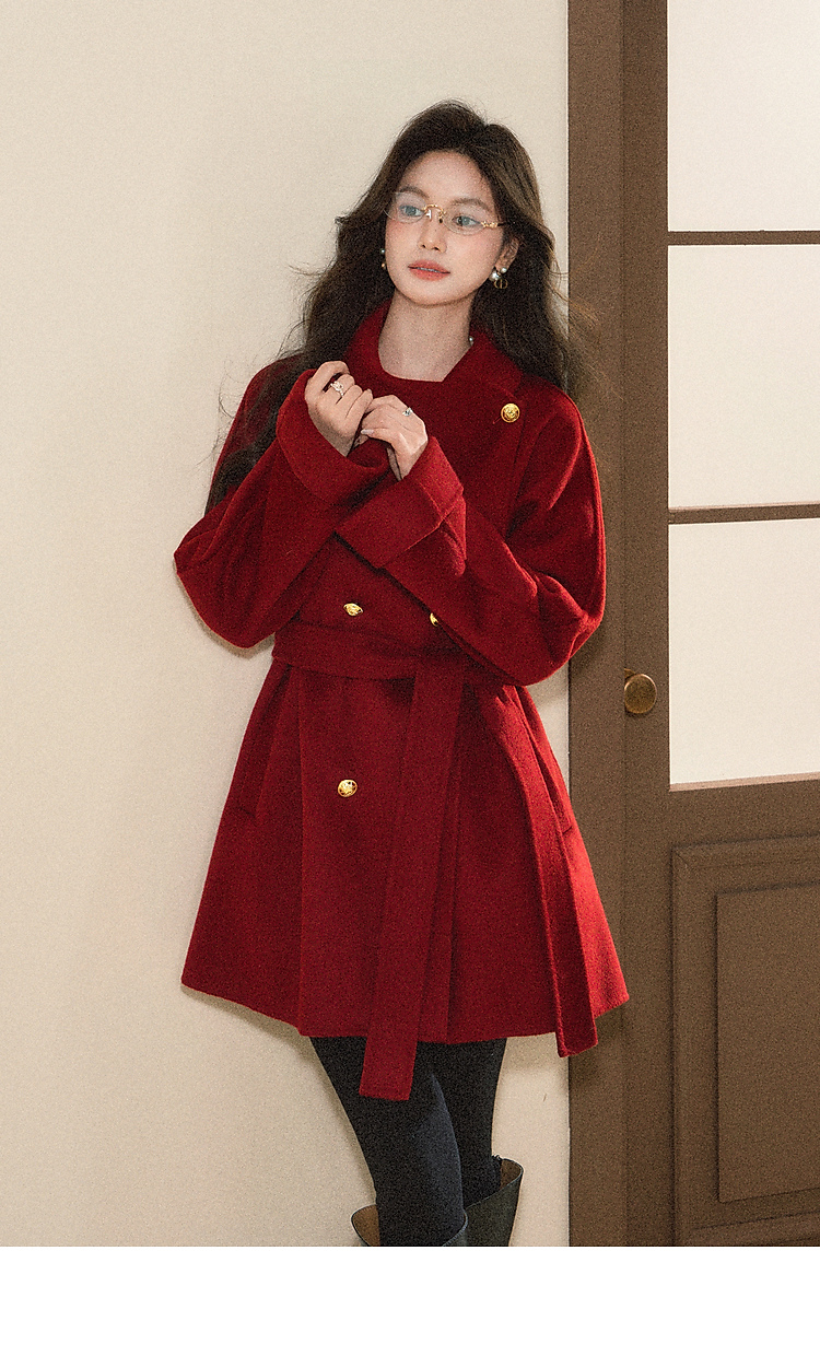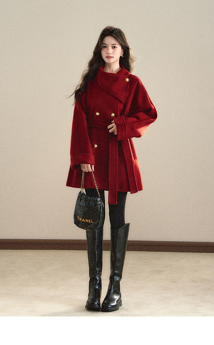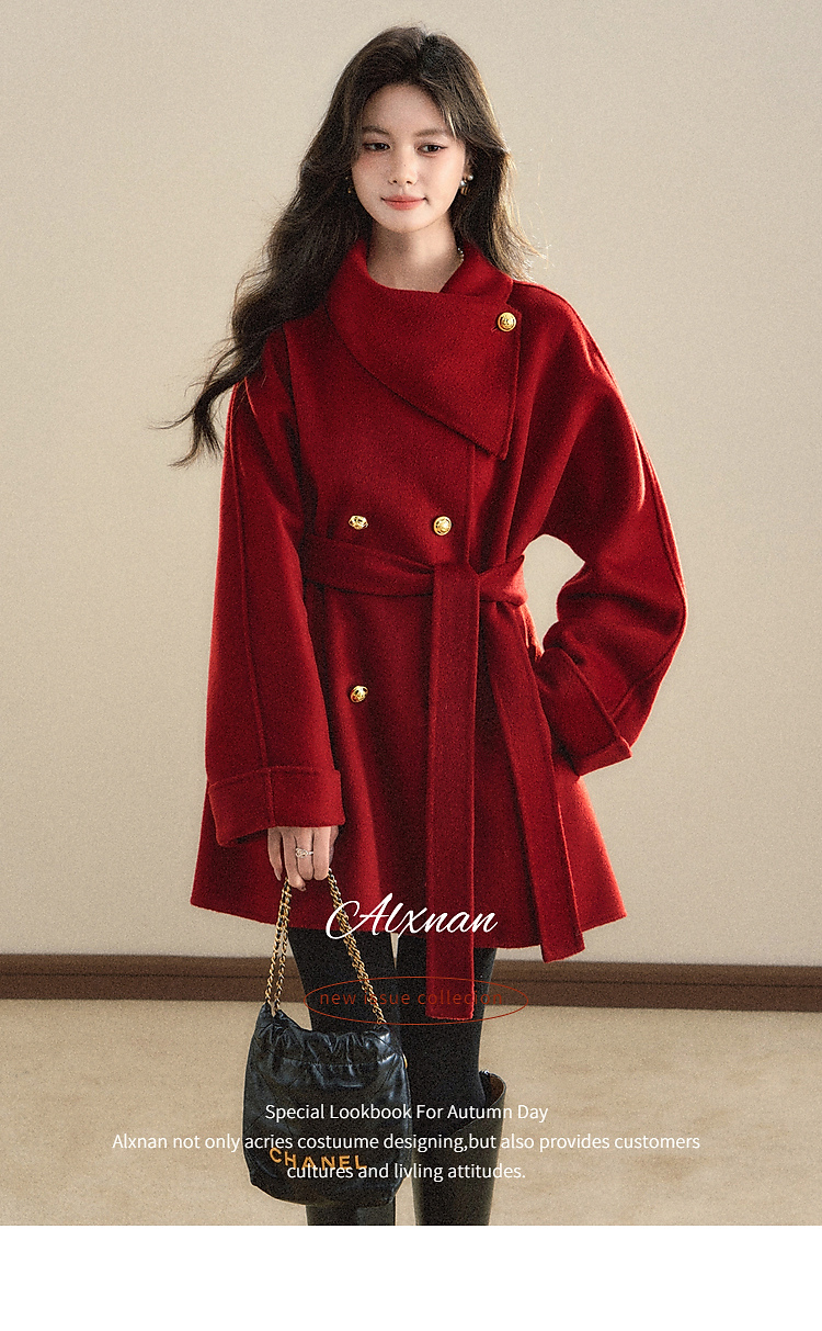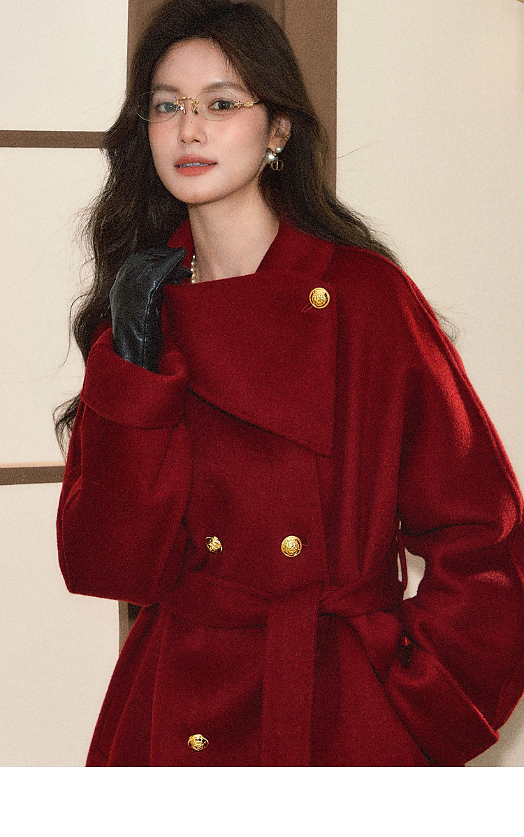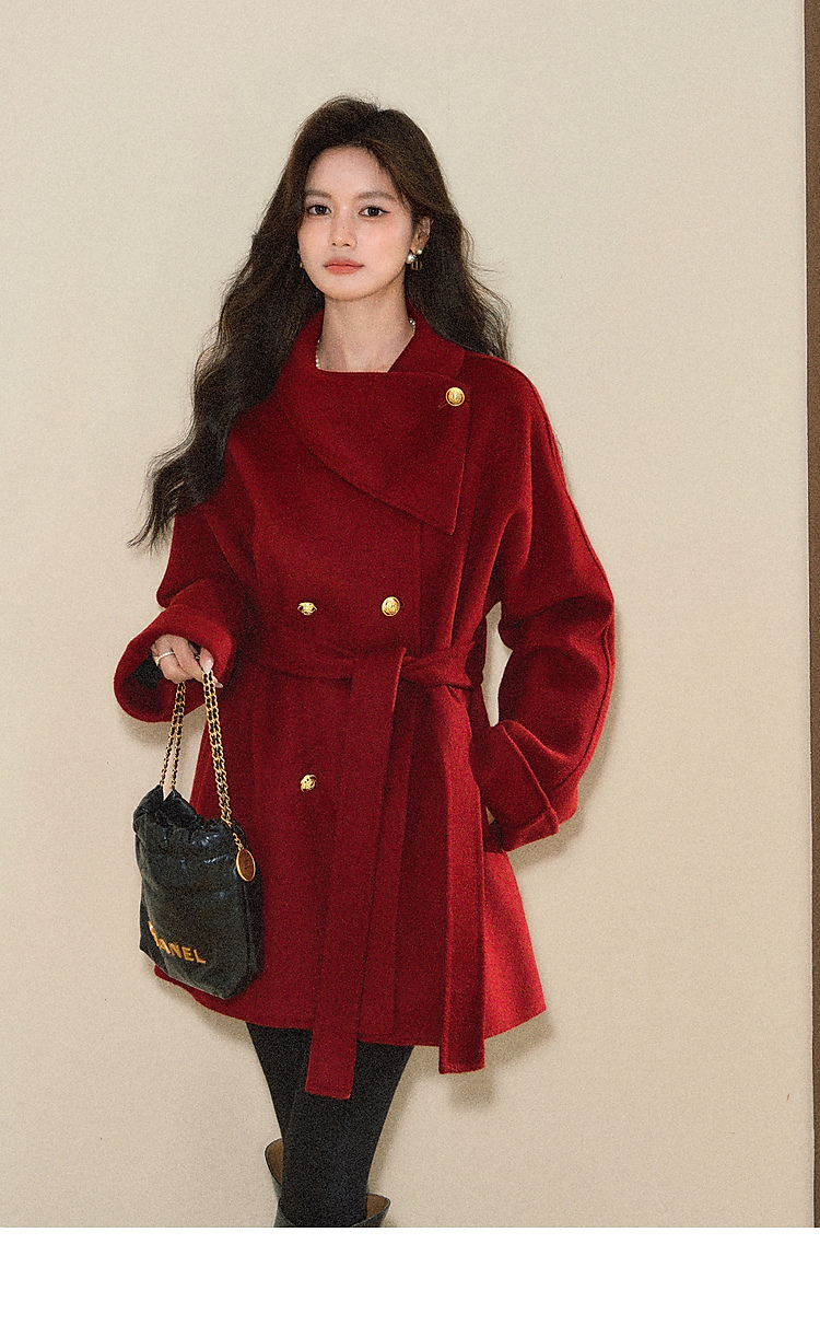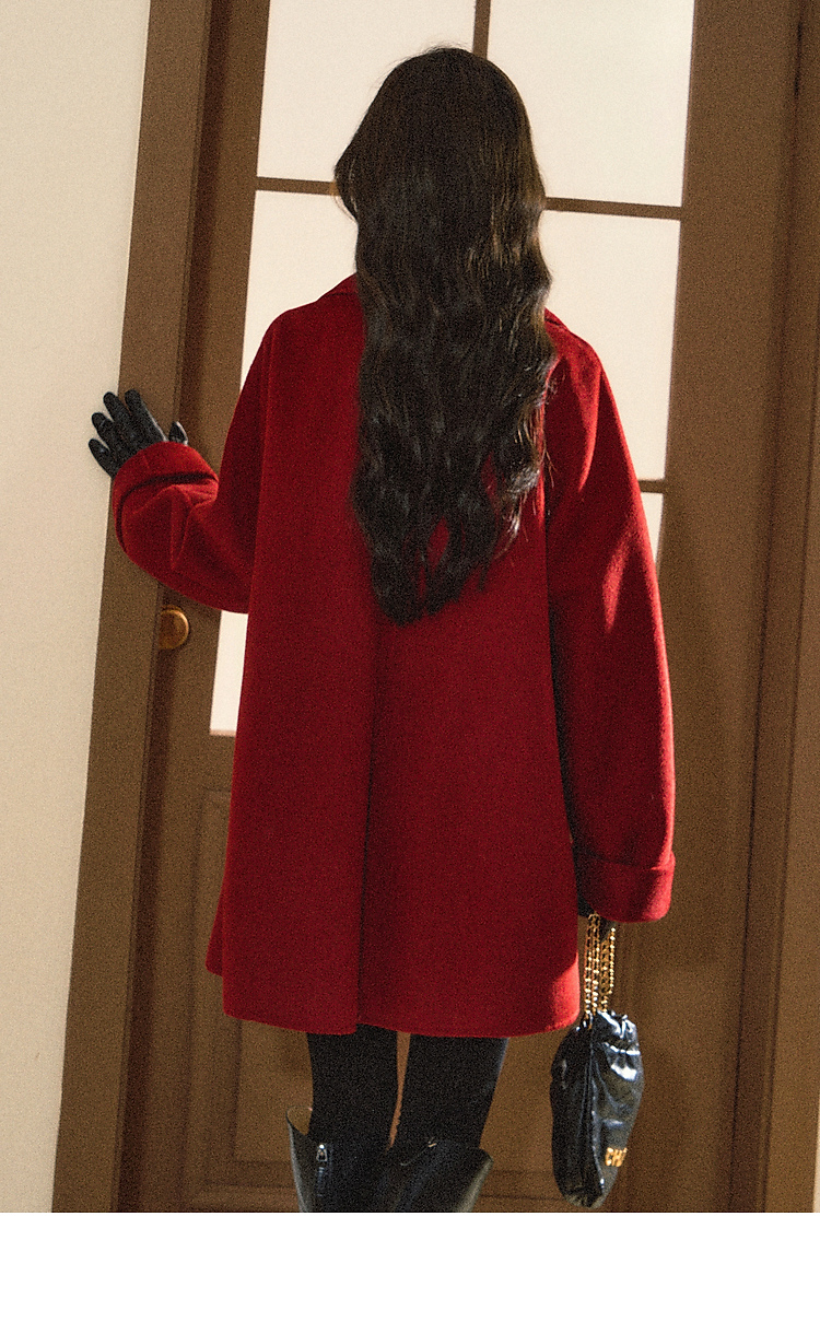 鹿向南「寒香梅花」红色毛呢外套女秋冬新款气质中长款设计感大衣