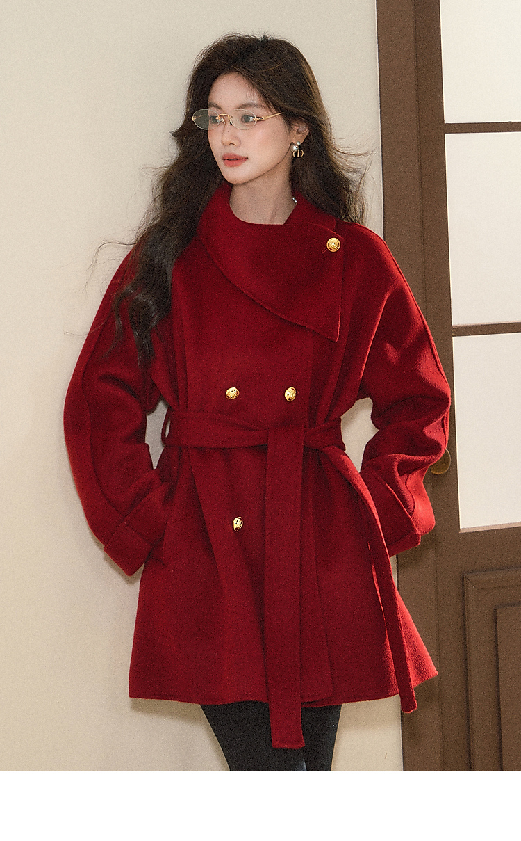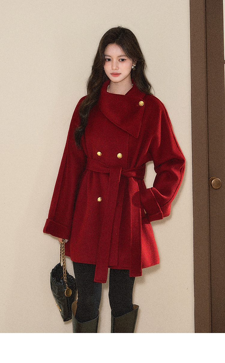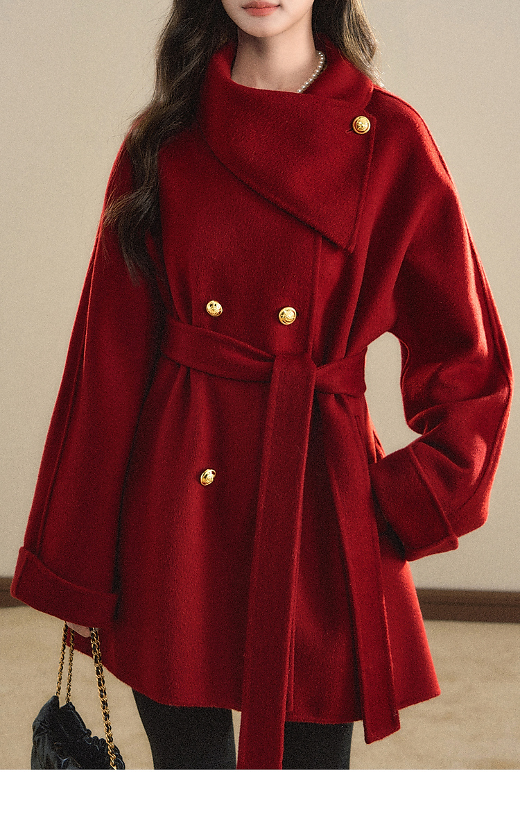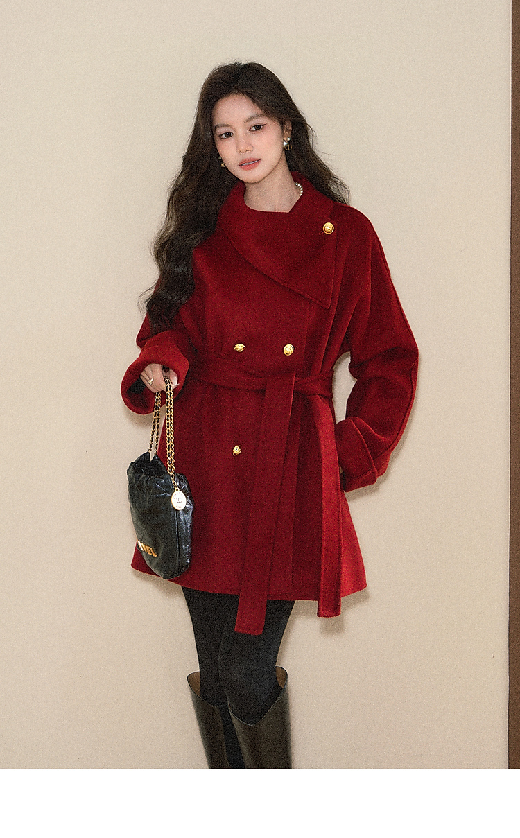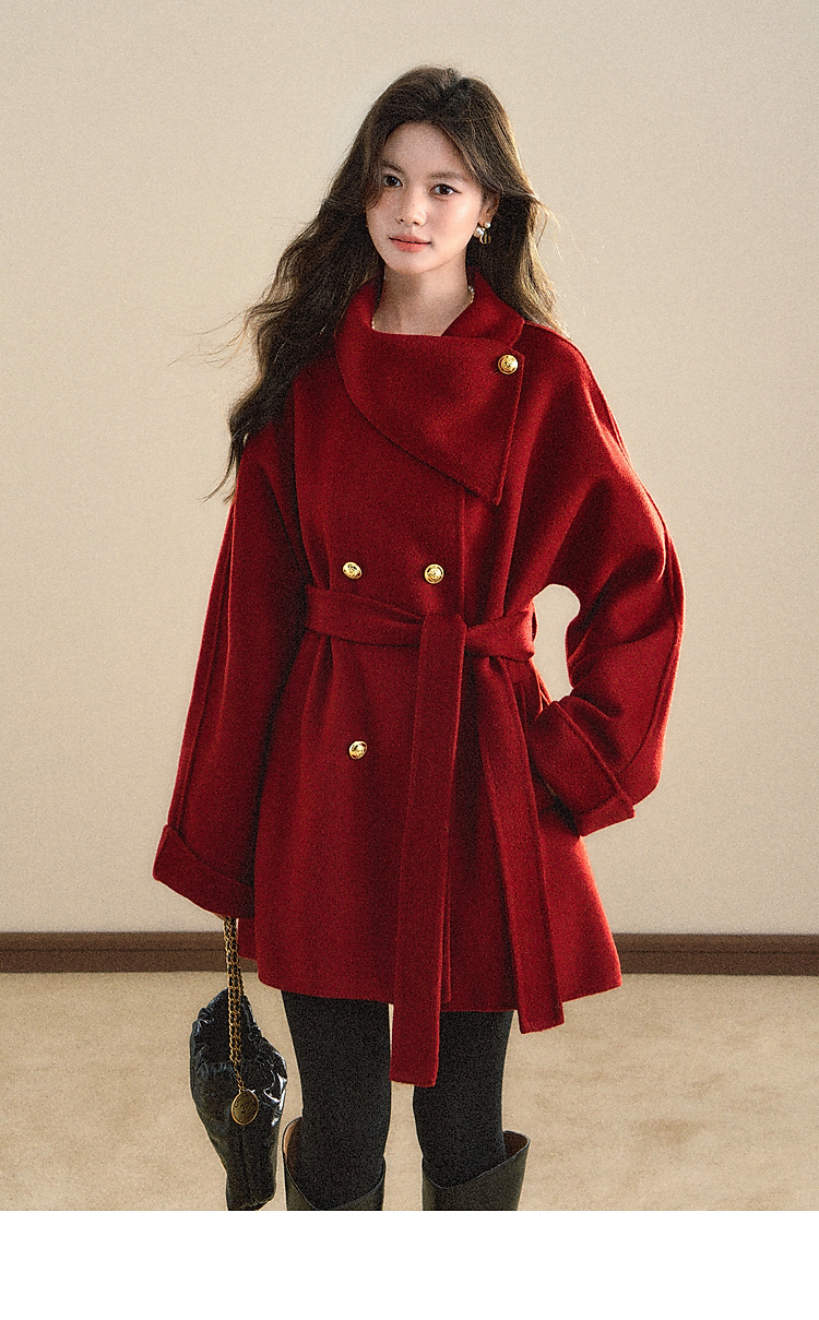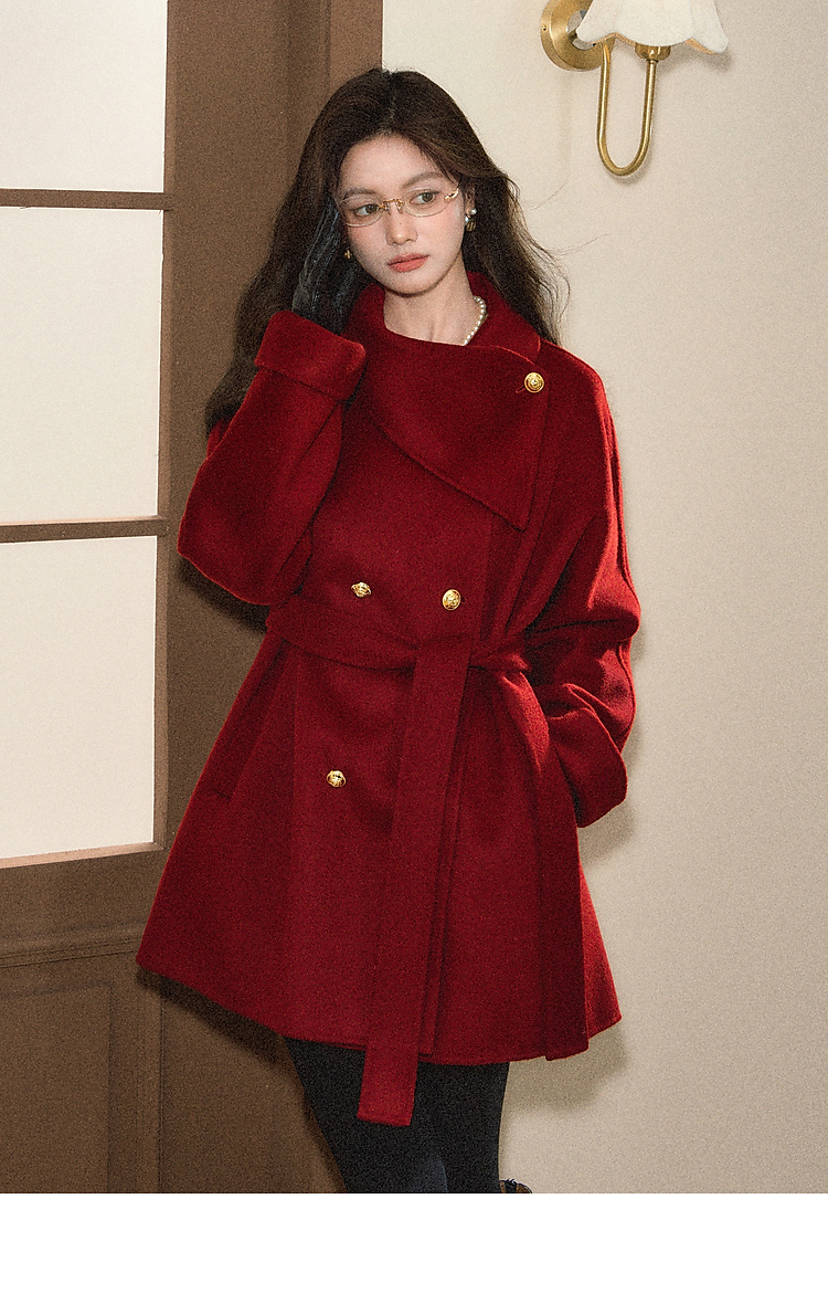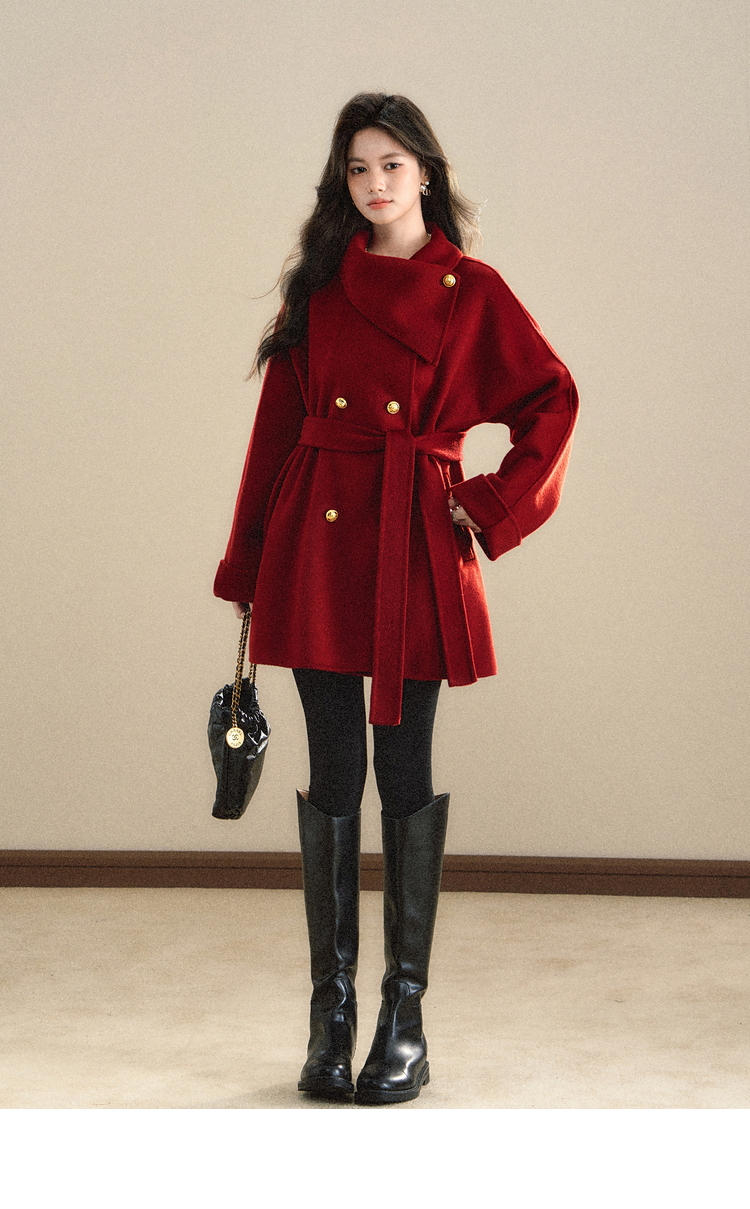 鹿向南「寒香梅花」红色毛呢外套女秋冬新款气质中长款设计感大衣