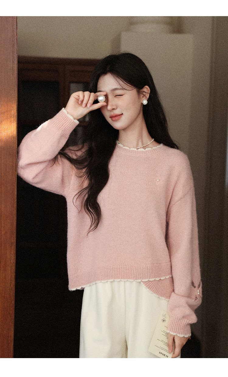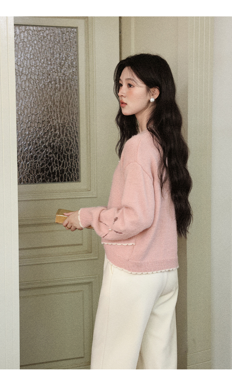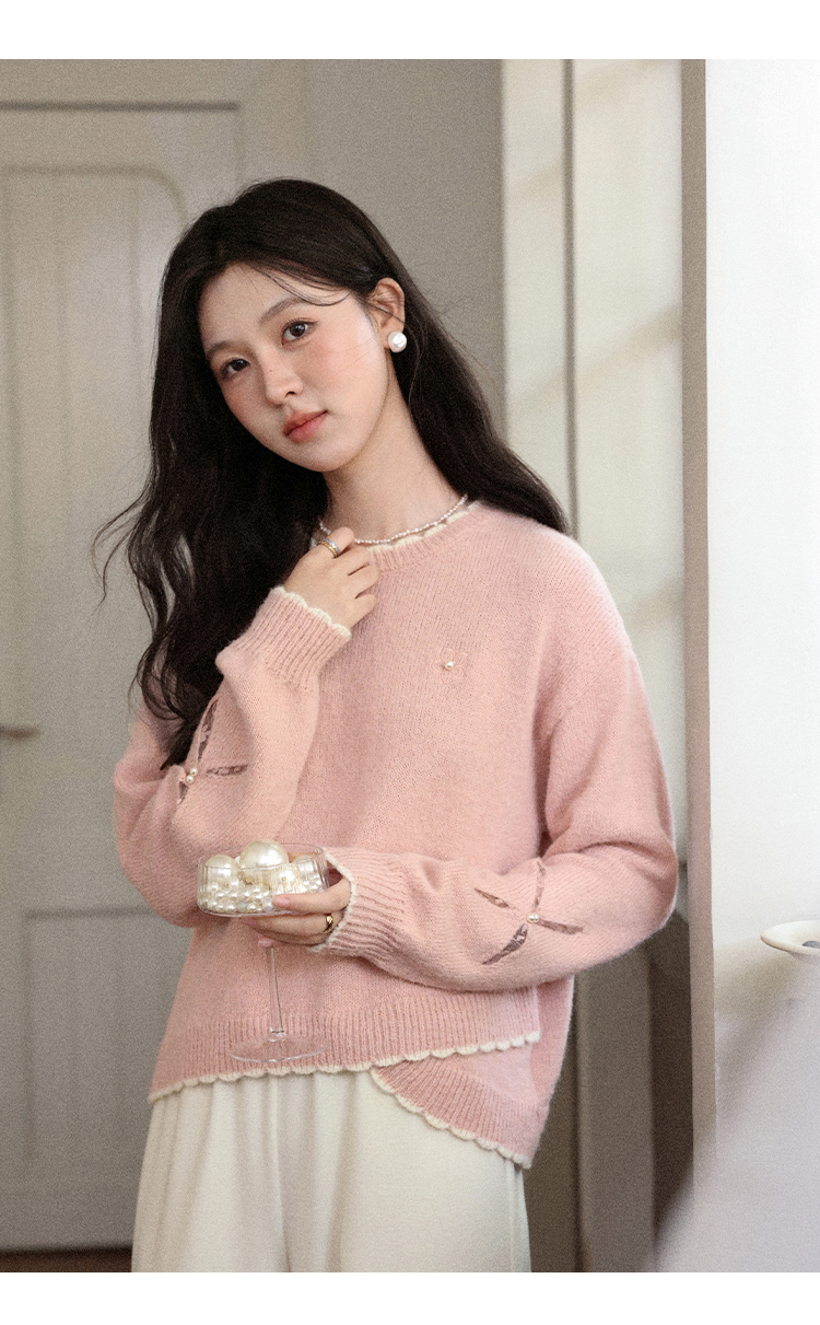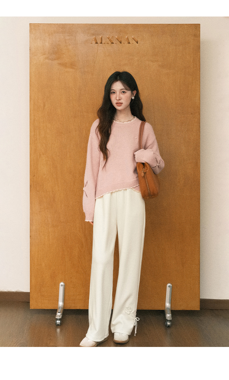 鹿向南「含花待放」粉红色圆领针织衫早秋新款设计感甜美上衣女款