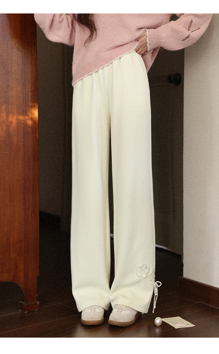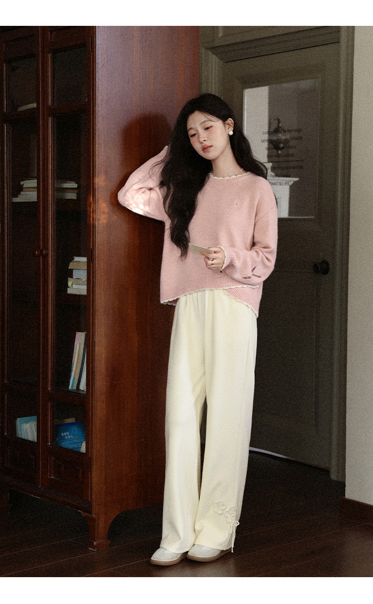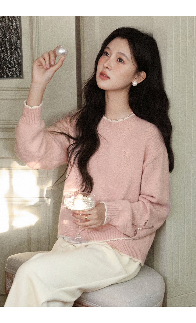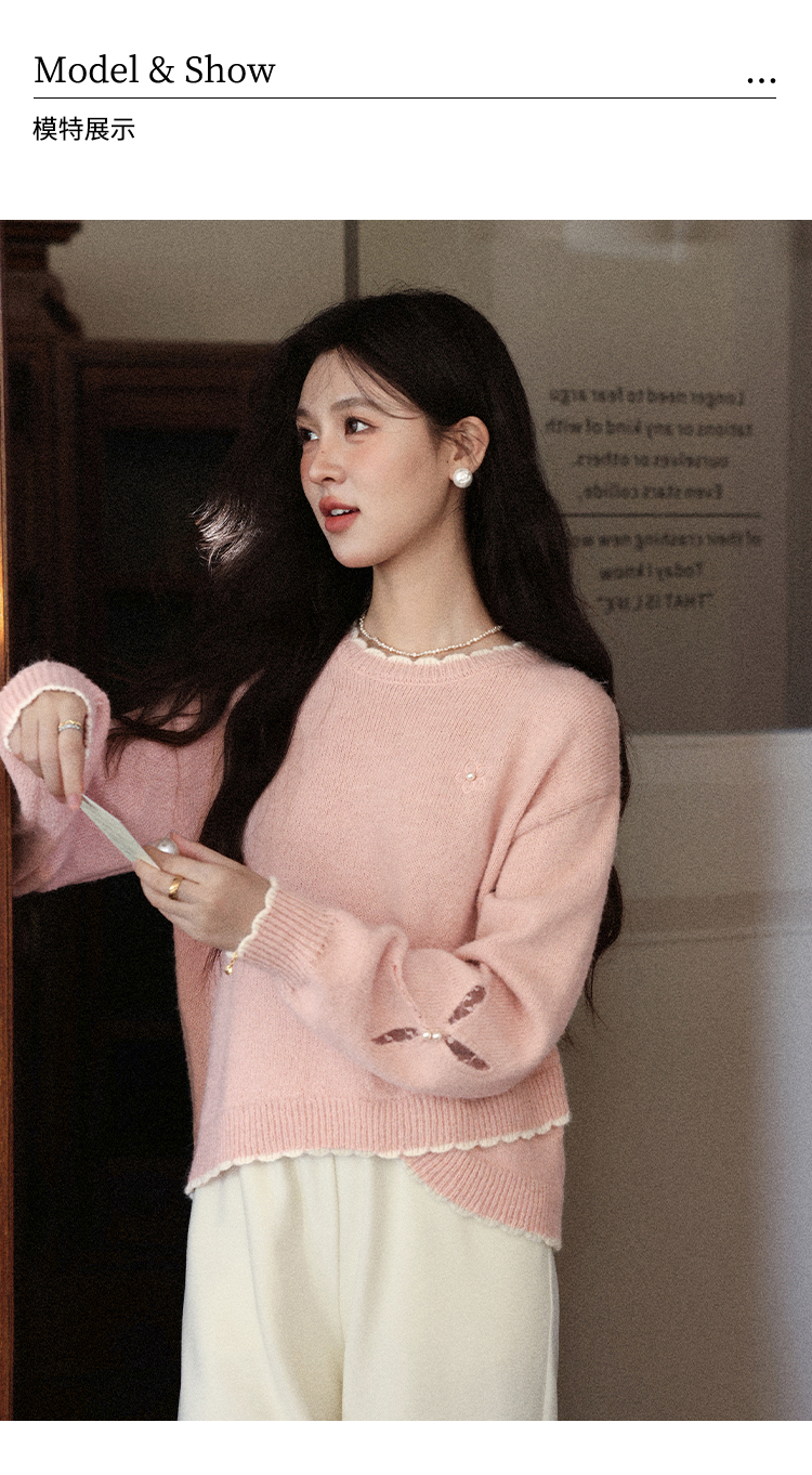 鹿向南「含花待放」粉红色圆领针织衫早秋新款设计感甜美上衣女款