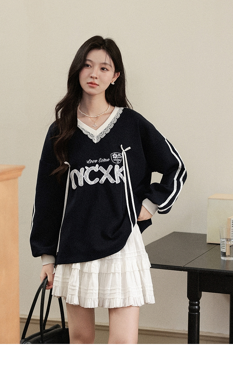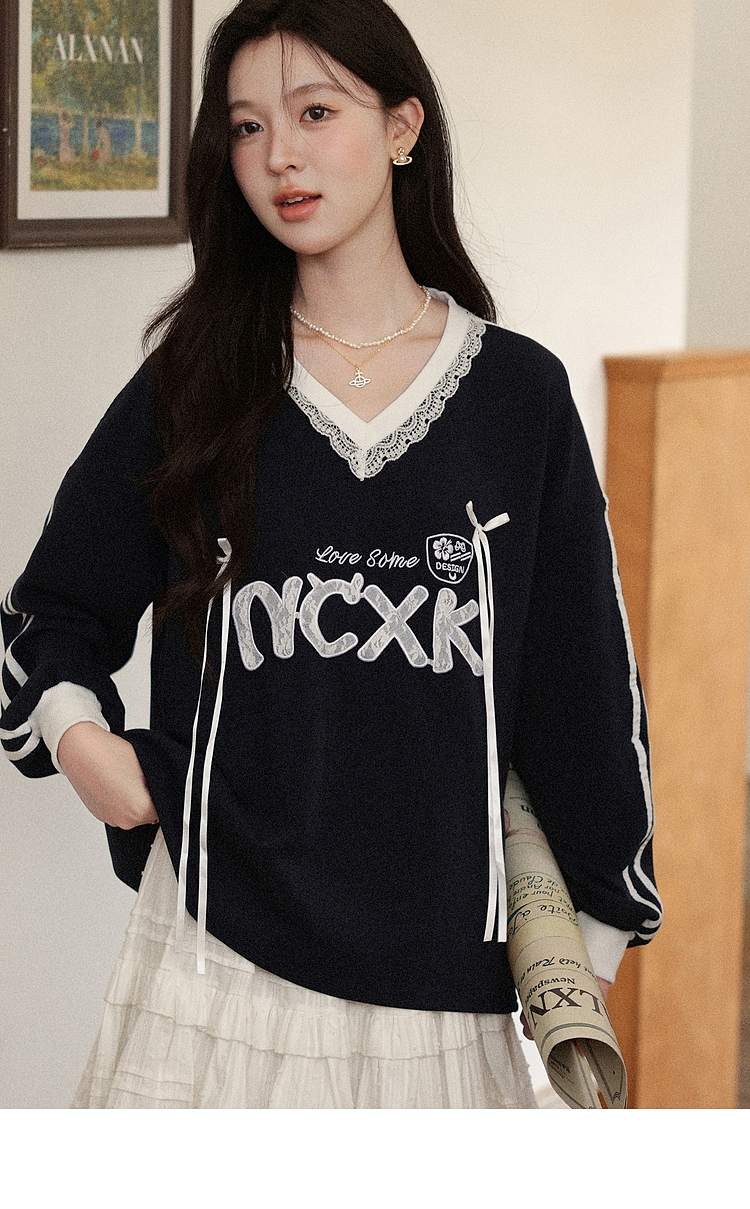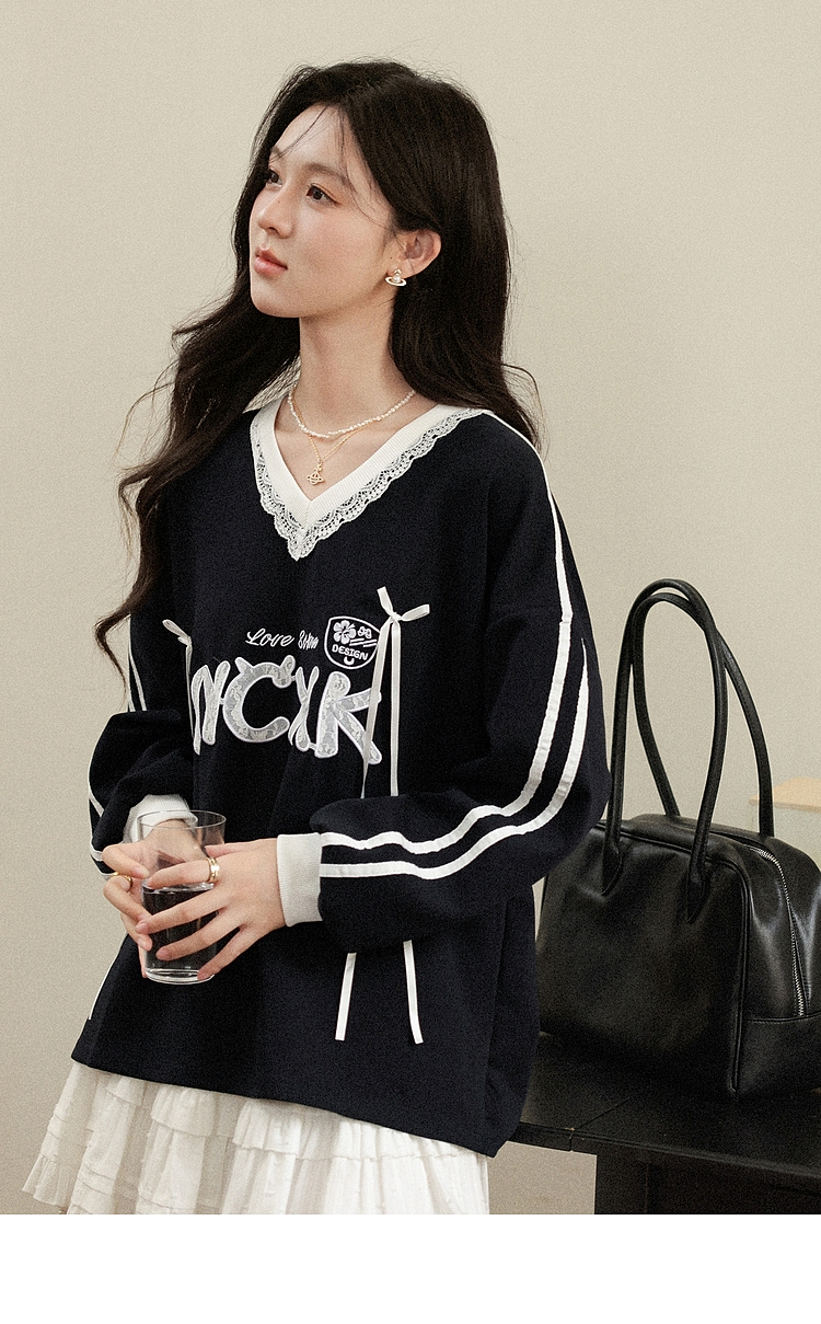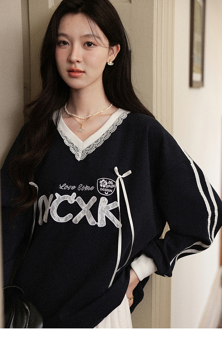 【65折秒杀】鹿向南「黑巧慕斯」V领长袖蕾丝卫衣女秋新款休闲宽松上衣女L57631