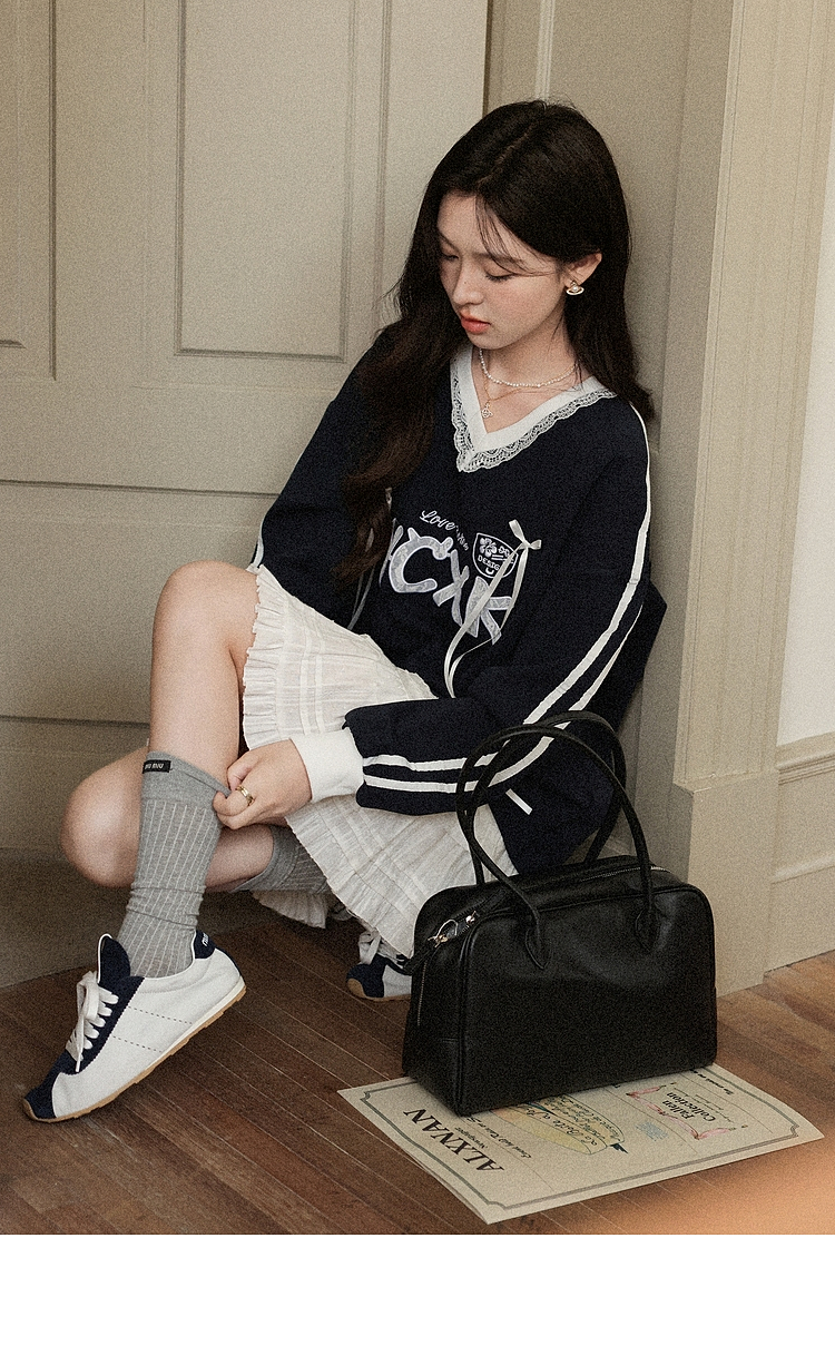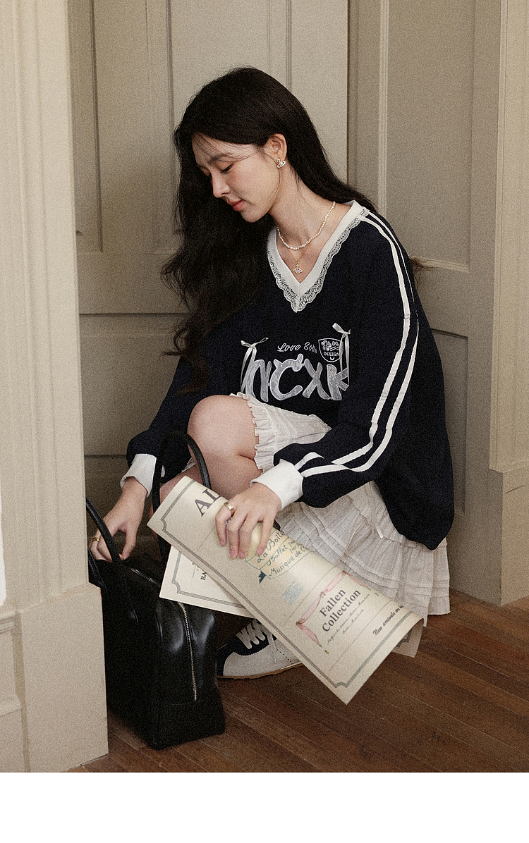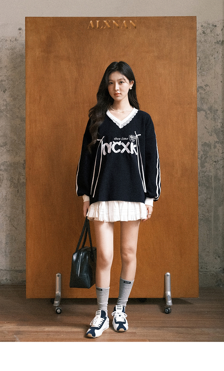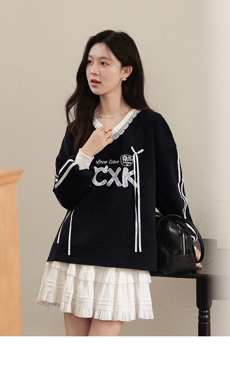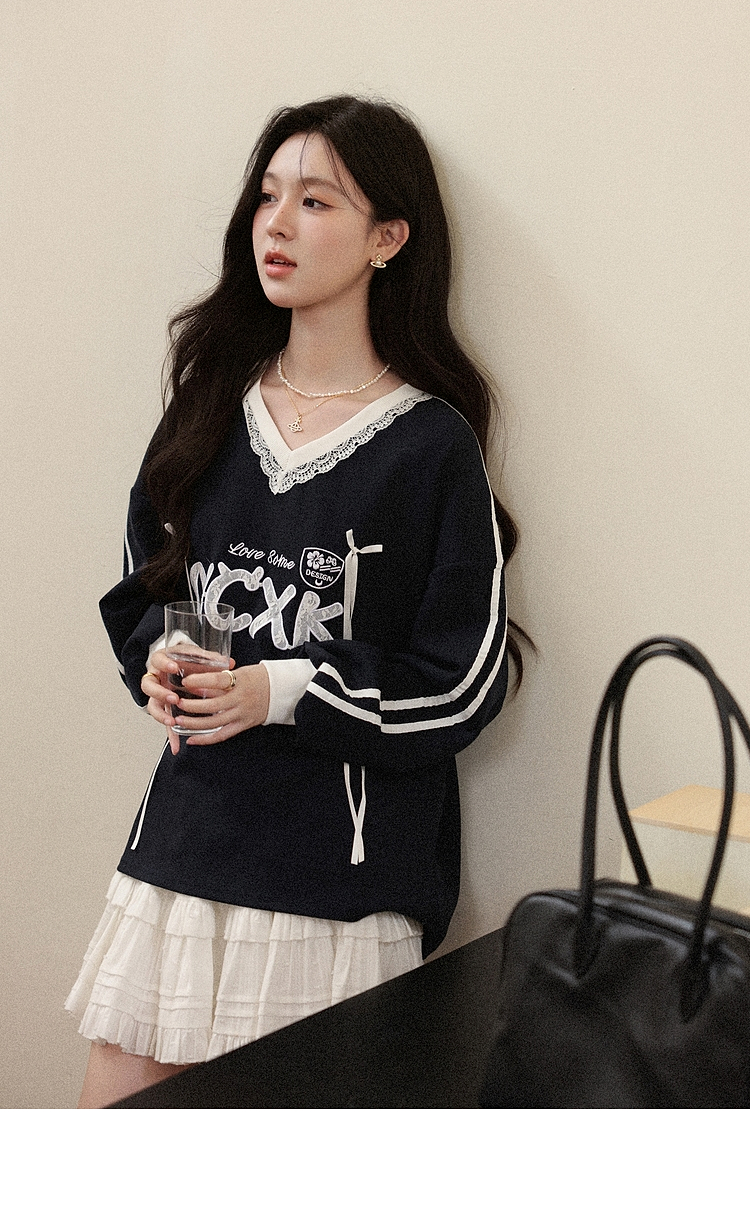 【65折秒杀】鹿向南「黑巧慕斯」V领长袖蕾丝卫衣女秋新款休闲宽松上衣女L57631