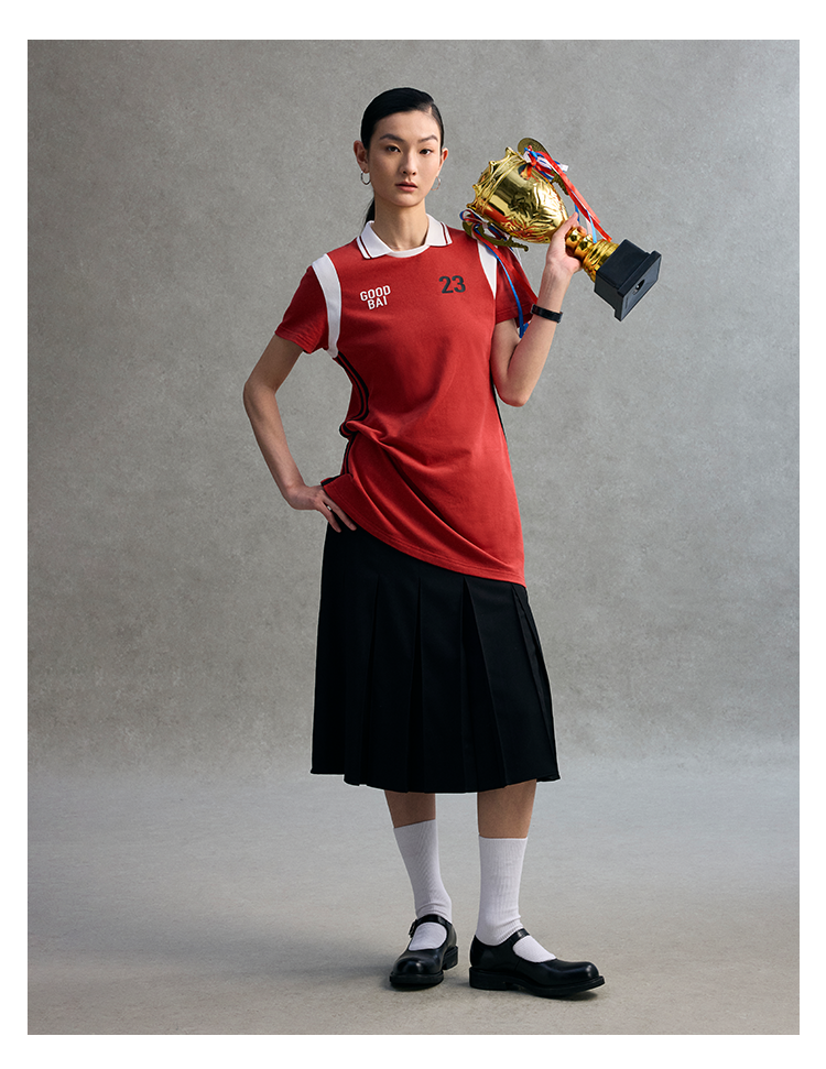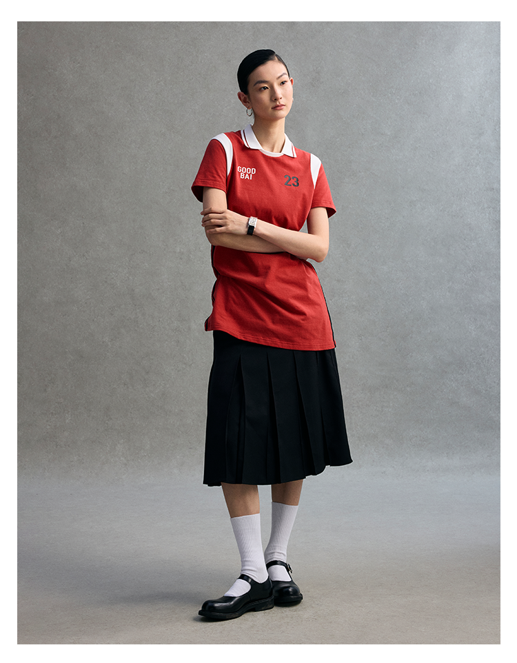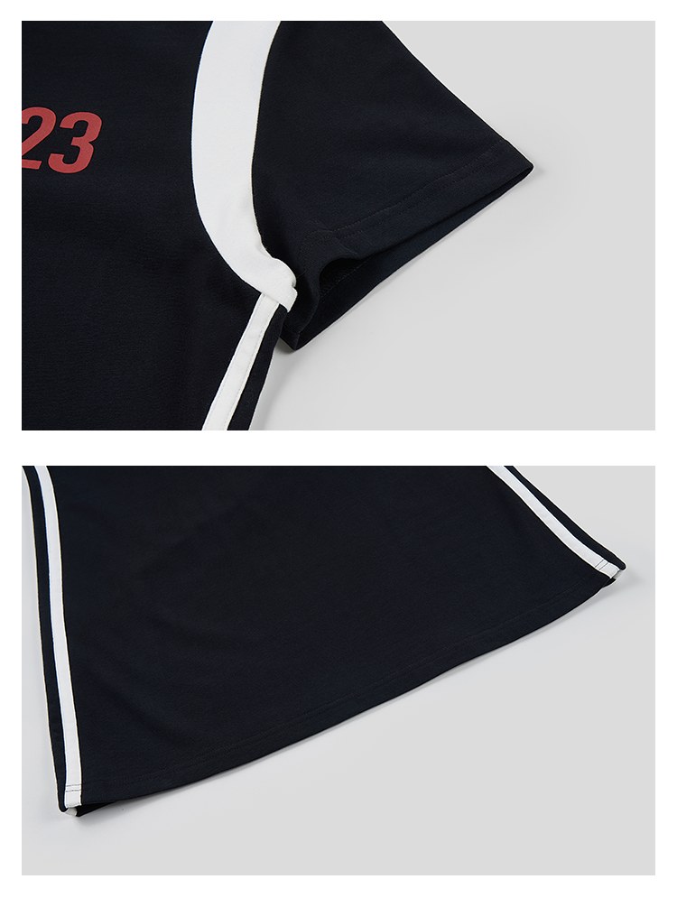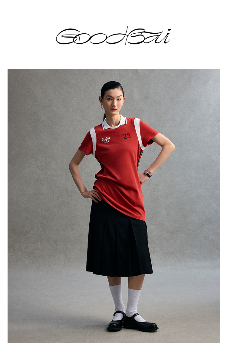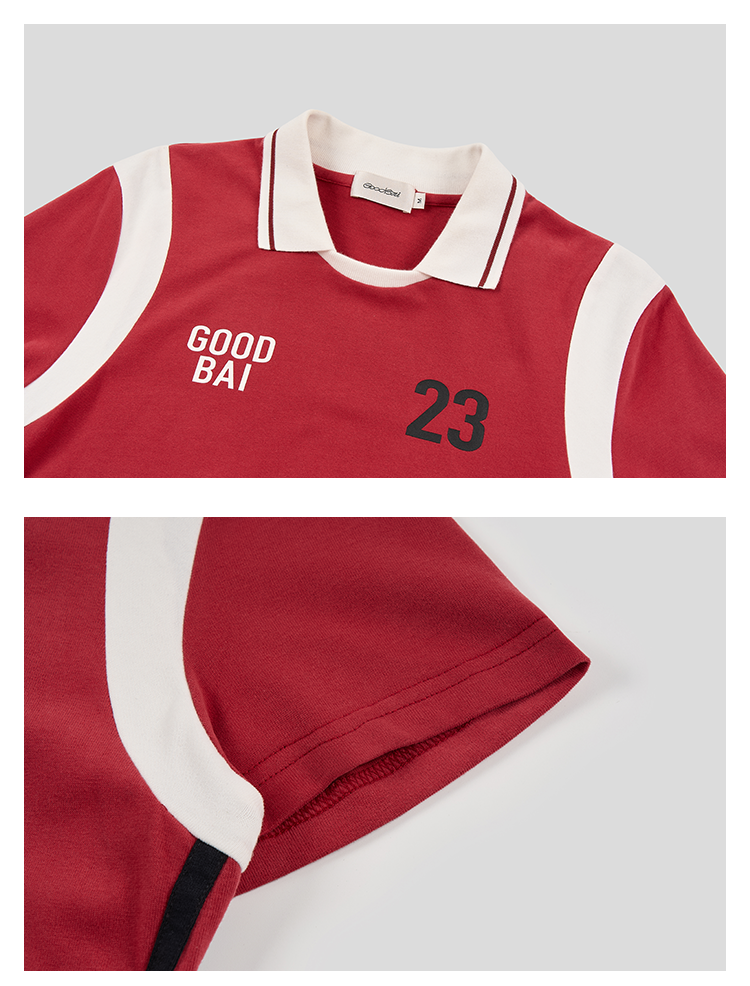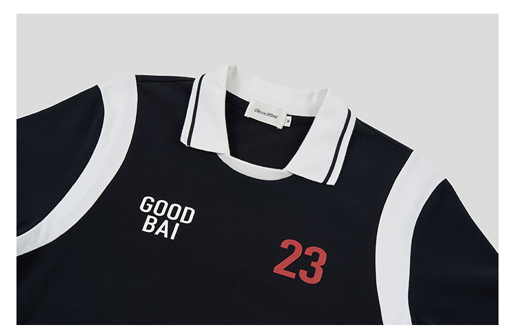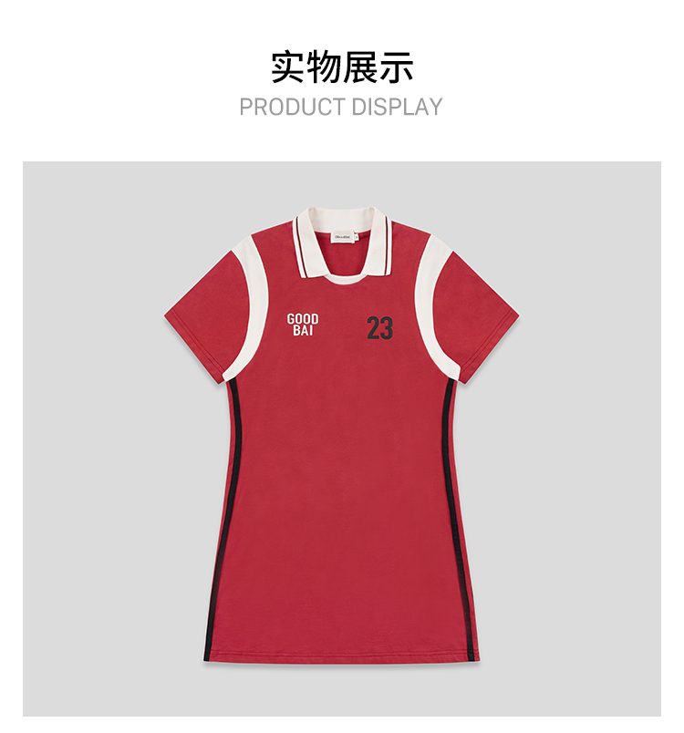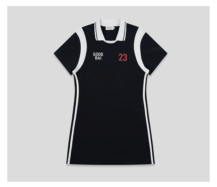 GOODBAI 粗体23logo印花翻领撞色插片织带短袖直筒连衣短裙
