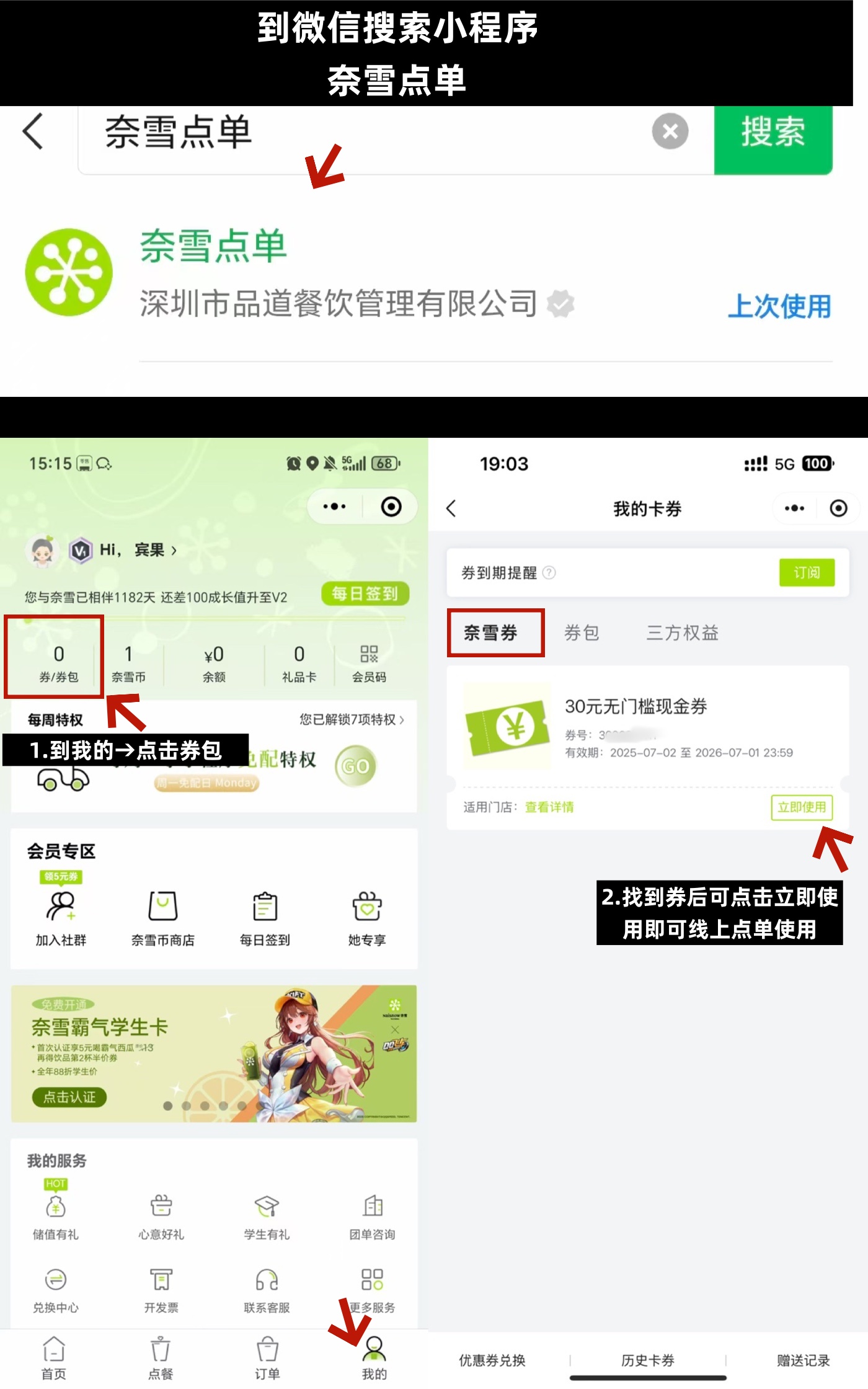2.适用场景:仅限奈雪线下门店出示会员码或【奈雪点单】小程序"自取" / "外卖" 使用,不适用于第三方外送服务。