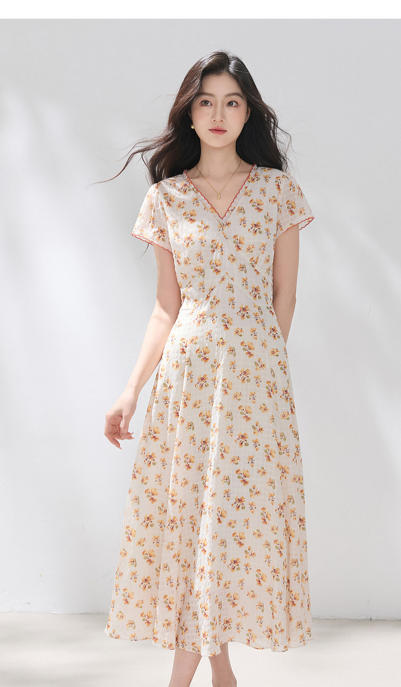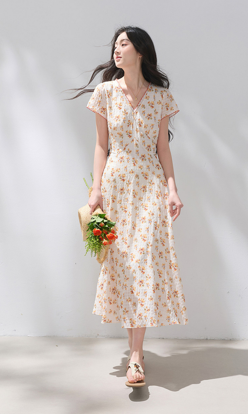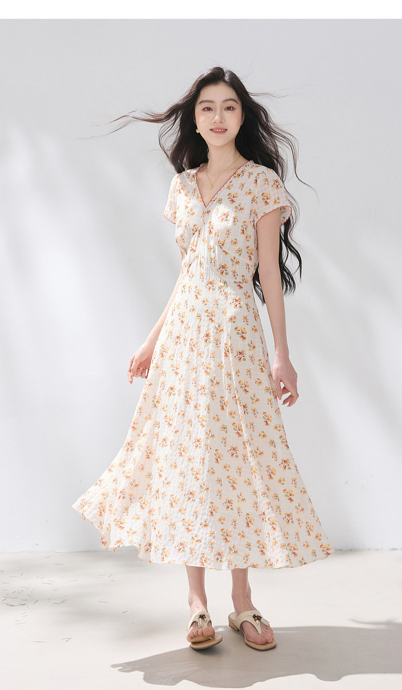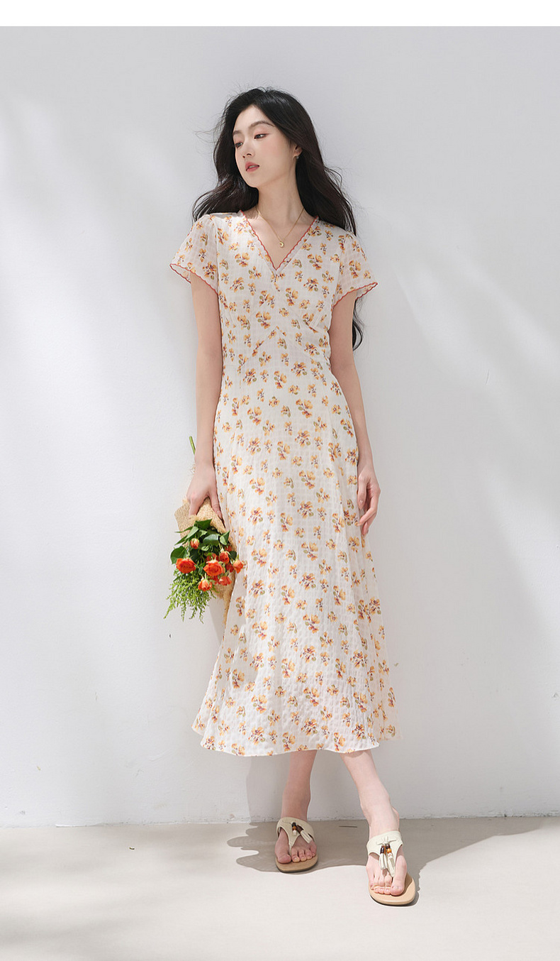 三彩2026夏季新款碎花连衣裙肌理感法式V领A字裙长裙M