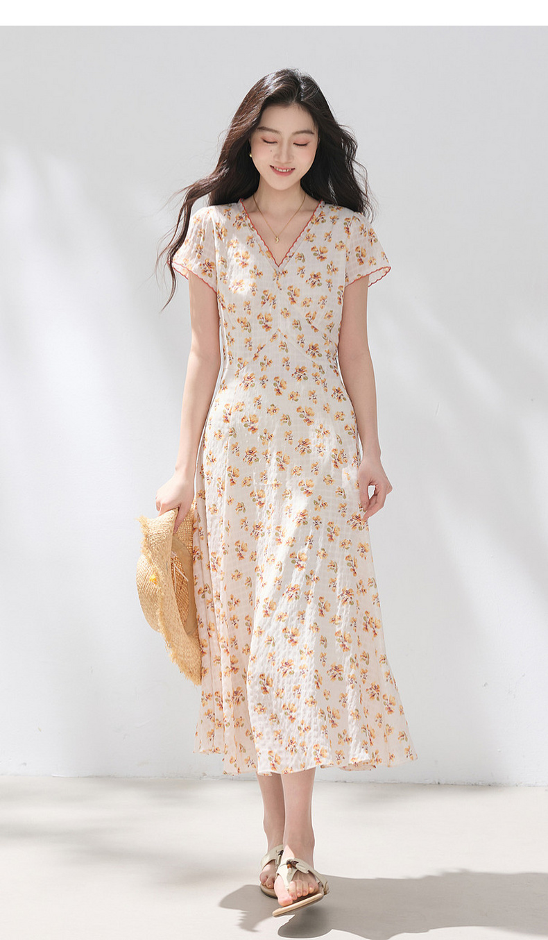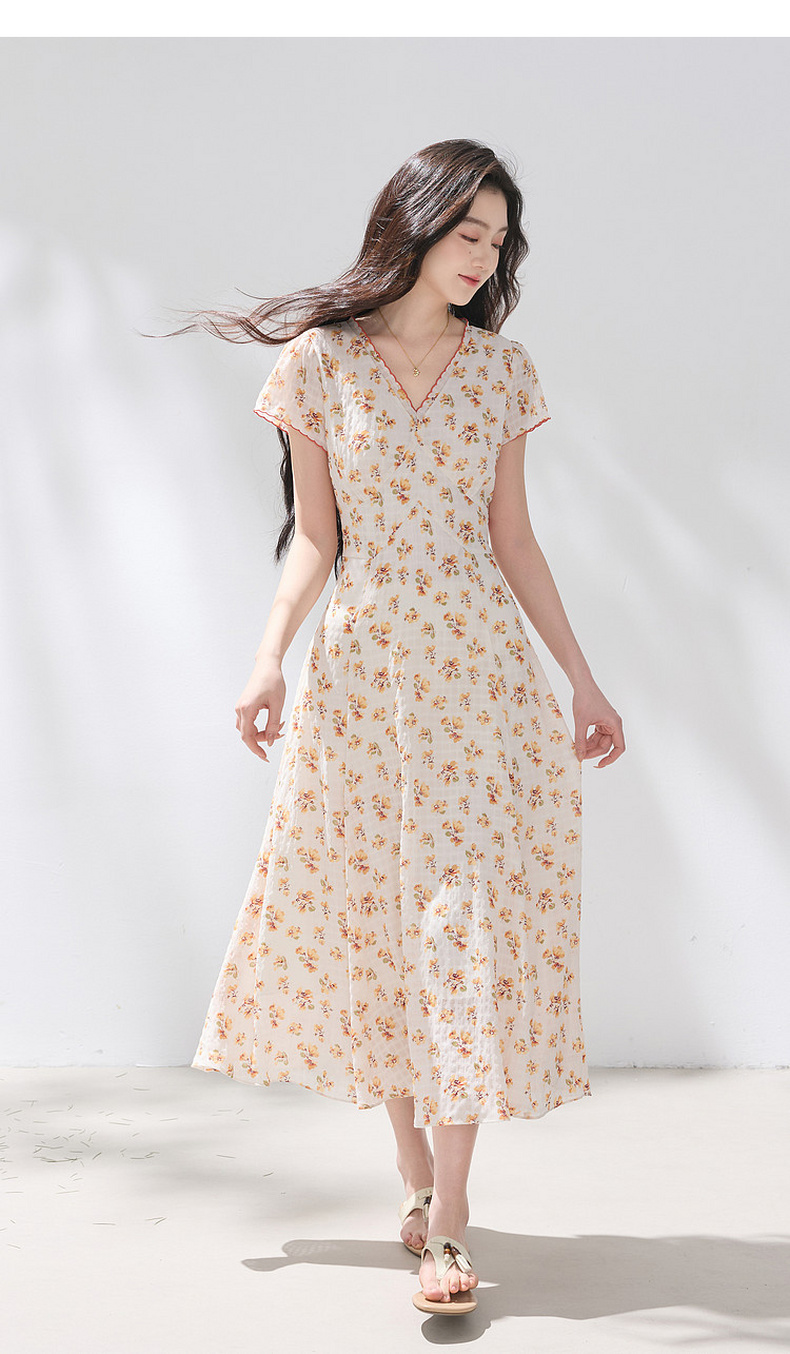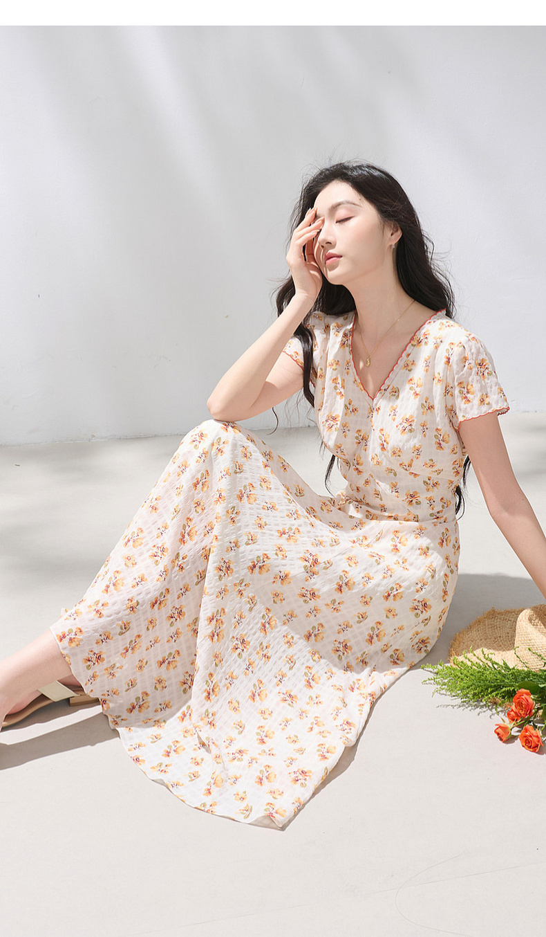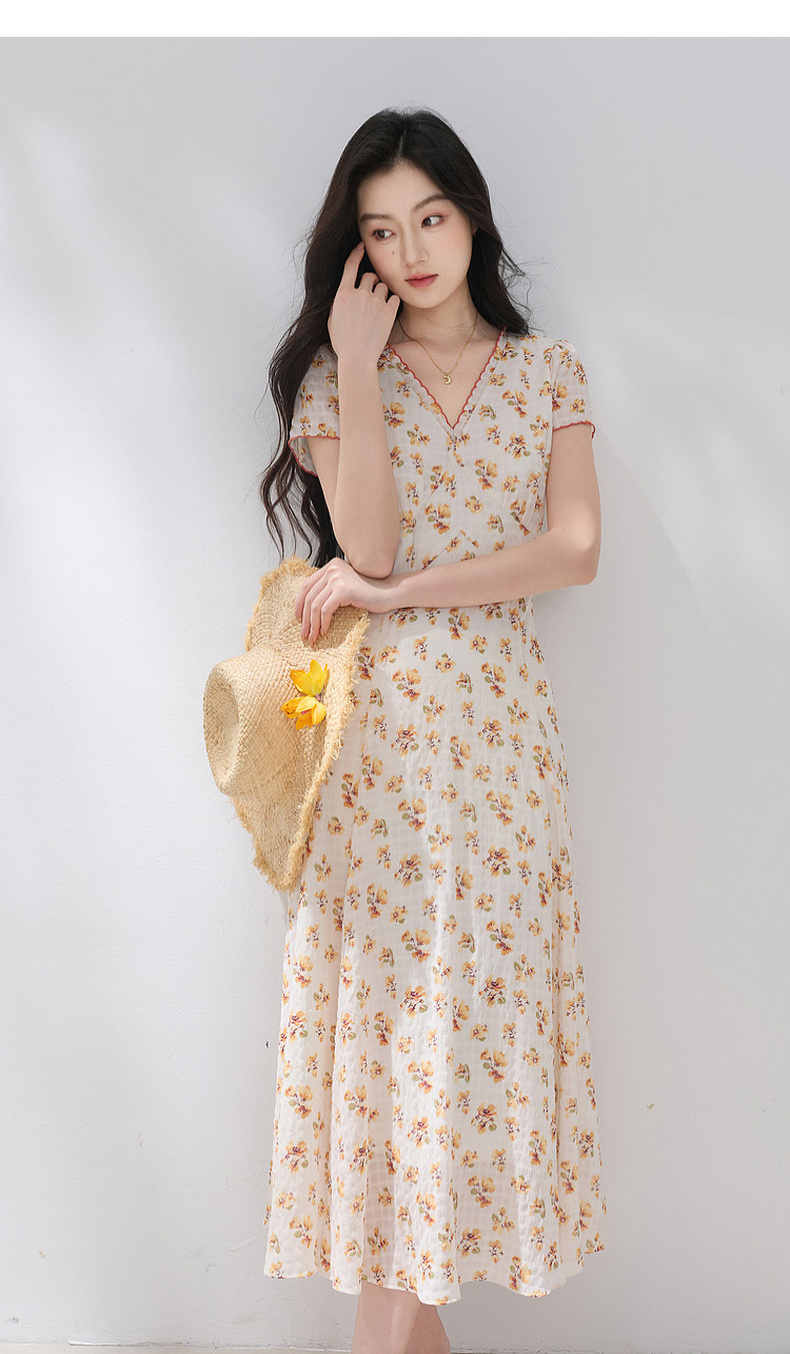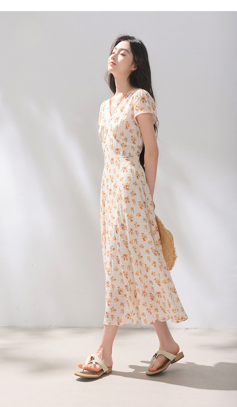 三彩2026夏季新款碎花连衣裙肌理感法式V领A字裙长裙M
