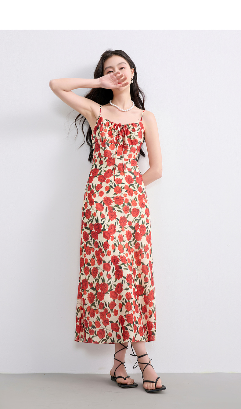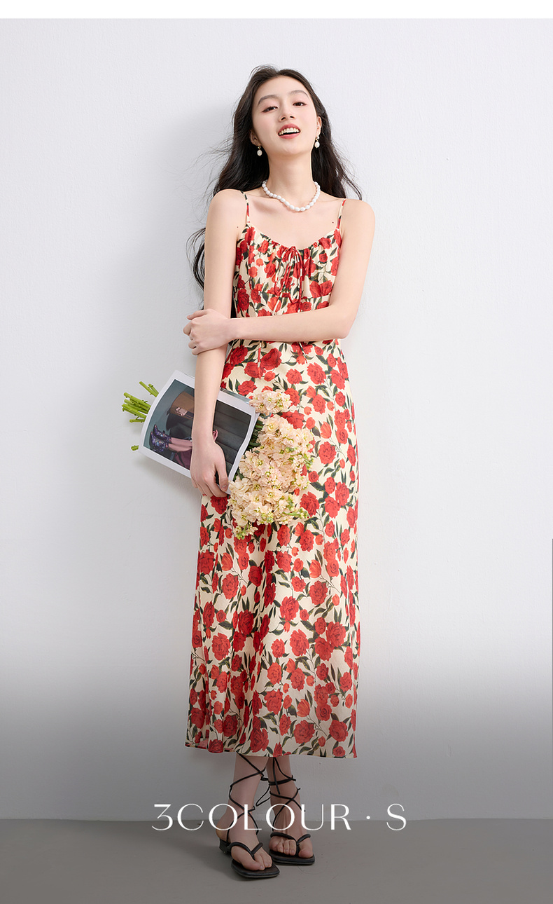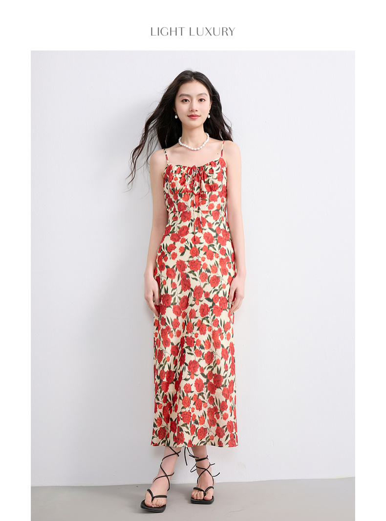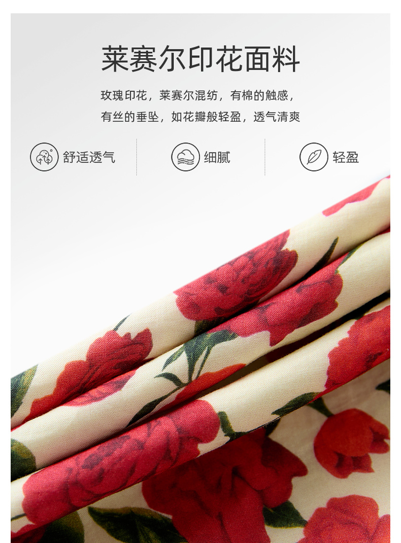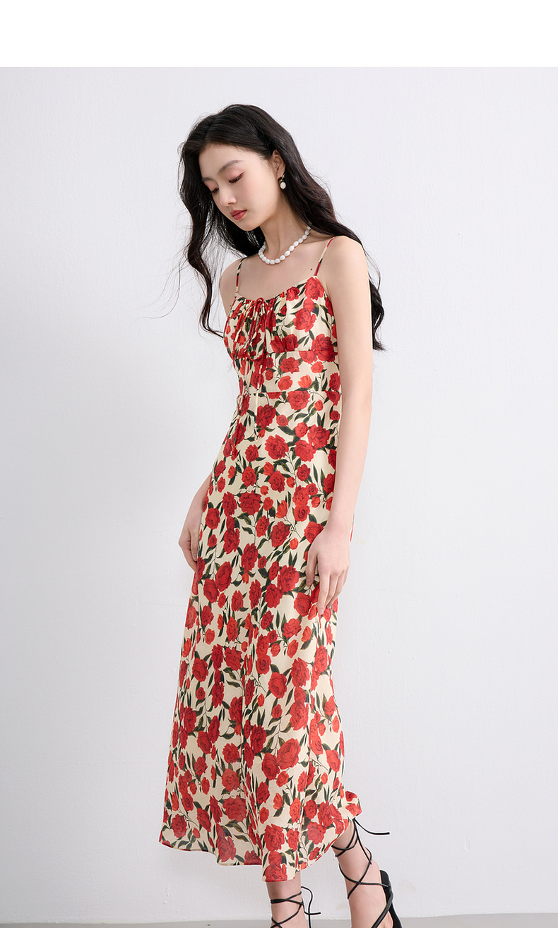 三彩2025夏季新款法式莱赛尔碎花连衣裙一字领吊带裙长裙优雅S