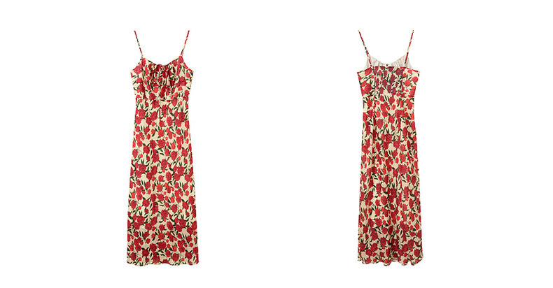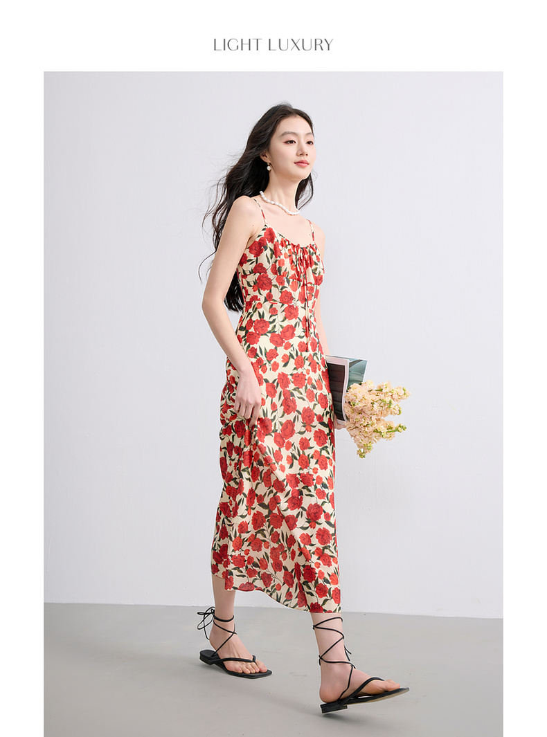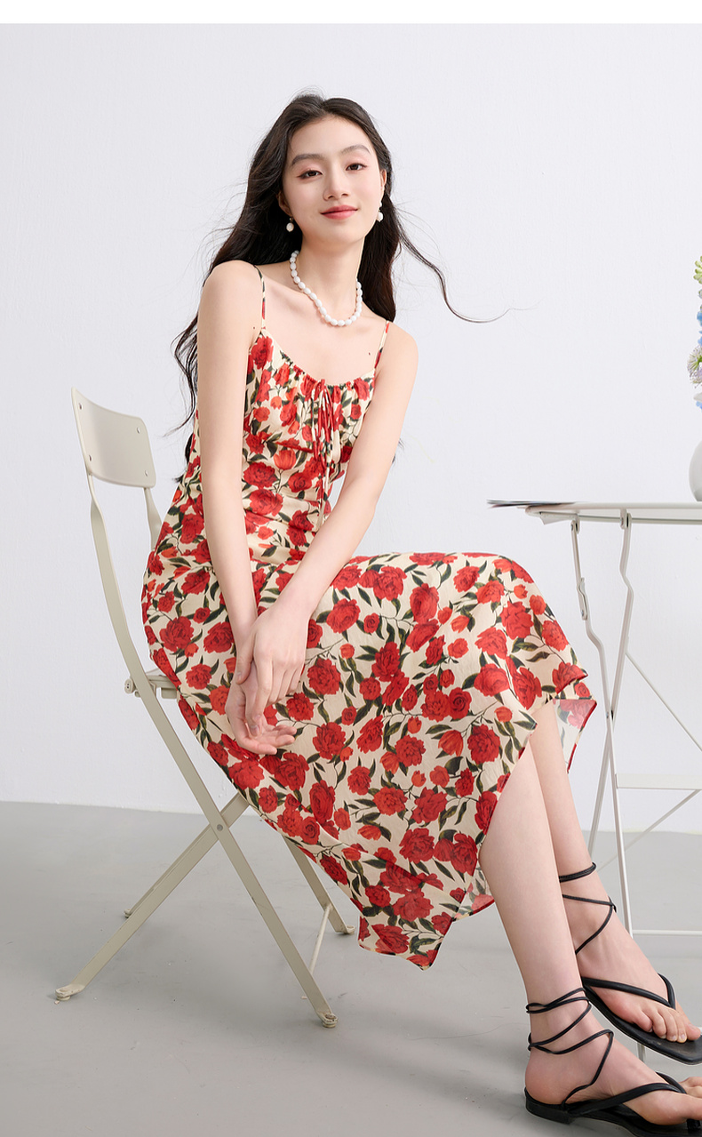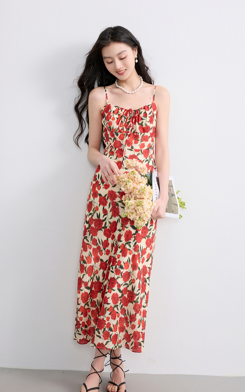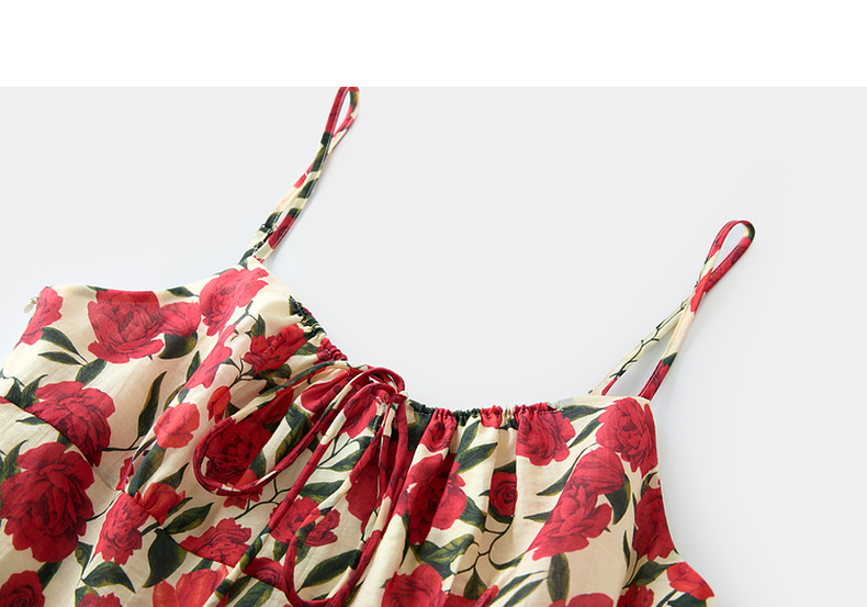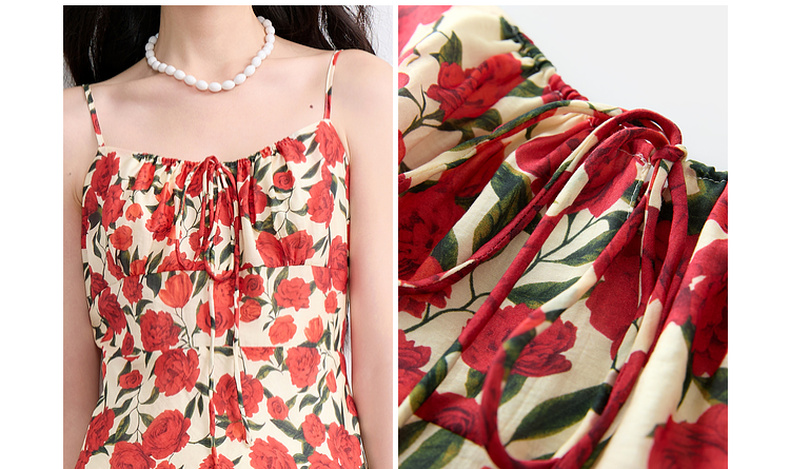 三彩2025夏季新款法式莱赛尔碎花连衣裙一字领吊带裙长裙优雅S