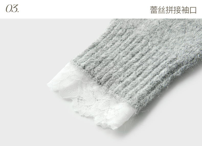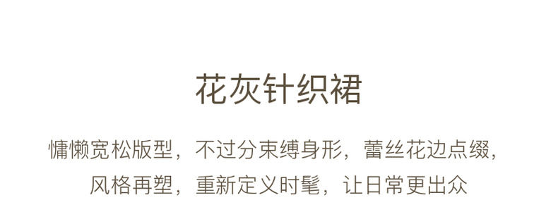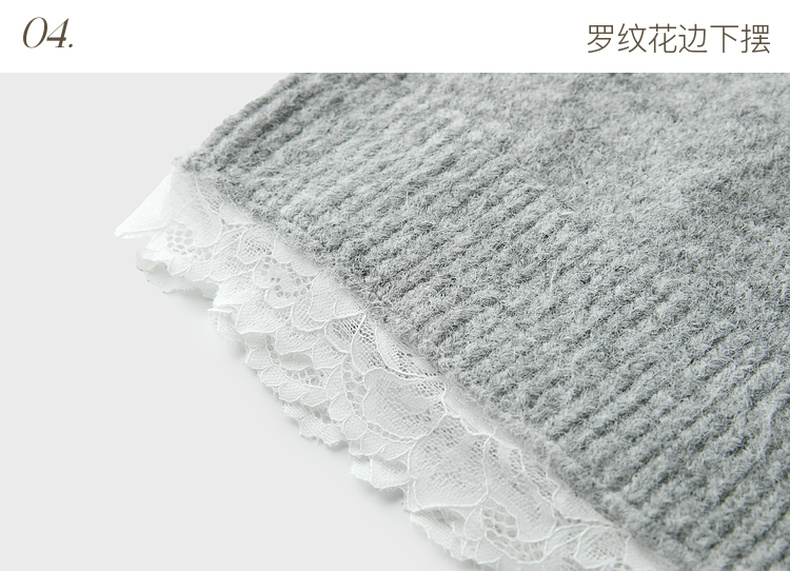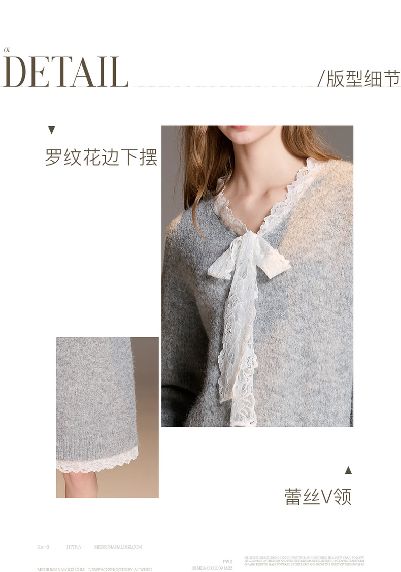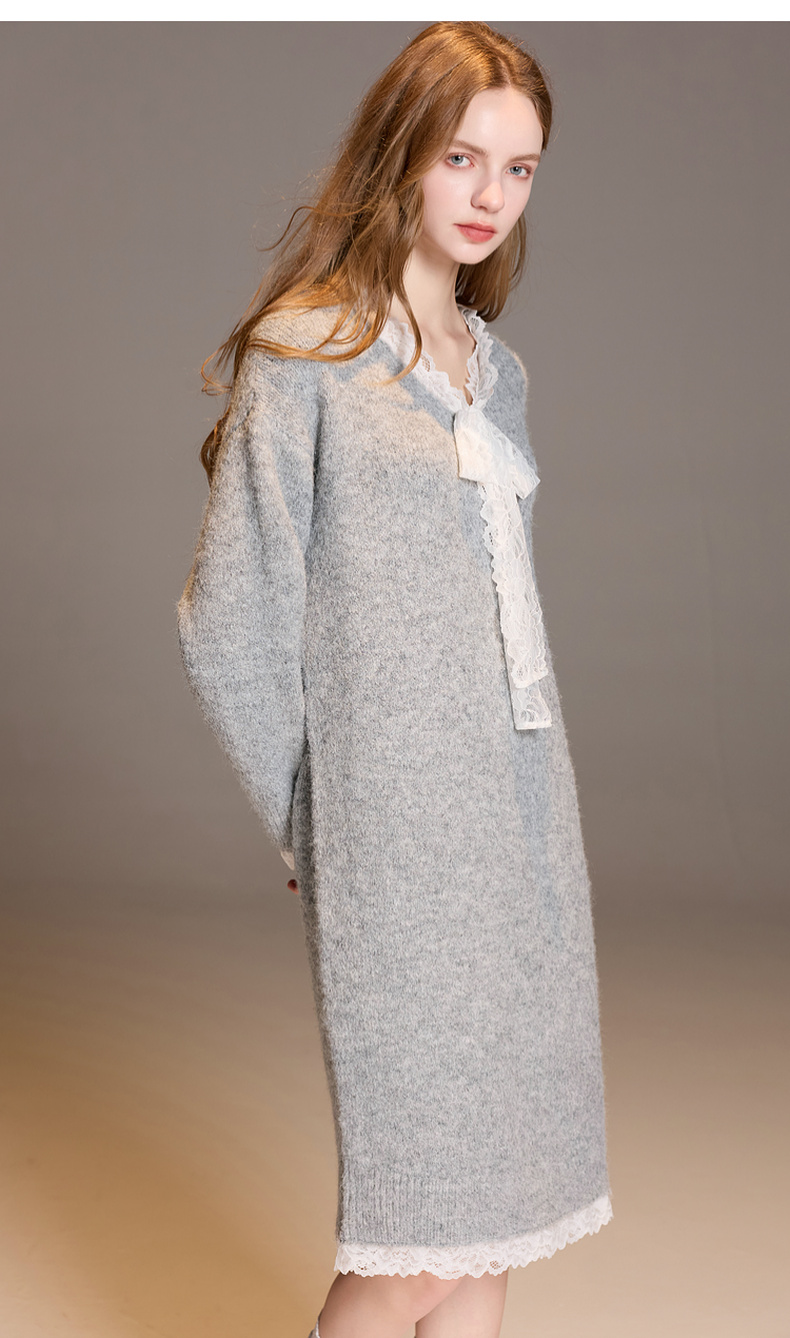 三彩2025冬季新款蕾丝V领针织连衣裙长袖直筒宽松慵懒气质M