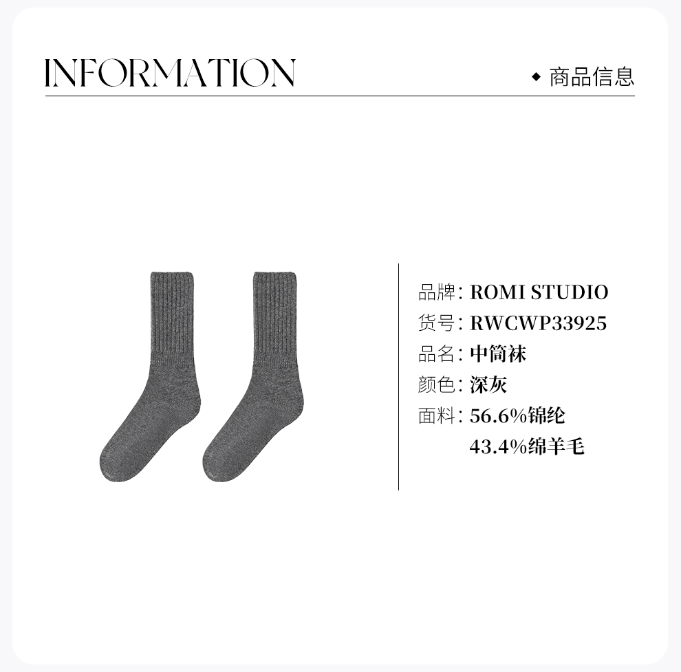 ROMI STUDIO“随手穿”灰色绵羊毛锁温保暖舒适中筒袜子RWCWP33925