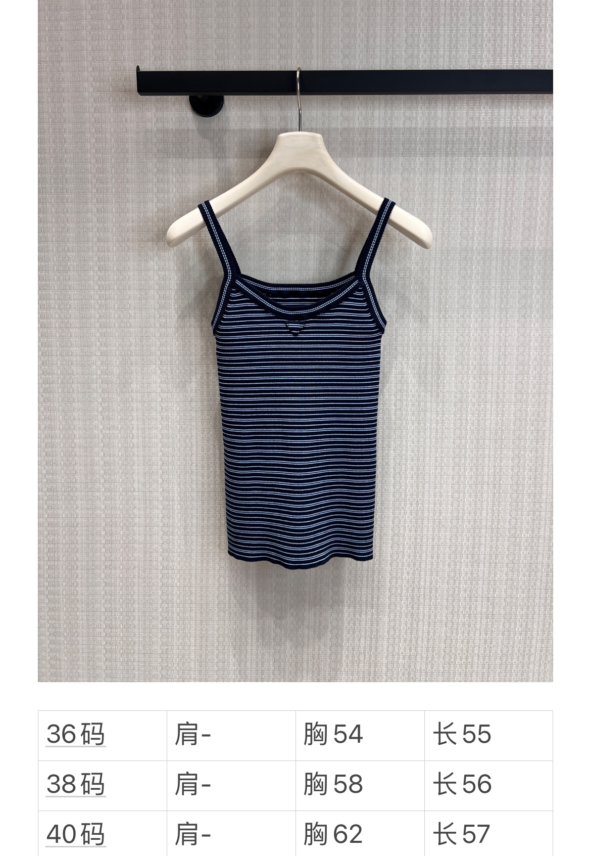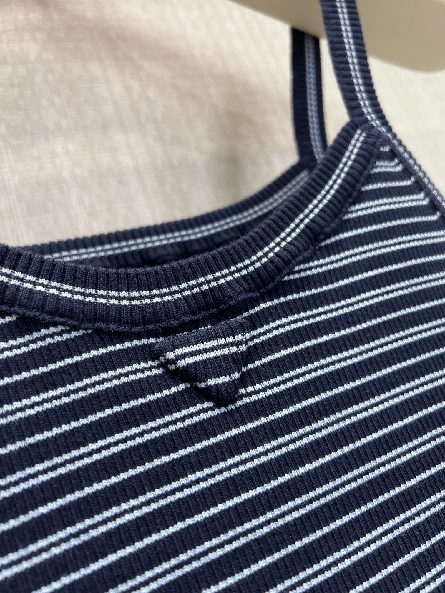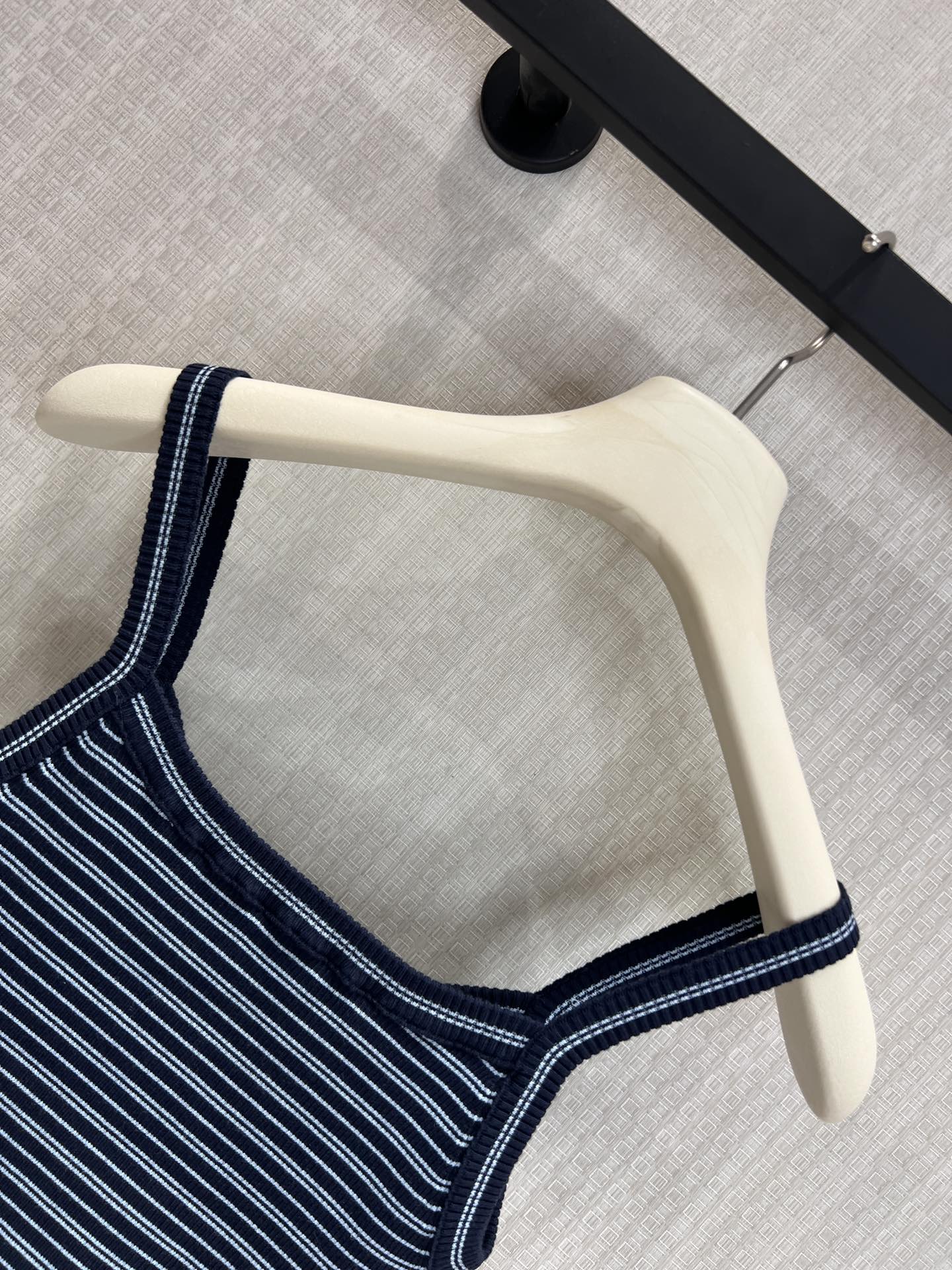 Pra* 26Ss春夏新款 蓝黑细条纹针织吊带小背心丨⚠独家yb开发!顶级高版出品!以经典海军蓝与细白条纹交织,复刻复古学院感。罗纹针织肌理自带弹力,贴合身形却不紧绷,勾勒利落肩颈线条;标志性倒三角徽标低调点缀胸前,是辨识度与高级感的无声表达。细肩带设计适配叠穿西装、衬衫,也可单穿搭配牛仔或工装裤,从日常通勤到周末出街都能轻松驾驭,是衣橱里永不过时的百搭基础款。现货发售S/M/L
