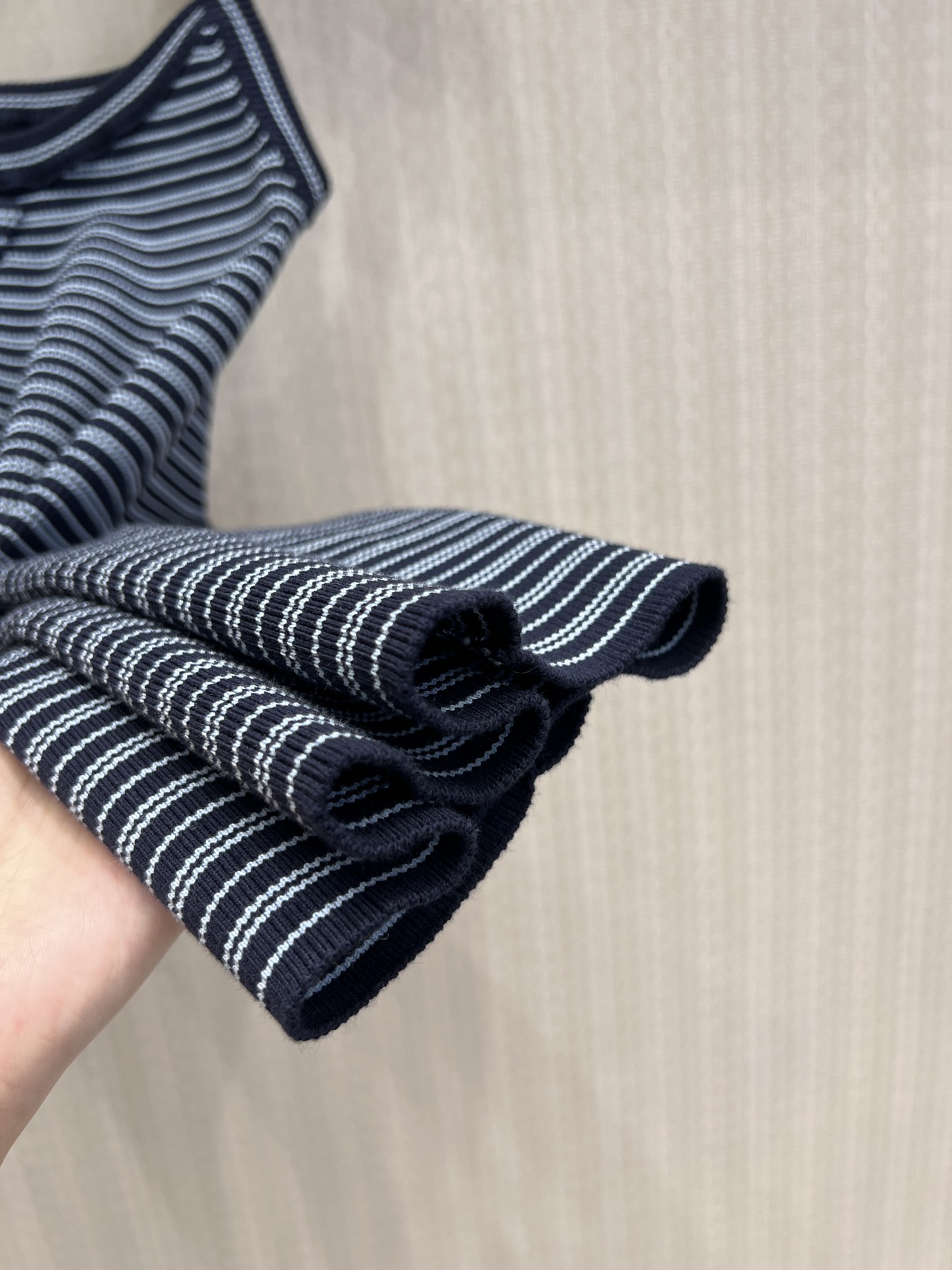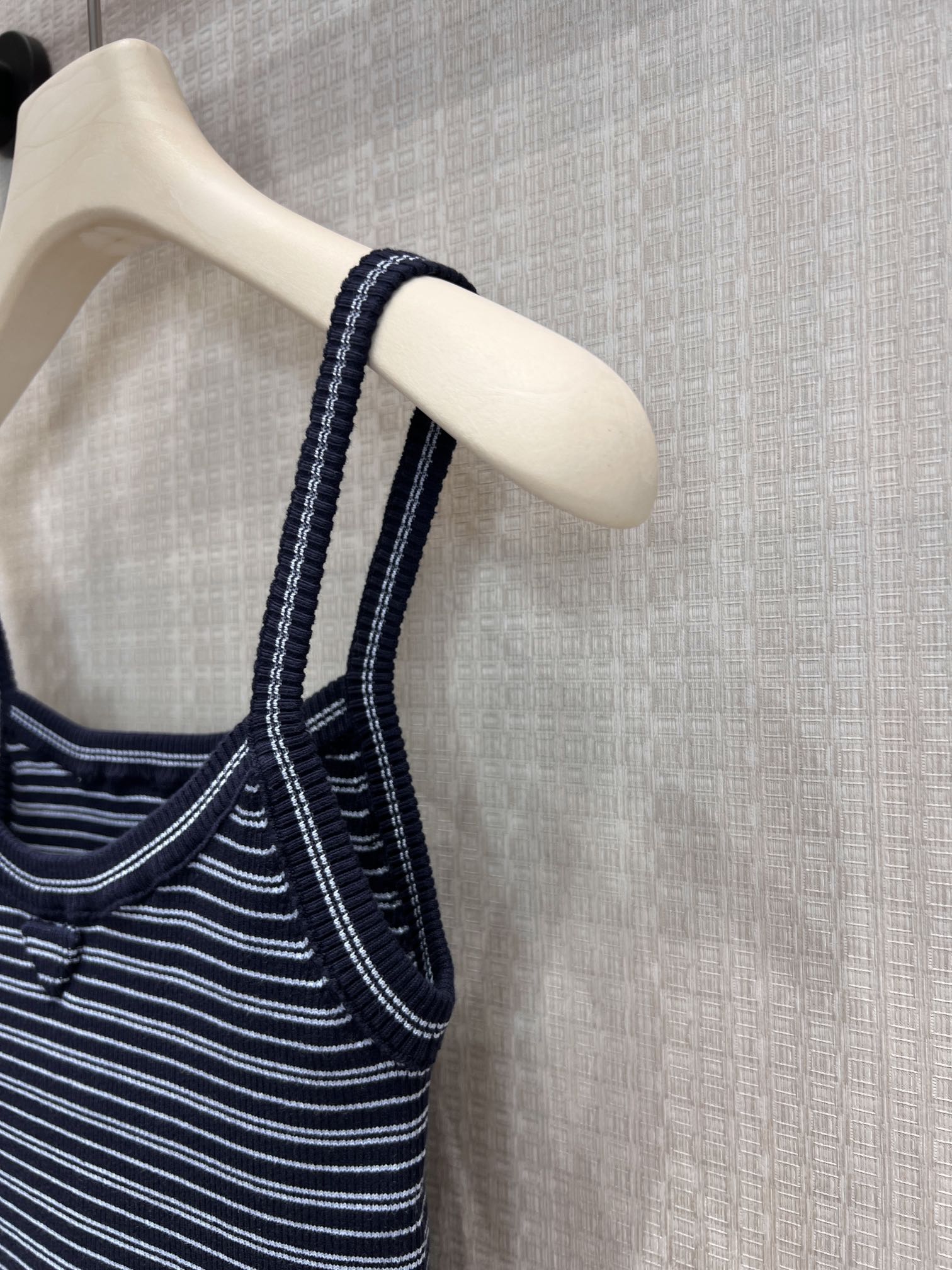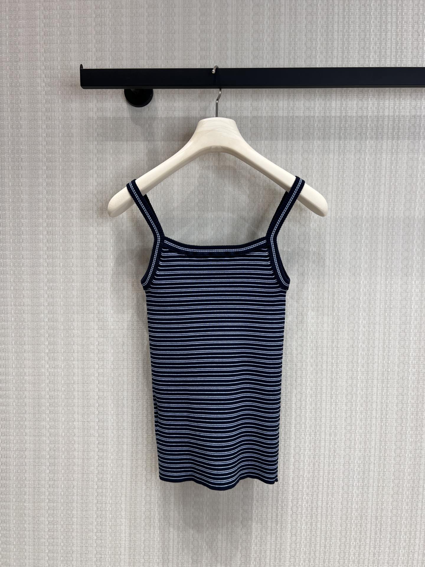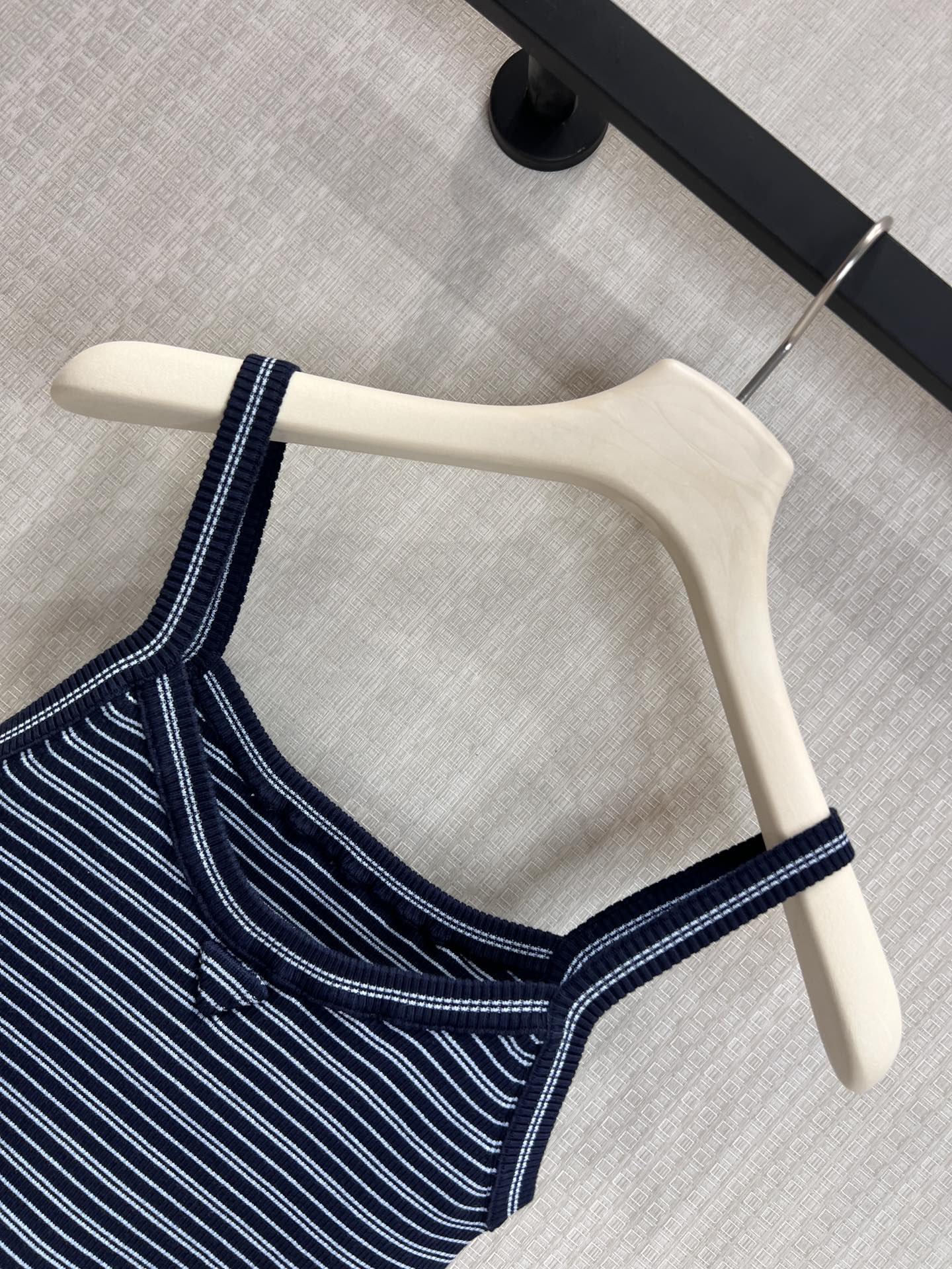 Pra* 26Ss春夏新款 蓝黑细条纹针织吊带小背心丨⚠独家yb开发!顶级高版出品!以经典海军蓝与细白条纹交织,复刻复古学院感。罗纹针织肌理自带弹力,贴合身形却不紧绷,勾勒利落肩颈线条;标志性倒三角徽标低调点缀胸前,是辨识度与高级感的无声表达。细肩带设计适配叠穿西装、衬衫,也可单穿搭配牛仔或工装裤,从日常通勤到周末出街都能轻松驾驭,是衣橱里永不过时的百搭基础款。现货发售S/M/L