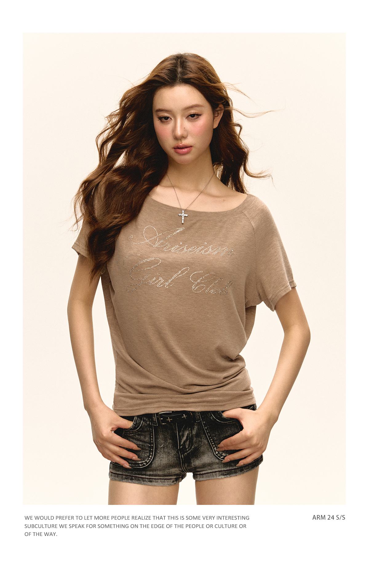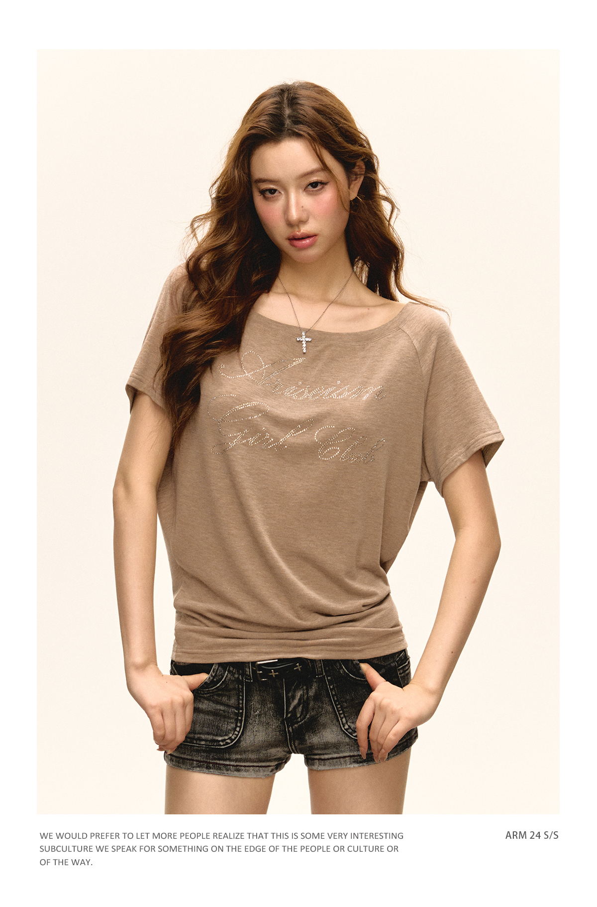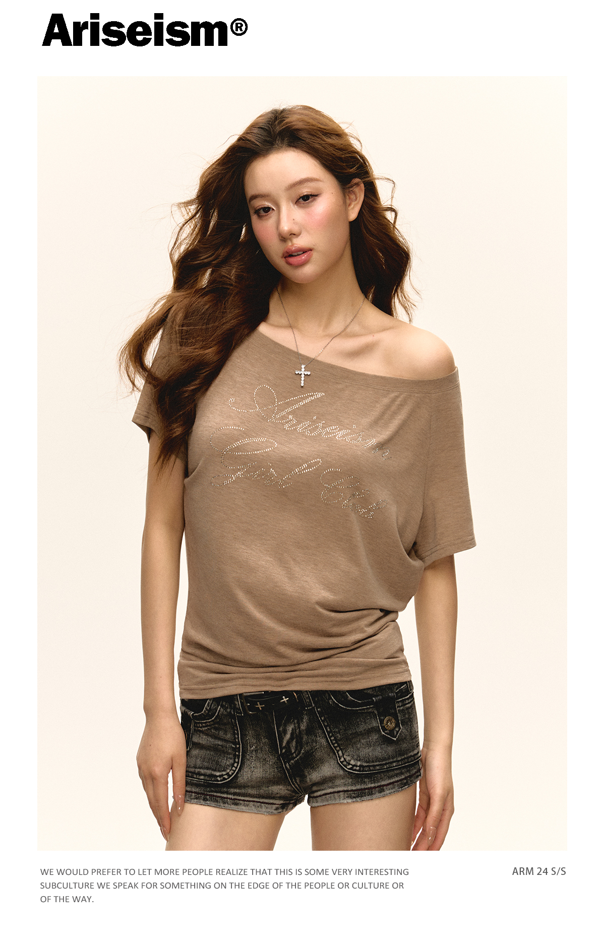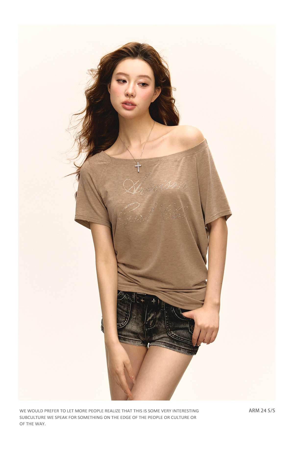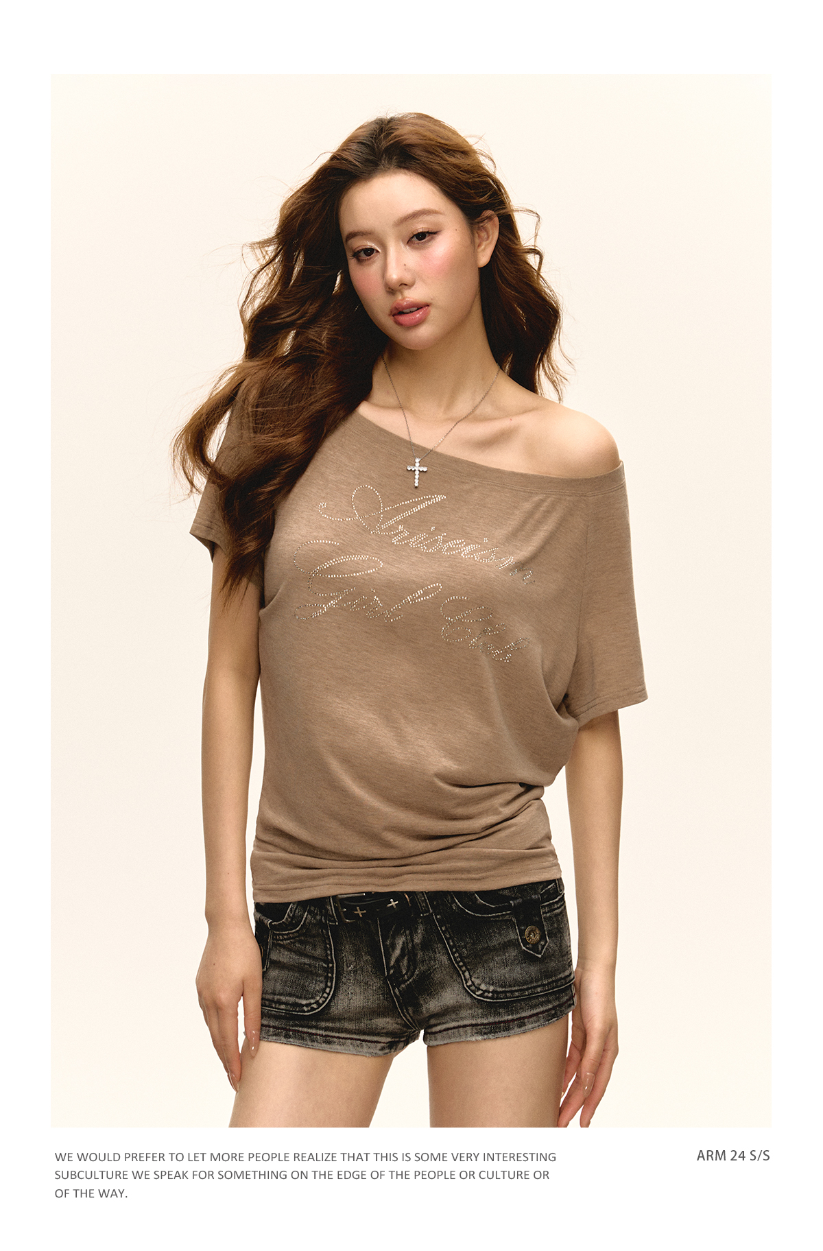 Ariseism 美式复古斜肩短袖T恤女2025夏季新款辣妹宽松上衣