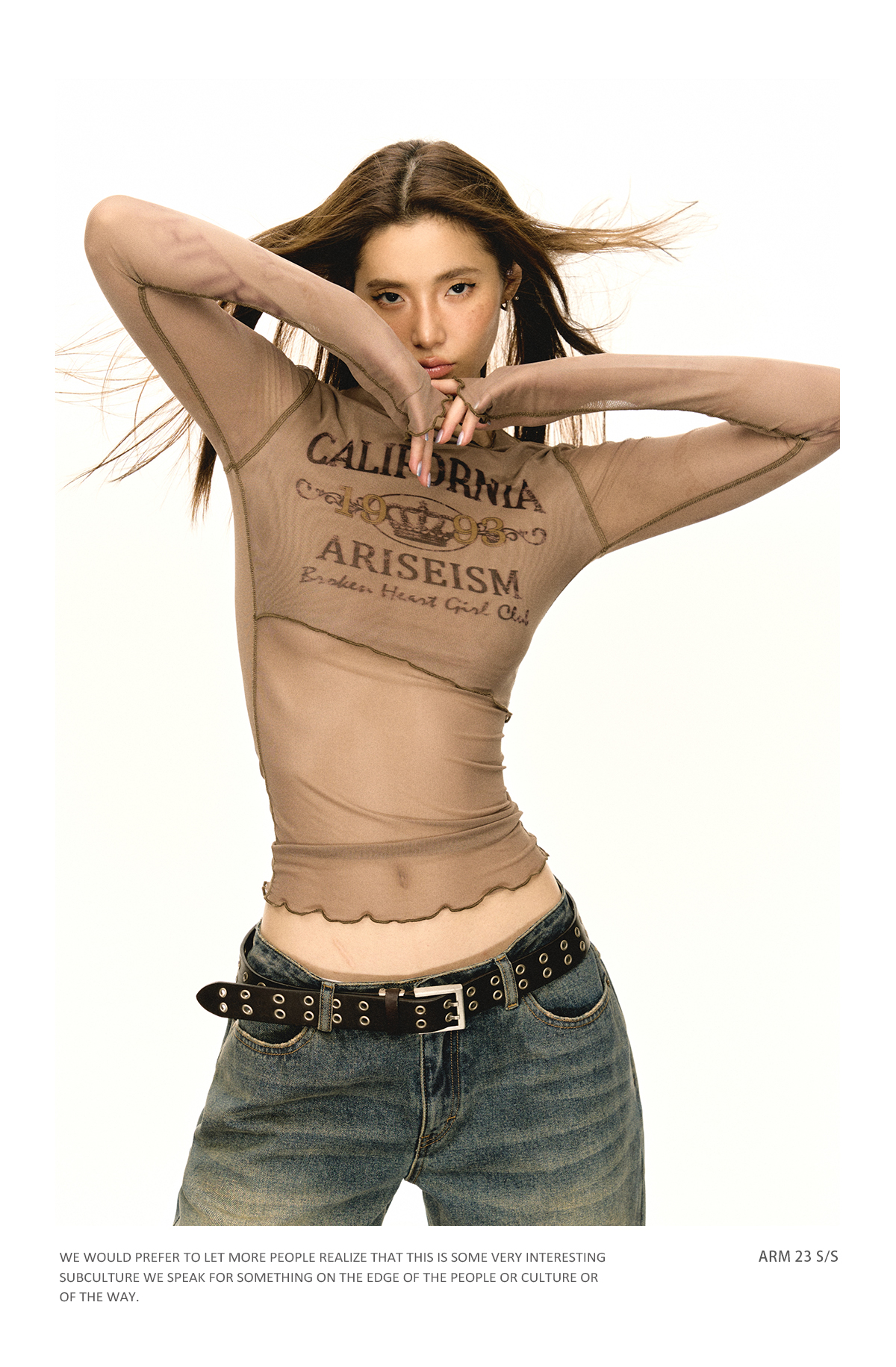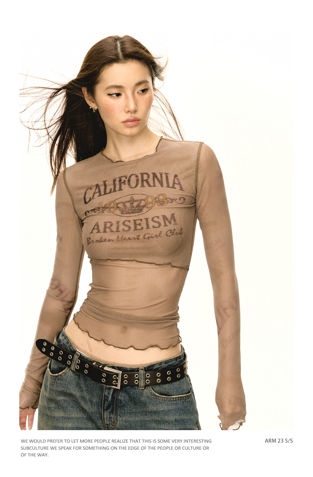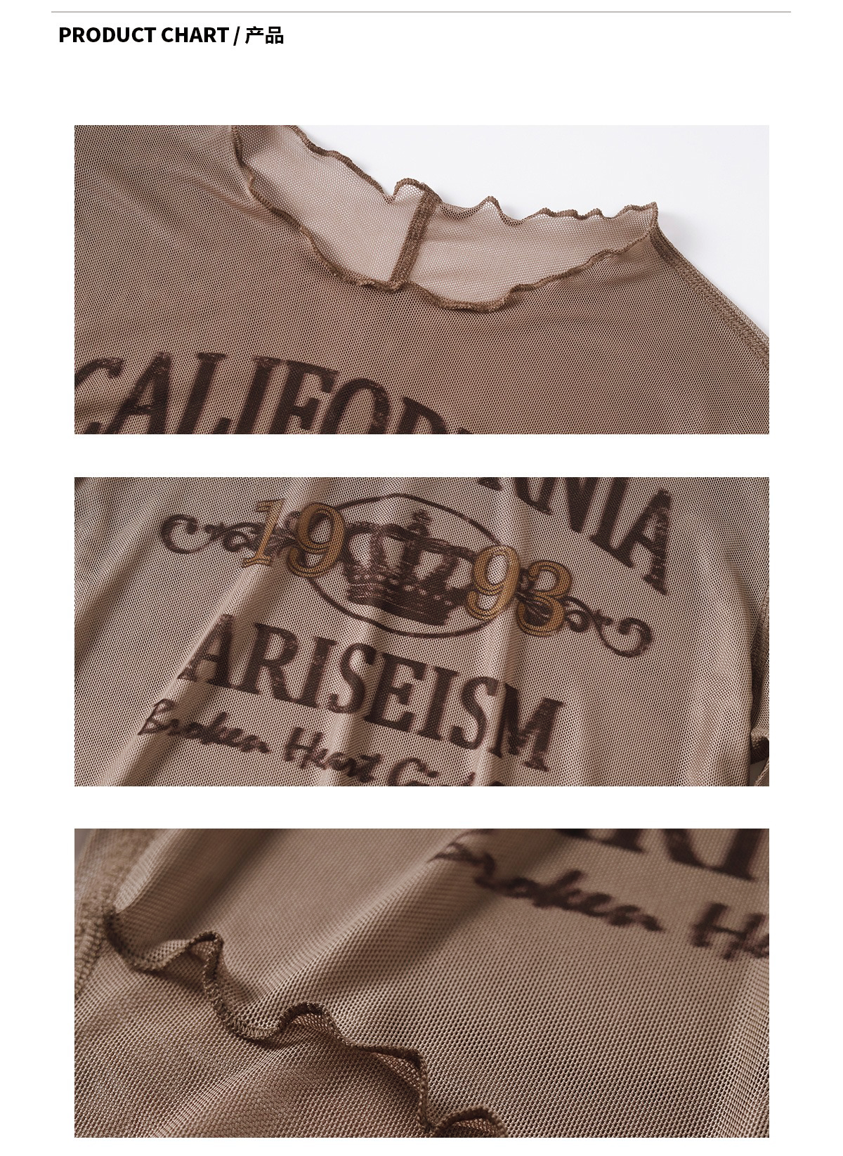 Ariseism 美式复古辣妹网纱长袖t恤女秋季新款紧身上衣内搭打底衫