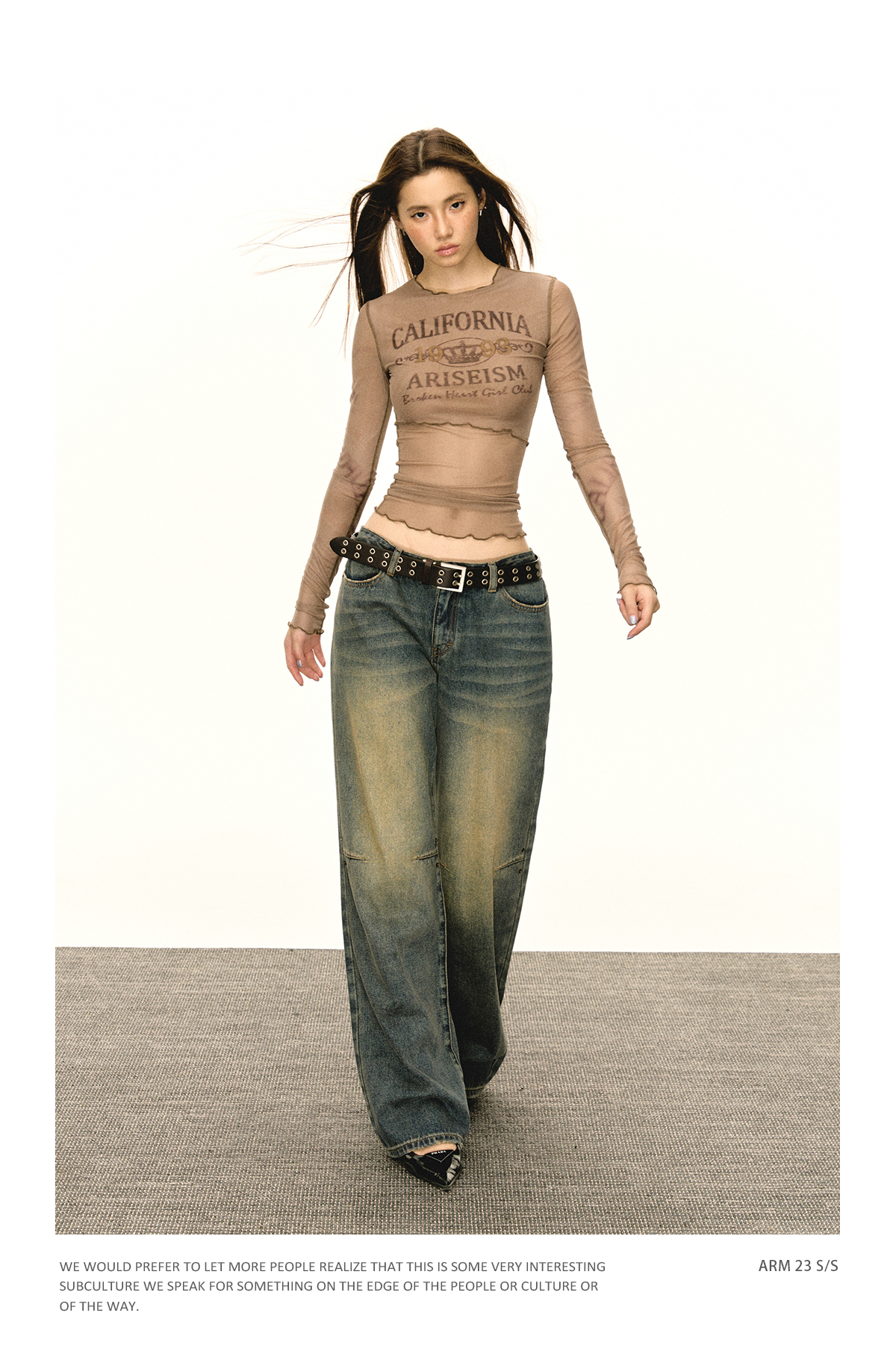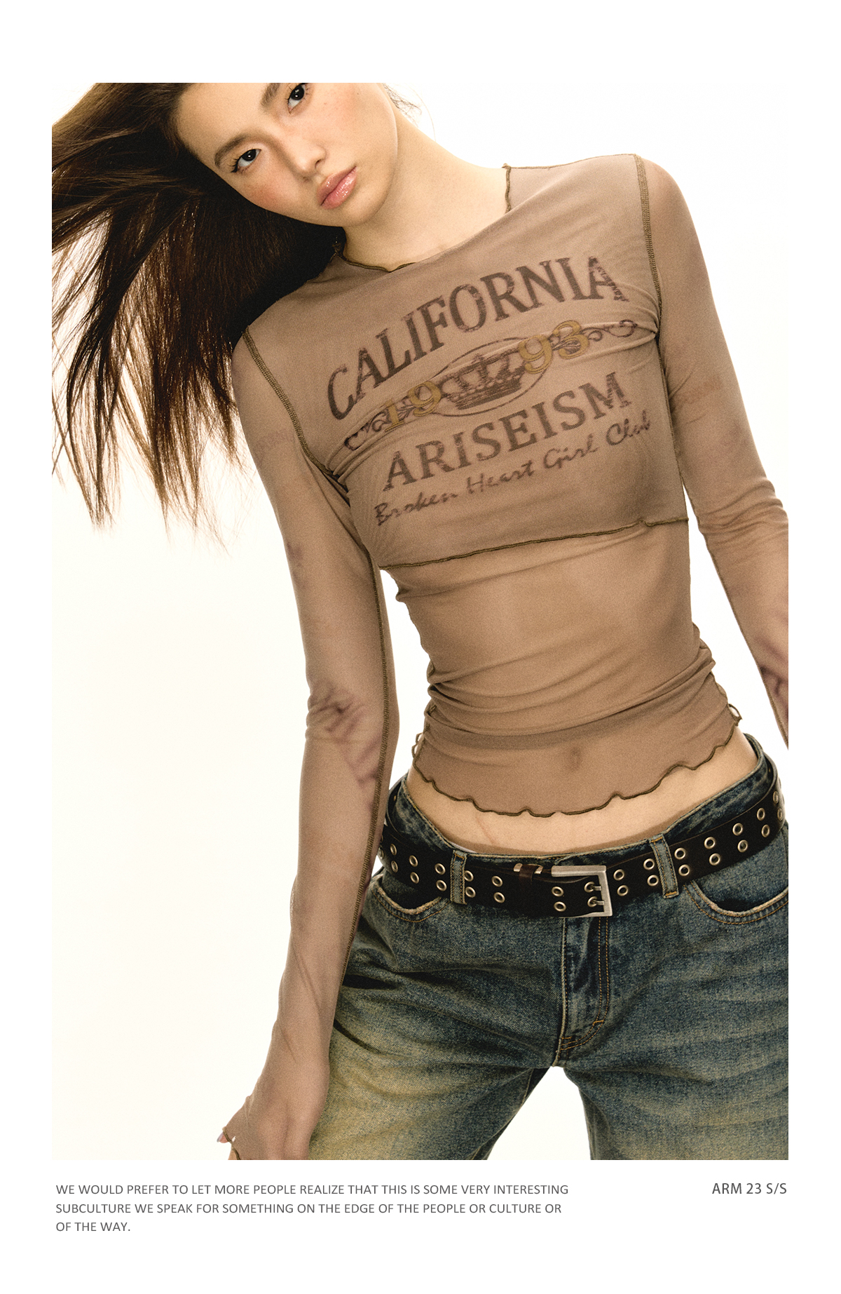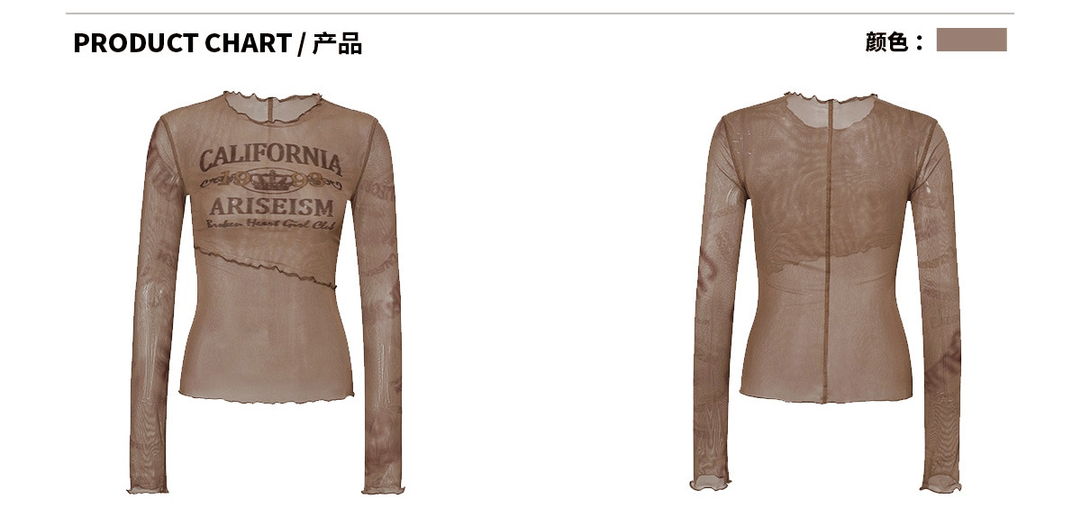 Ariseism 美式复古辣妹网纱长袖t恤女秋季新款紧身上衣内搭打底衫