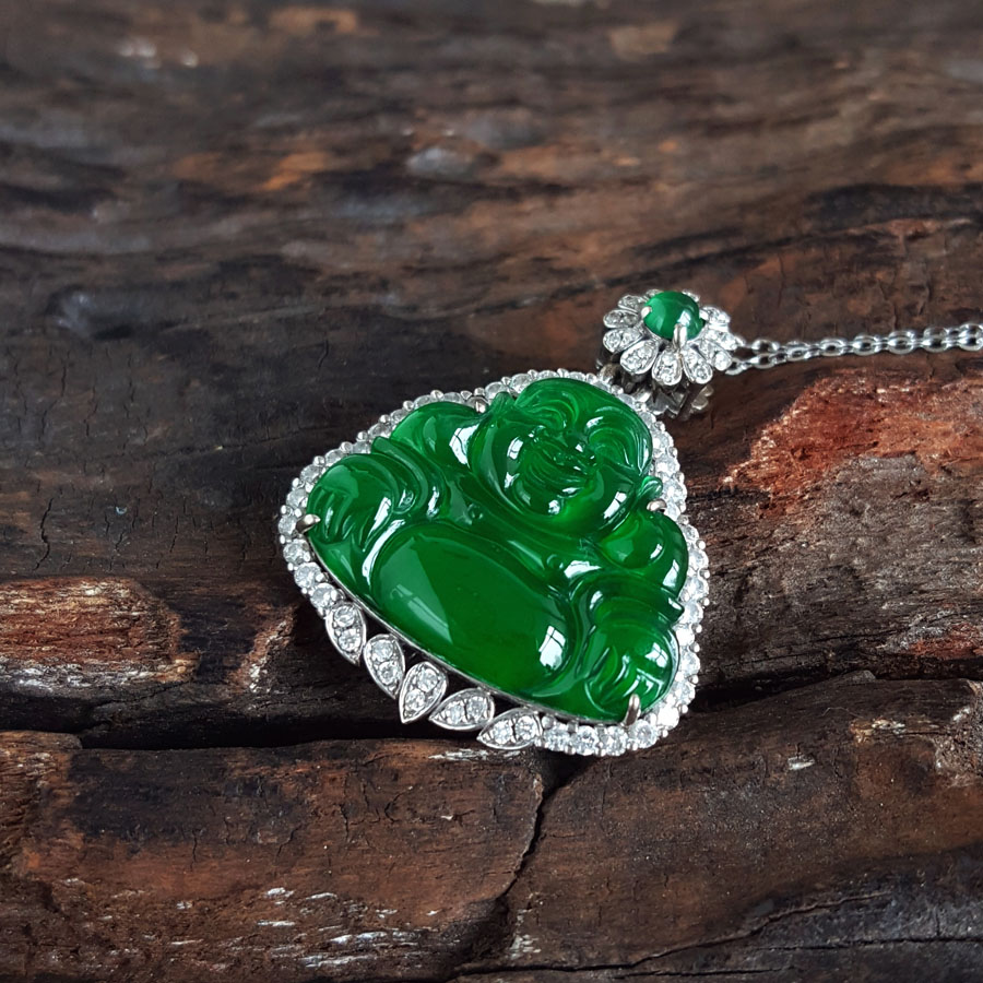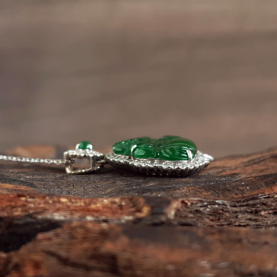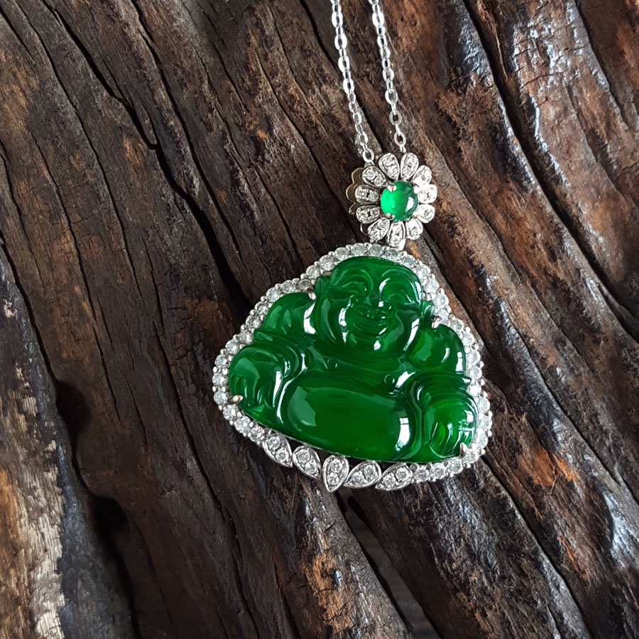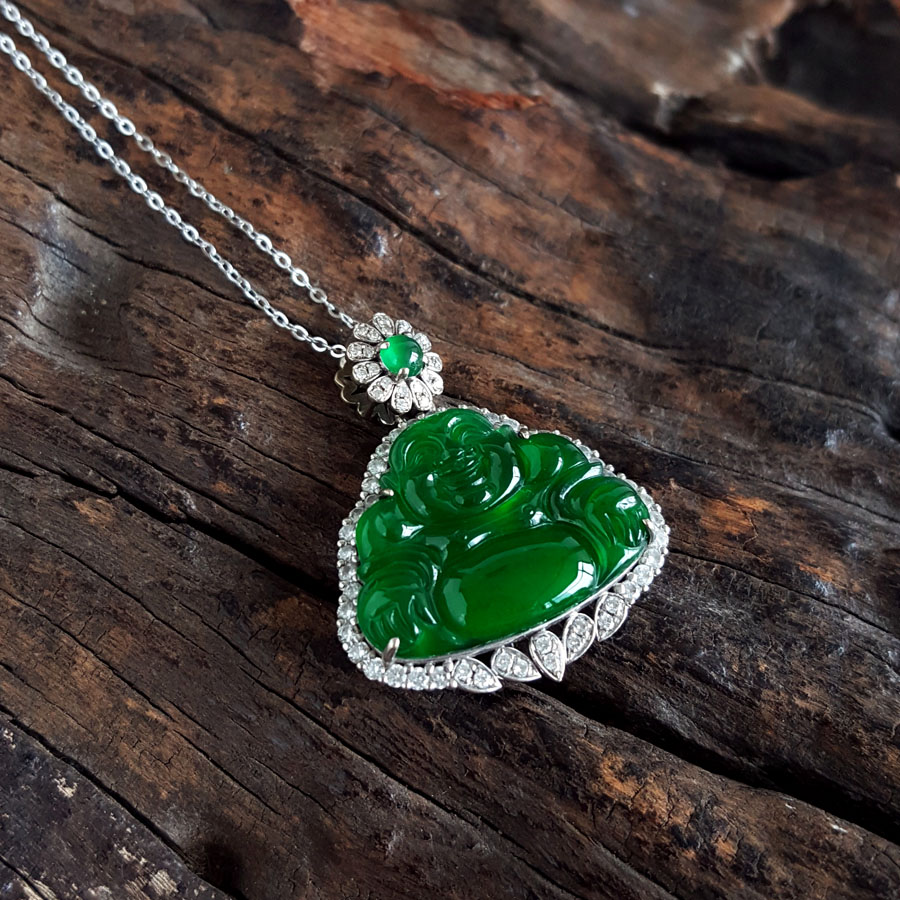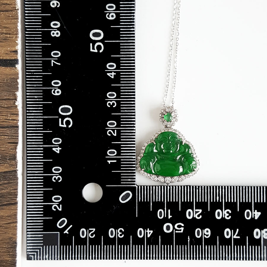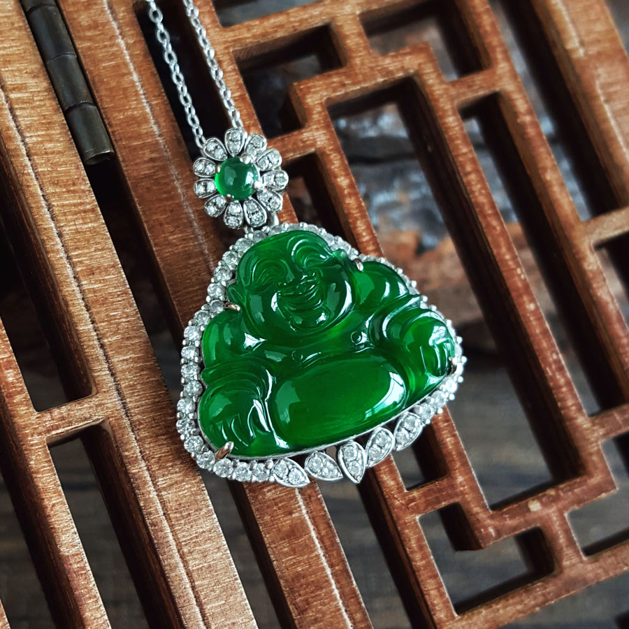 名称 | AU750白金镶钻镶天然细腻满绿冰种佛公翡翠吊坠项链 |