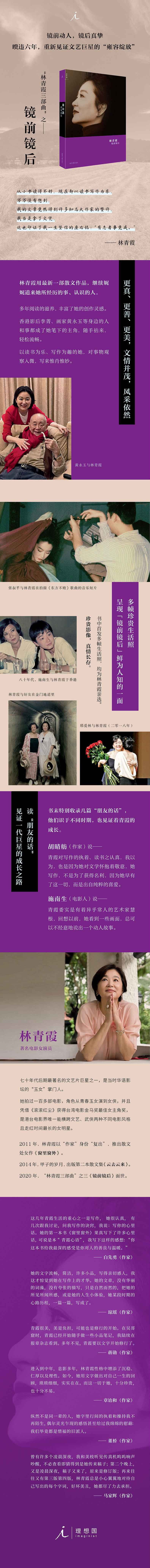 《镜前镜后》是林青霞第三部散文作品,在《窗里窗外》和《云去云来》之后,继续娓娓道来她所经历的事、认识的人。书末特别收录几篇“朋友的话”,他们识于不同时期,也见证着青霞的成长。多年阅读滋养下,也丰富了她的创作灵感,身边的人和事都成了她笔下的主角,随手拈来,轻松流畅。以读书为乐、写作为趣的她,对事物观察入微,写来惟肖惟妙,所思所想,真情流露。