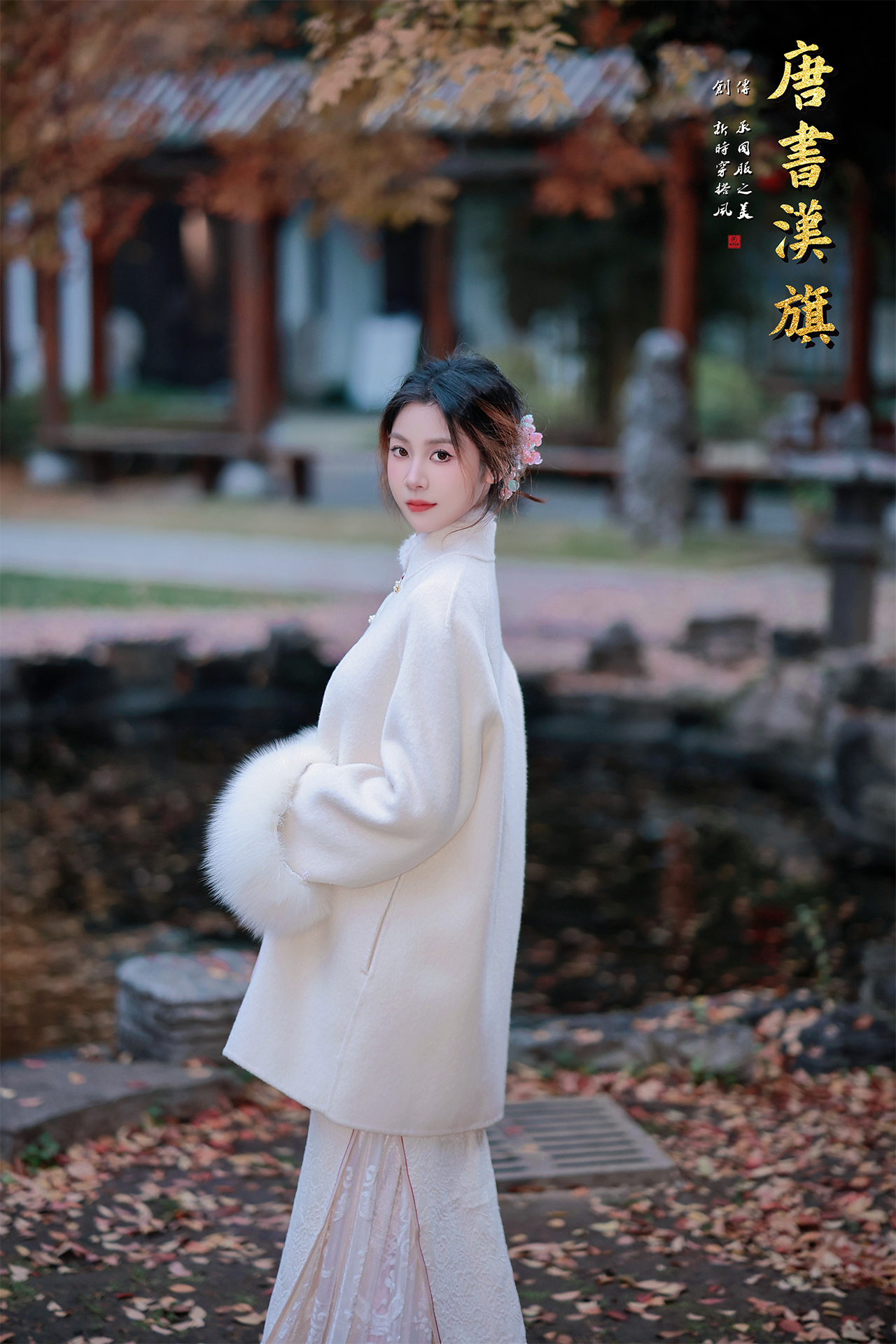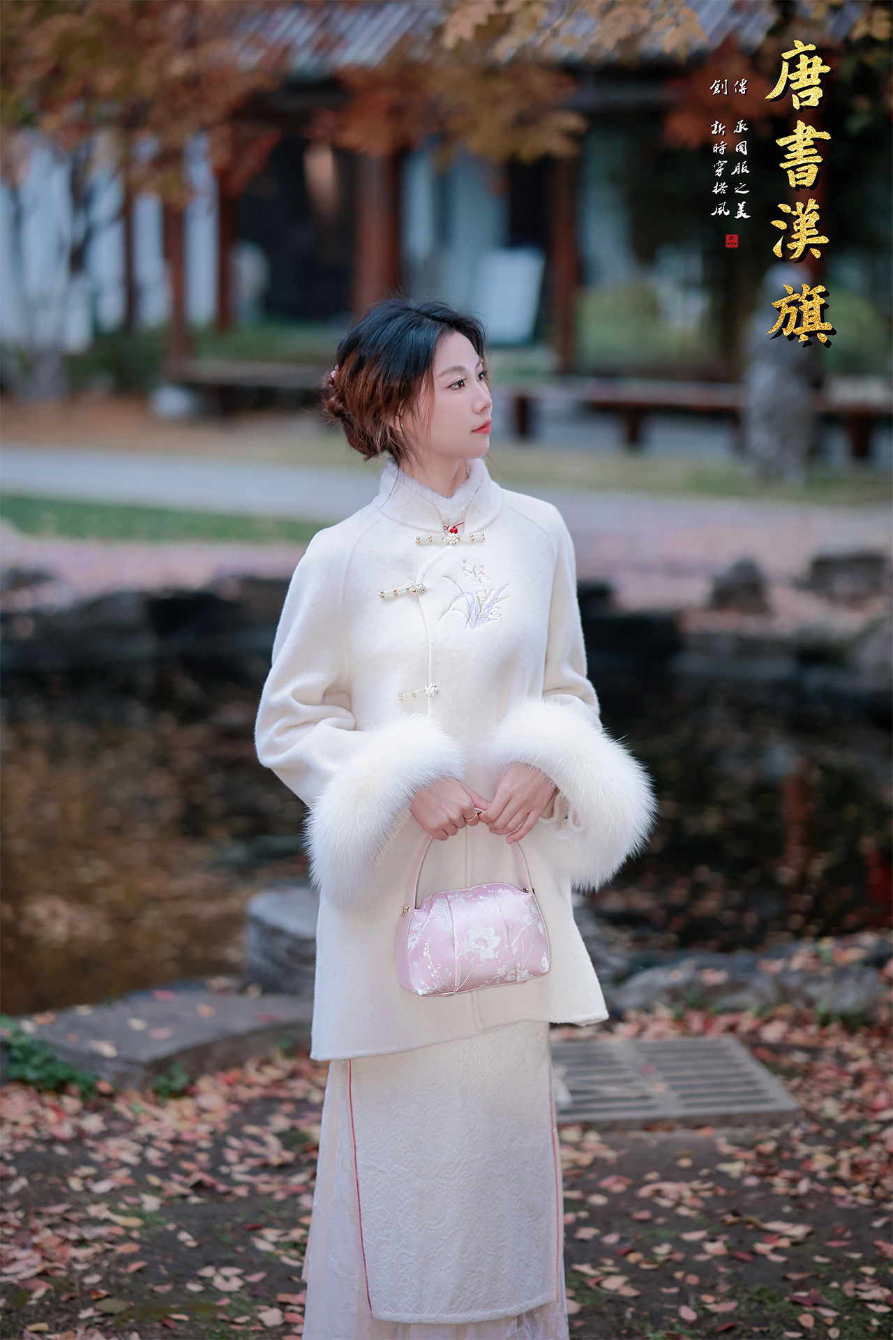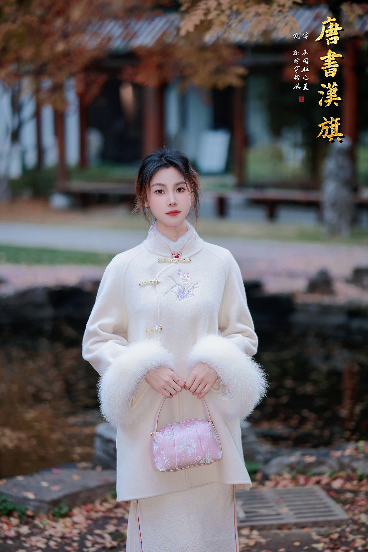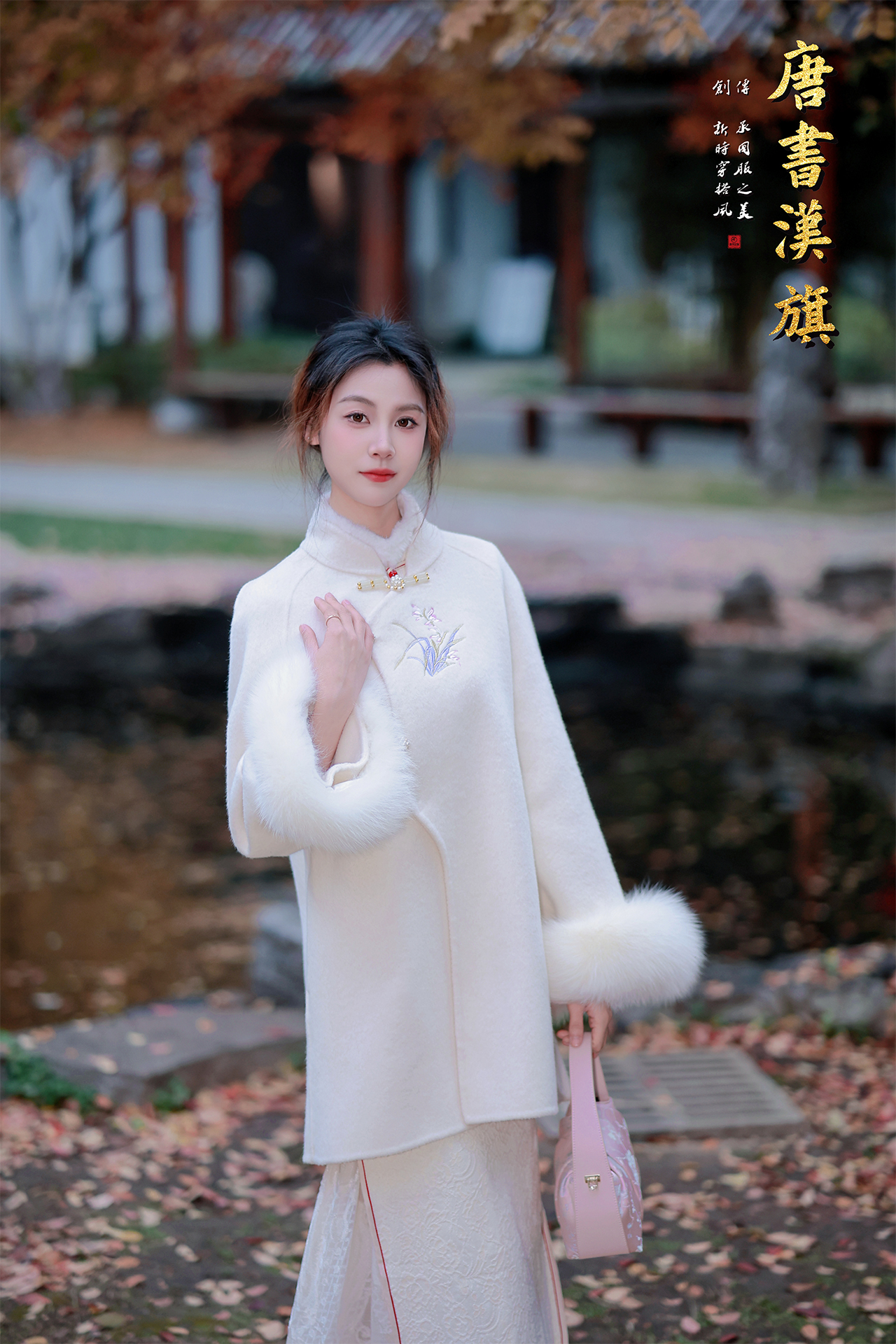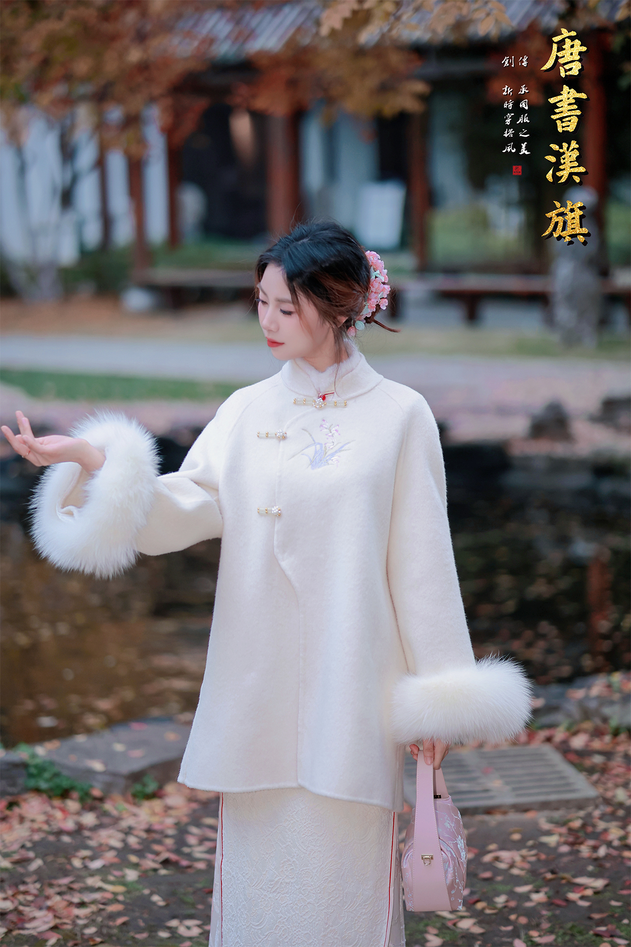 【素白兰烟(澳洲超细羊毛)】新中式立领盘扣造型,衣身缀有精致刺绣图案,袖口拼接蓬松毛绒,宽松廓形包容各种身形,米白色调温柔雅致,尽显东方古典韵味。
