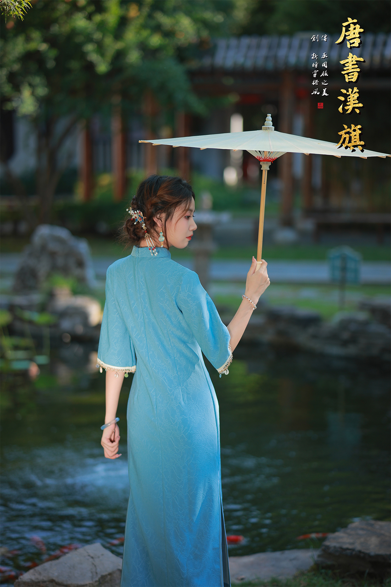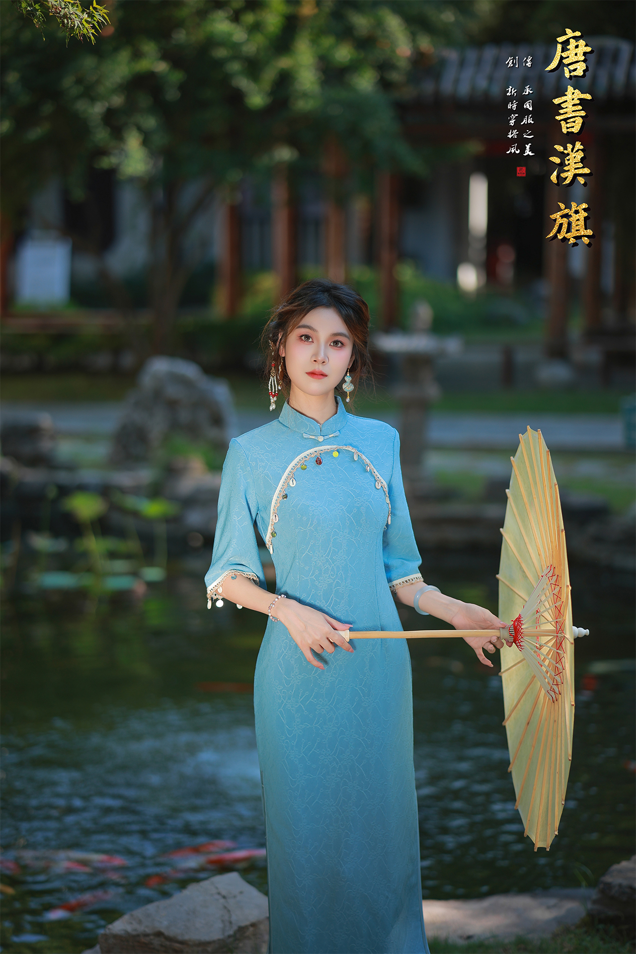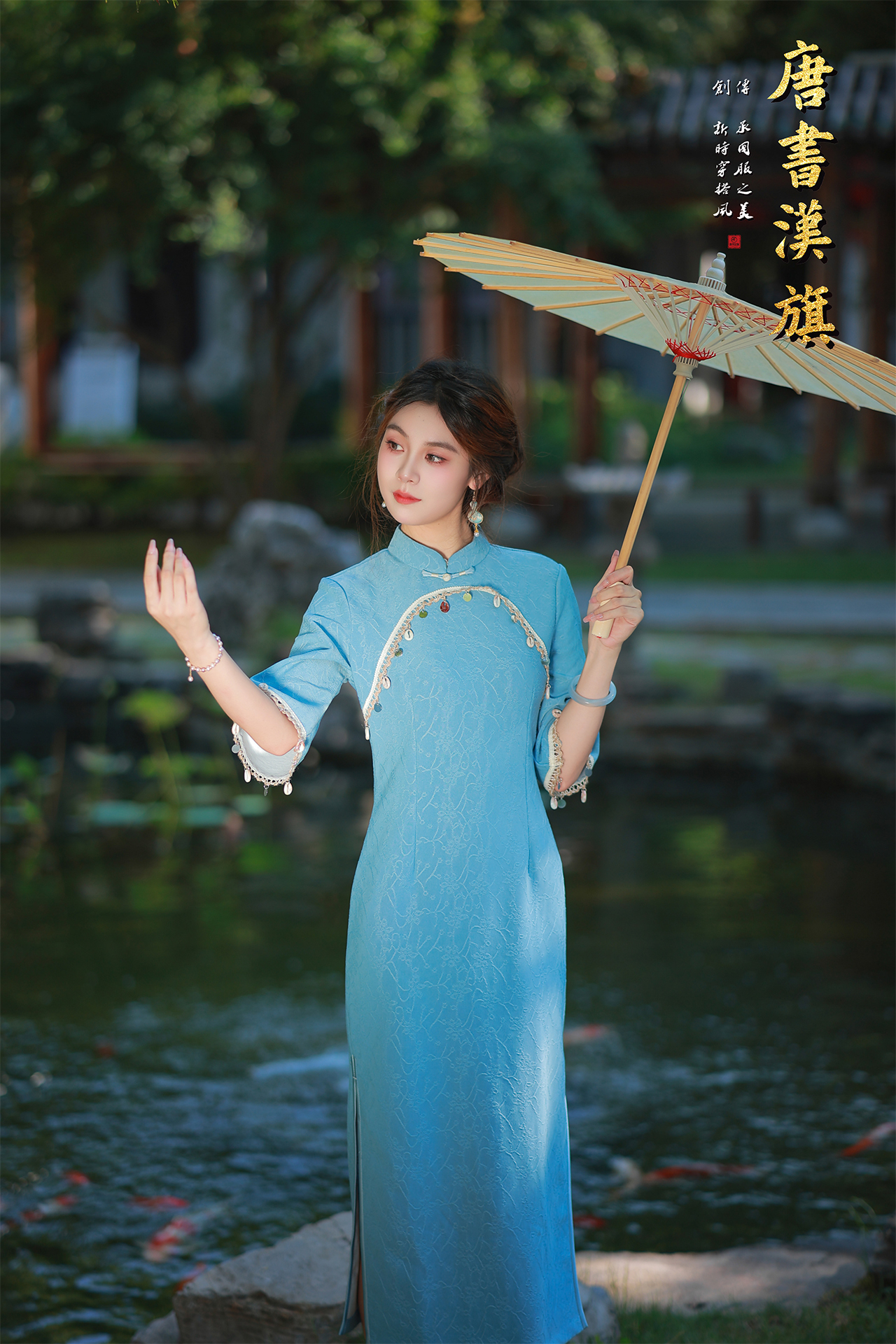 【红蓝赤韵】一袭梦幻浅蓝色旗袍,宛如从江南烟雨中走来,领口处精心镶嵌着多彩宝石与珠串,摇曳生姿,搭配富有层次感的袖口珠链装饰,华丽而不失典雅,无论是游园赏景还是出席重要场合,都能让你成为焦点。