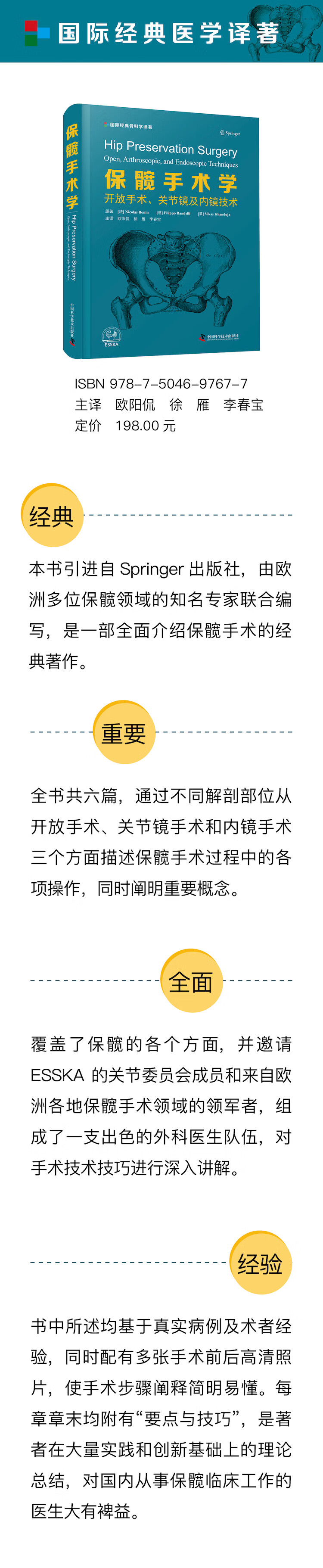 本书引进自 Springer 出版社,是一部全面介绍保髋手术的经典著作。全书共六篇,从不同解剖部位入手,系统描述了开放手术、关节镜手术和内镜手术的各项保髋操作,阐明了众多重要概念和技巧。书中所述内容均基于真实病例及术者经验,同时配有多张手术前后高清照片,使得手术步骤阐释简明易懂。本书以先进的现代技术和健全的临床研究为基础,为临床医生提供了丰富的资源,每章章末均附有“要点与技巧”,这是著者在大量实践和创新基础上的理论总结,对国内从事骨科临床工作的医生大有裨益。本书内容实用、阐释简明、图片丰富,既可作为住院医生和入门骨科医生的指导书,又可作为中、高级别骨科医生了解新技术的参考书。