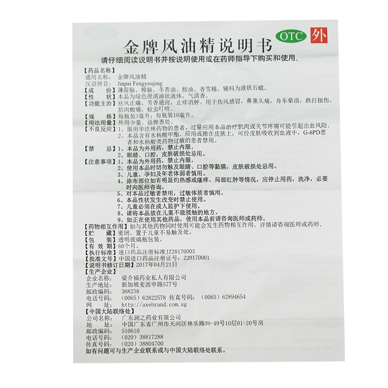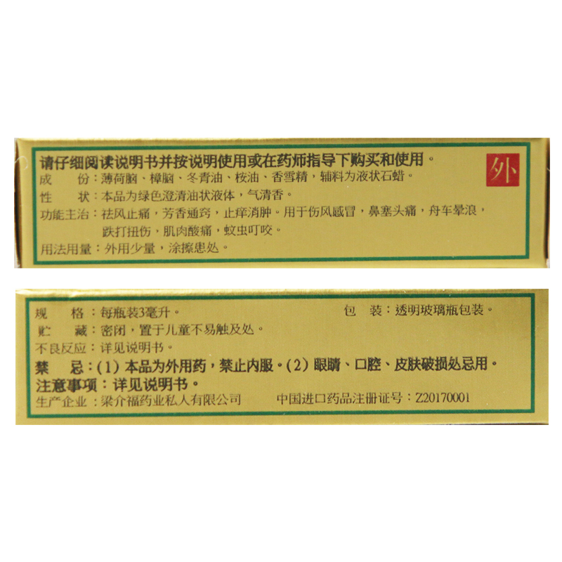 梁介福新加坡金牌风油精3ml祛风止痛芳香通窍止痒消肿伤风感冒