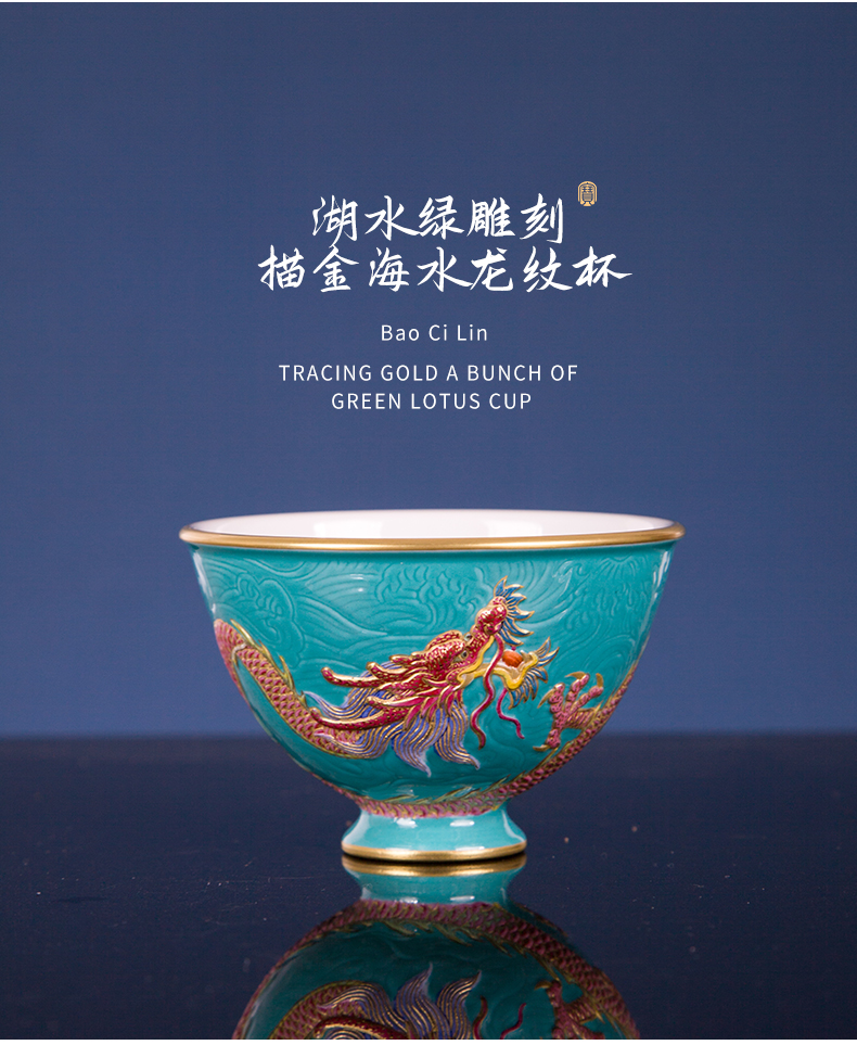 湖水绿雕刻描金海水龙纹杯(北京SKP店首发)