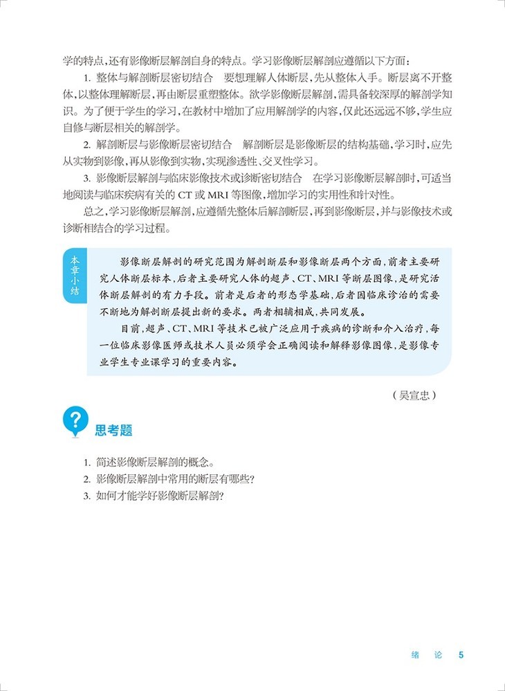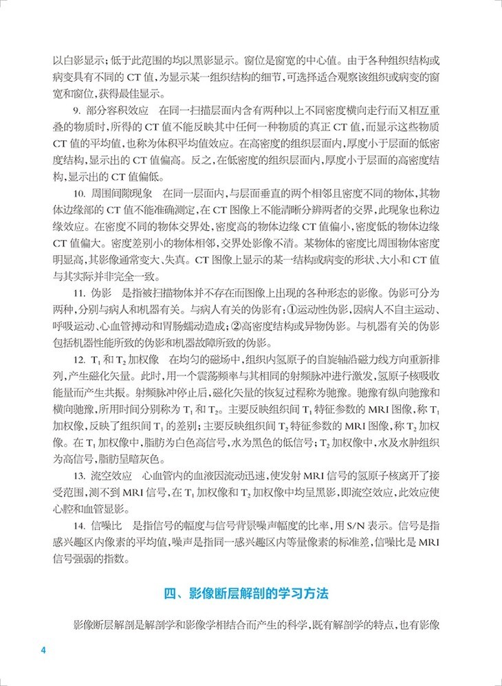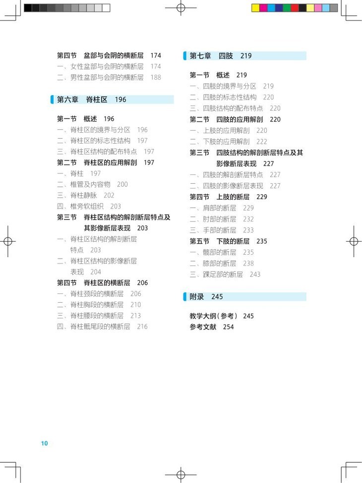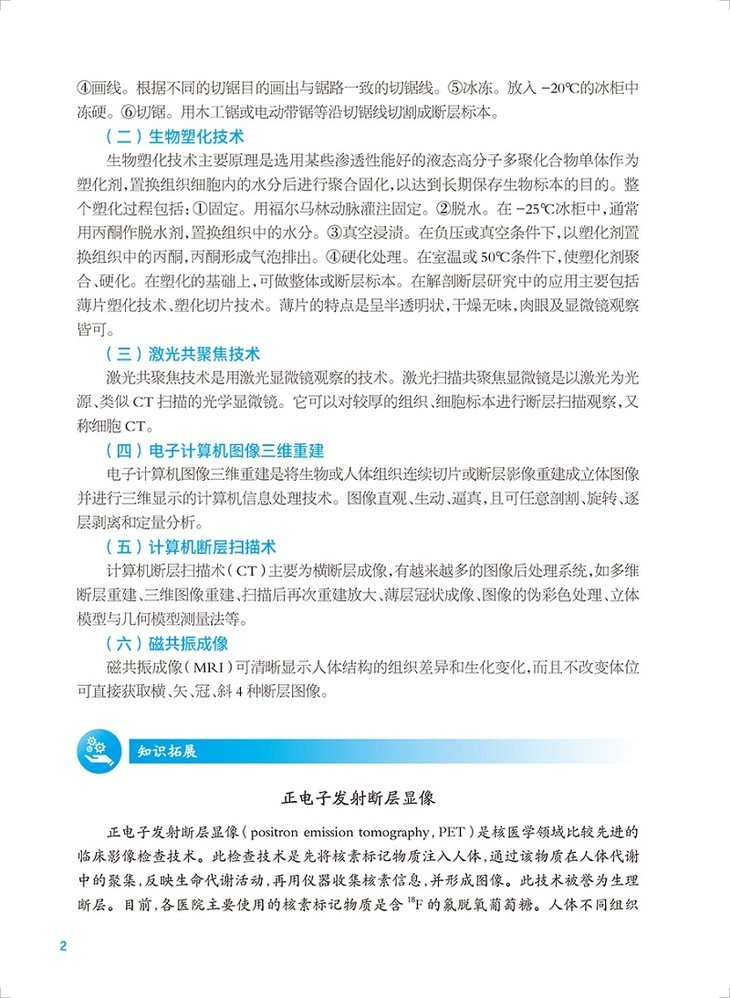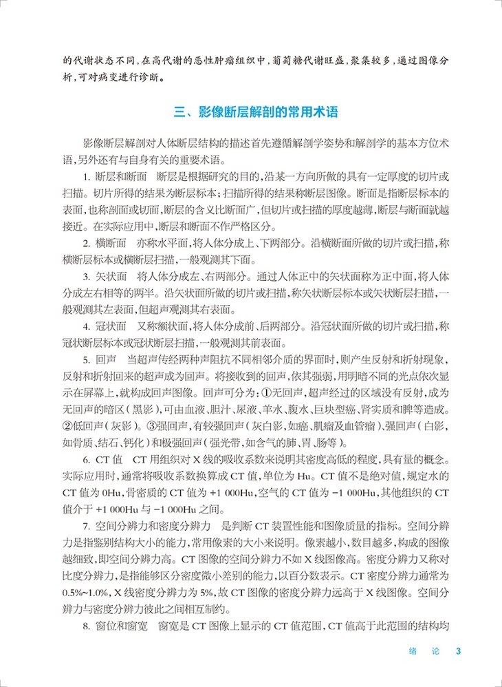为满足中职影像学生学习影像断层解剖的需要,编写时既考虑了学生的学习基础,又考虑学习的实用性,尽力做到了以下几个方面:①断层的选择。影像断层解剖以横断层为主描述人体重要和关键层面中结构的形态、位置、毗邻及其变化,突出重点;结合临床影像检查的需要,个别部位增加了矢状断层和冠状断层。②内容的排序。影像断层解剖主要内容的顺序为:应用解剖→解剖断层→影像断层。内容顺序安排符合学生的学习规律,即先学习相关的人体整体解剖,再学习解剖断层,逐步过渡到影像断层的学习,并尽力使人体整体解剖、解剖断层与影像断层三者的知识融为一体。