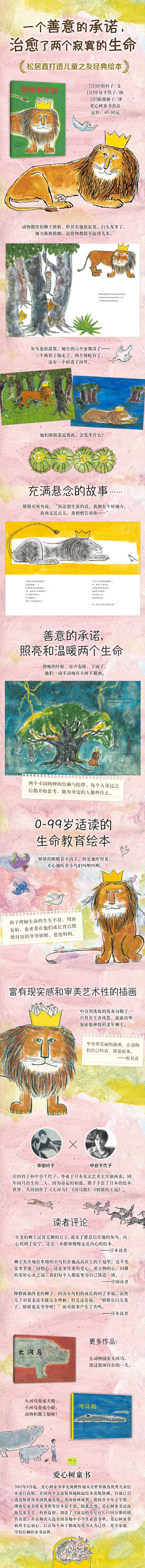 狮王骄骄的王冠一闪,其他动物就会吓得躲起来。但其实骄骄很寂寞。头发变得花白,视力渐渐模糊,追猎物也提不起劲儿来,他好想找谁聊聊天呀!这时,一只伤心的灰鸟飞来。她生的六个蛋都没了_mdash;_mdash;三个被豹子偷走了,两个被蛇吞了,还有一个掉进了河里。骄骄对她说:_ldquo;你还想生蛋的话,我倒有个好地方。你再走近点儿,我悄悄告诉你_hellip;_hellip;_rdquo;
