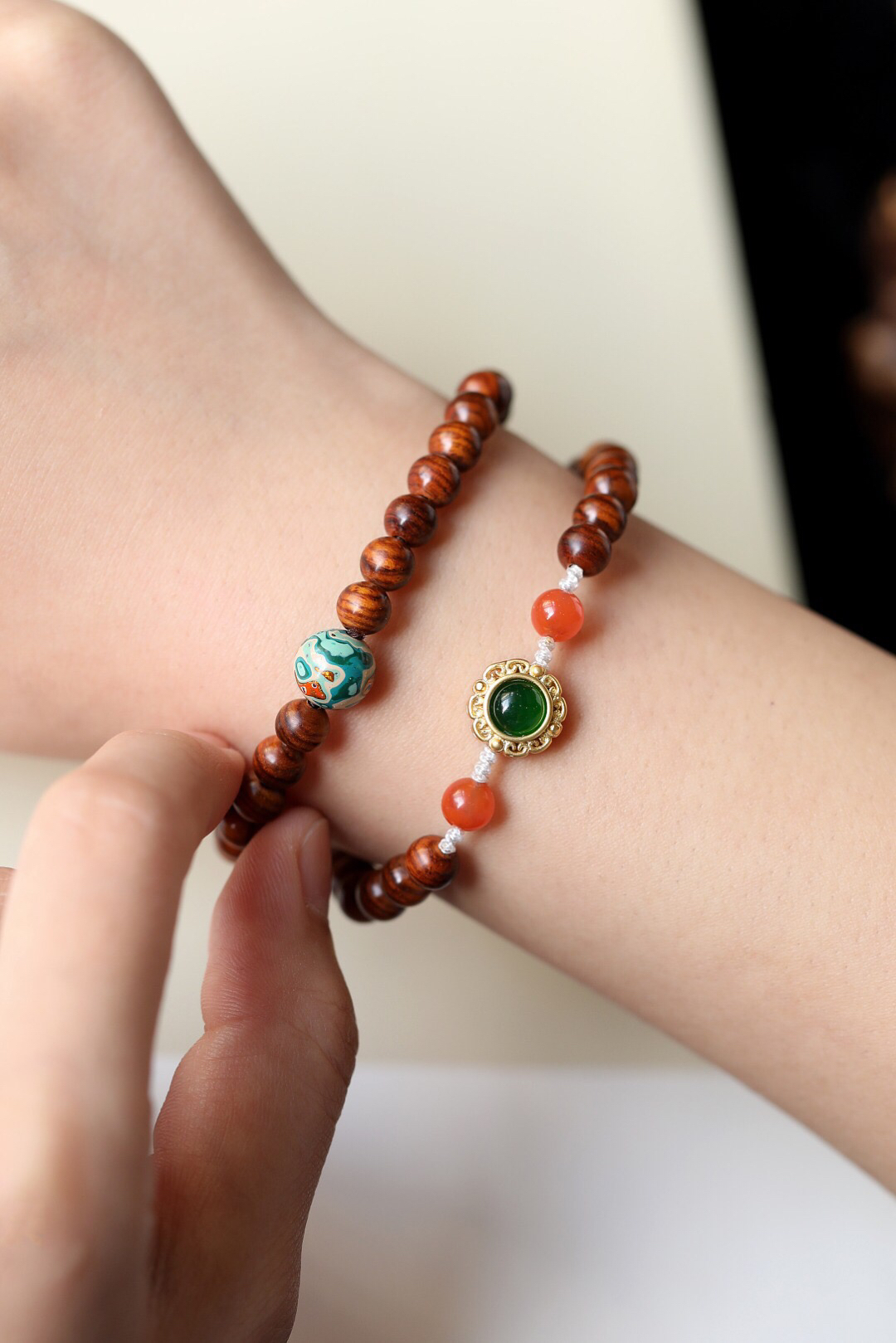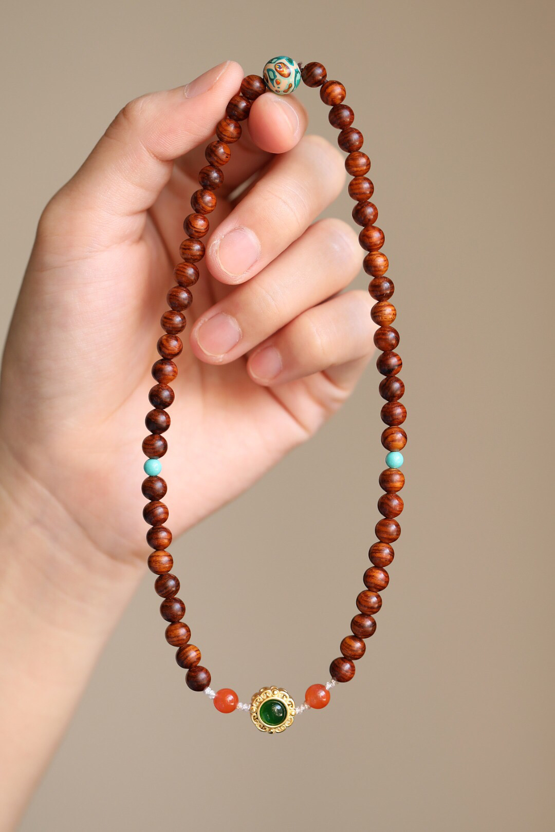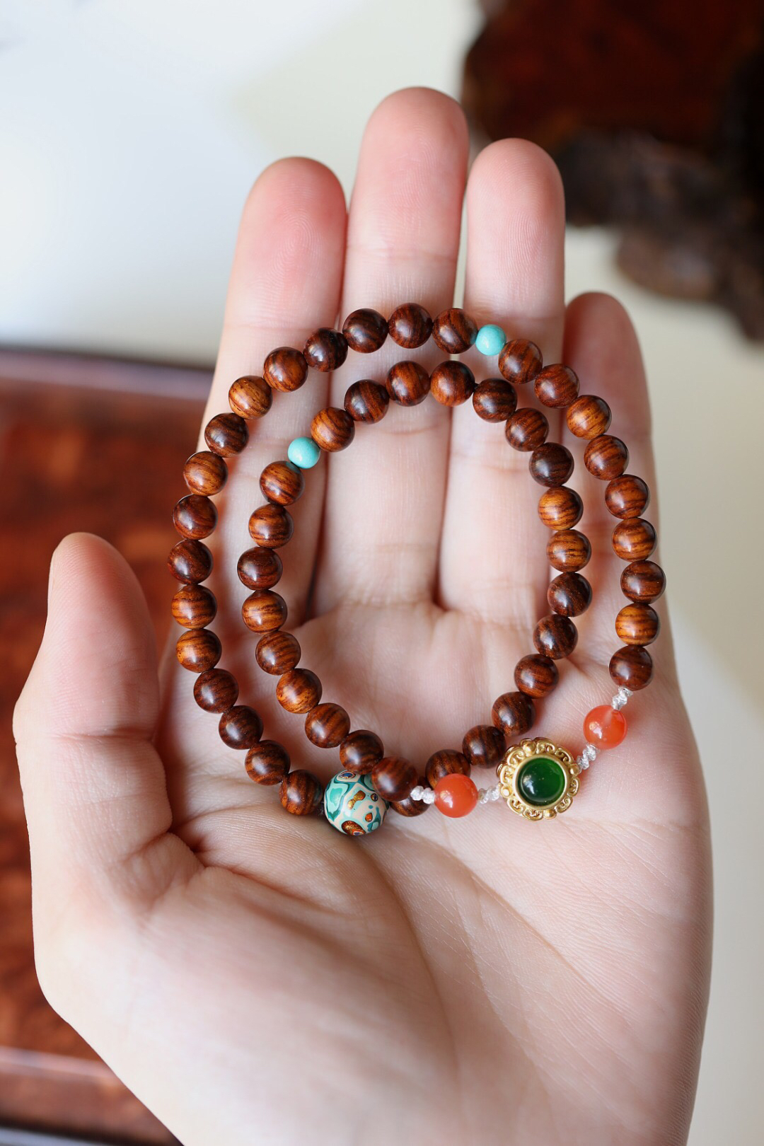 这一款手串精致细腻,清新自然,送给心爱之人表达爱意,或者馈赠亲朋好友,都是很好的。优质的海黄料为基础,油性足,颜色润,纹理清晰,美观漂亮,降香味十足。搭配南红、松石、大漆珠等,别有特色,体现了一种自然的尊贵感。韵味十足,体现的是一种尊贵奢华的韵味,很值得把玩,不要错过哦!
