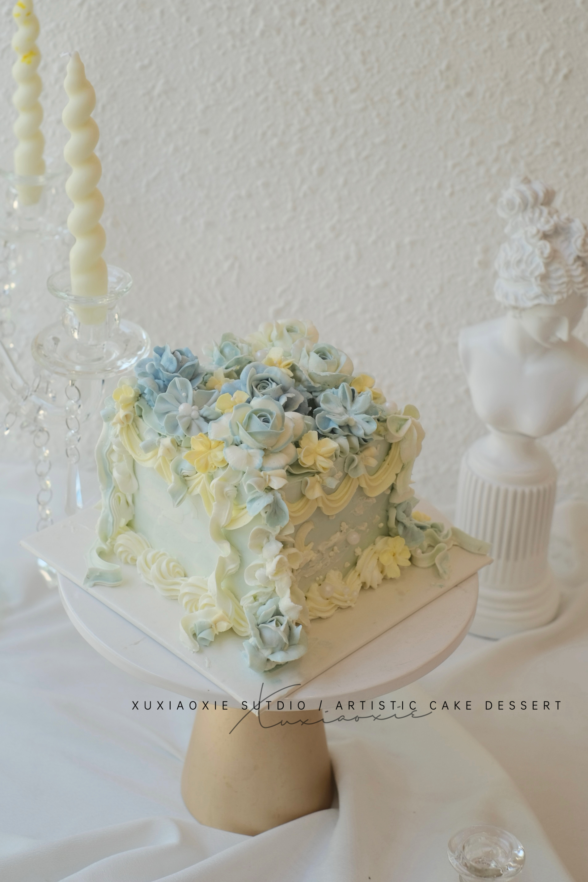 由于这款蛋糕造型比较复杂,我们会使用奶油霜抹面来确保蛋糕的稳定性。