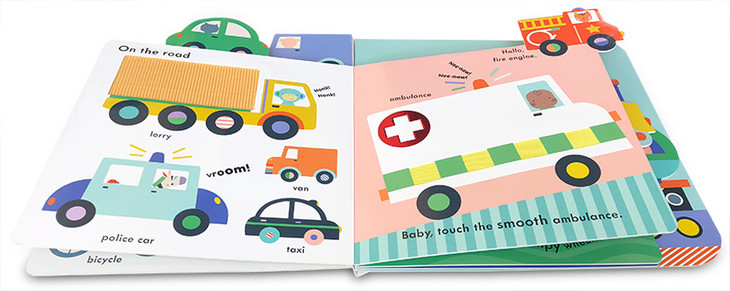 There are also big, stimulating touch-and-feel areas to stroke and talk about on every page - which wheel feels bumpy? Which window feels shiny?