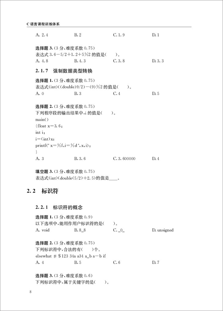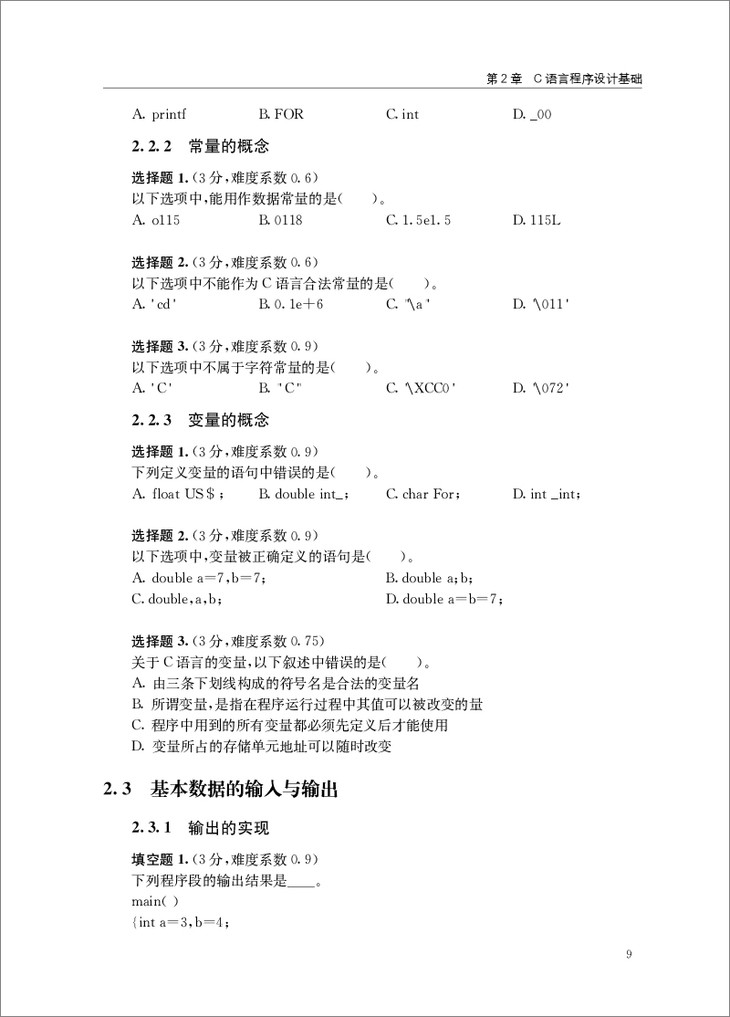 本书内容包括 :C语言发展及开发环境,程序设计基础,顺序结构、选择结构、循环结构程序设计,C语言函数和综合习题。本书按照教材的章节顺序,以节为单位进 行编写。每章前面配有知识结构框图和学习要求,每节练习题以选择题和填空题为 主,还标明了难度系数。