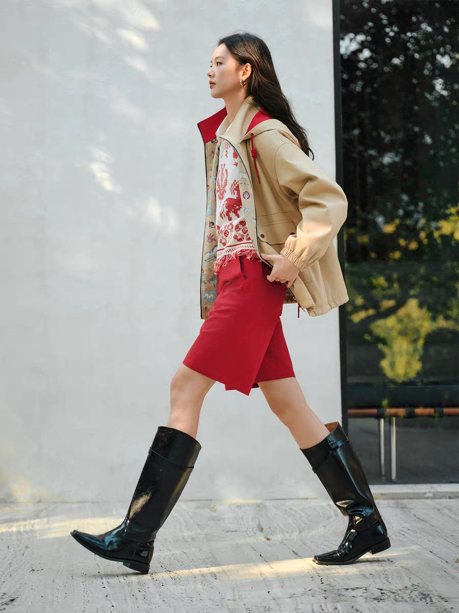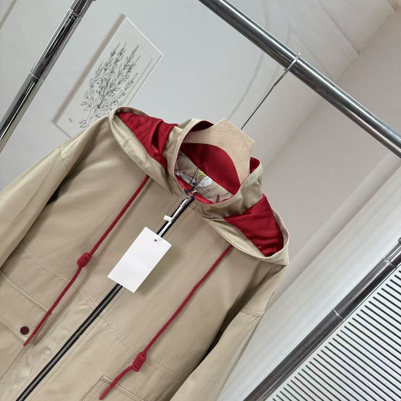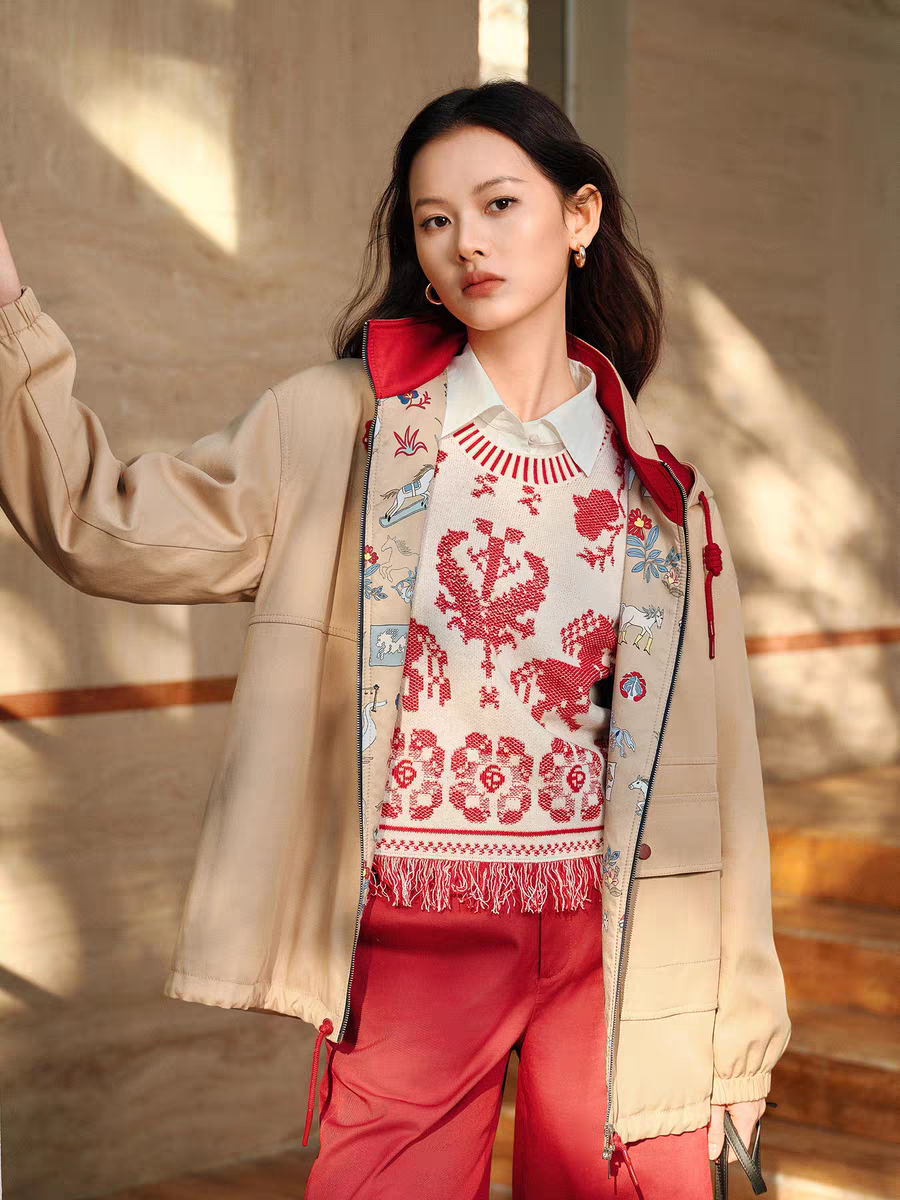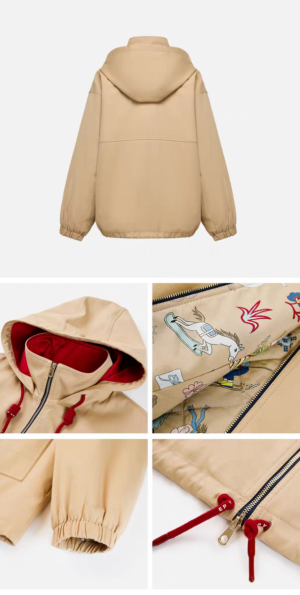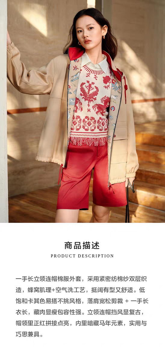 立领连帽挡风显复古,帽领里正红拼接点亮,内里暗藏马年元素,实用与巧思兼具。