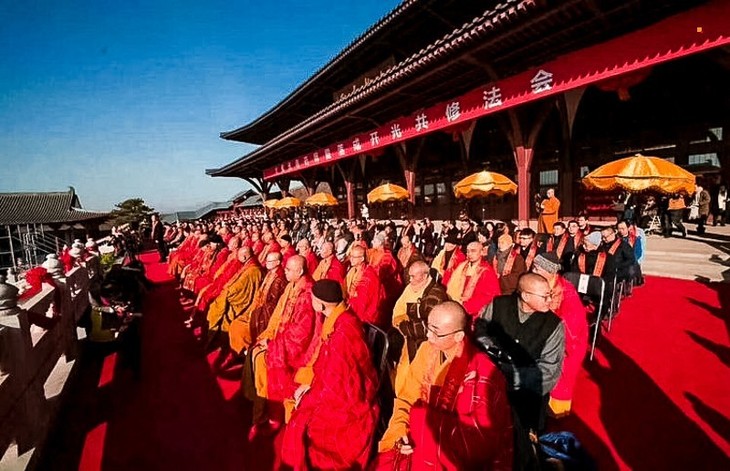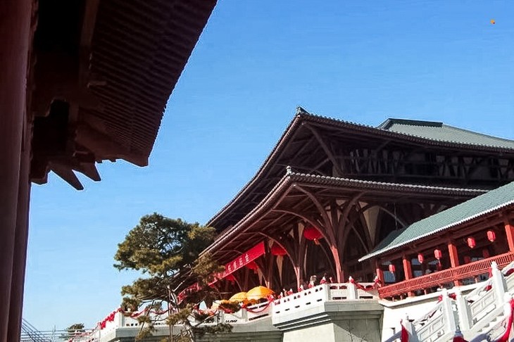 寺院以南北长500米,东西宽100米为中轴区域。中轴区以山门、五圣殿、大雄宝殿、药师殿、舍利塔、兰吡尼园、万佛广场为中心区域,中轴区没有天王殿,是以五圣殿为起始。五圣分别为:大慈弥勒菩萨、大智文殊菩萨、大悲观世音菩萨、大愿地藏王菩萨、大行普贤菩萨。五位护法分别代表:慈、智、悲、愿、行,遵循此五条则佛教如日中天。中轴区的三大主殿堂五圣殿、大雄宝殿、药师殿,殿堂不大,并且堂内不需要柱子,三个殿堂代表佛、法、僧三宝。五圣殿—僧宝,大雄宝殿—佛宝,药师殿—法宝,五圣殿位列在前寓意美好,因僧宝住世则法常住世。