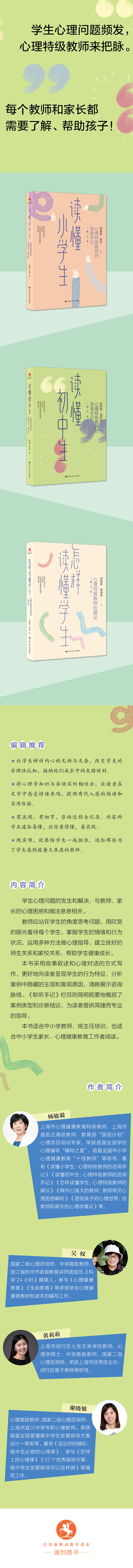 当初我们的写作意图就是想说说学生的心理故事,谈谈教师应该如何应对学生的心理问题,但写着写着我们发现小学生、初中生和高中生的心理故事有所不同,教师应对的方式也该有所区别。所以,就写成了《怎样读懂学生:心理特级教师的建议》《读懂小学生:心理特级教师的咨询手记》《读懂初中生:心理特级教师的咨询手记》三本书。它们分别针对不同年龄学生的特点,给教师和家长提出了建议。在撰写过程中,我们发现学生心理问题的发生和解决,与教师、家长的心理困惑、做法息息相关。教师和家长不仅是学生处理心理问题的解铃人,而且是学生产生心理问题的系铃人。因此,我们又撰写了两本关于教师和家长心理的书:《做内心强大的教师:教师常见心理困惑解析》《透视孩子的心理世界:给教师和家长的心理学建议》。
