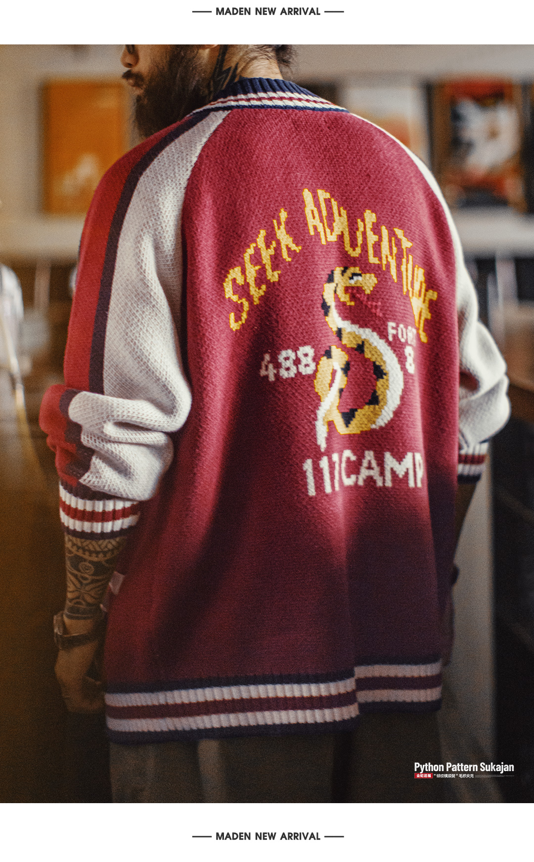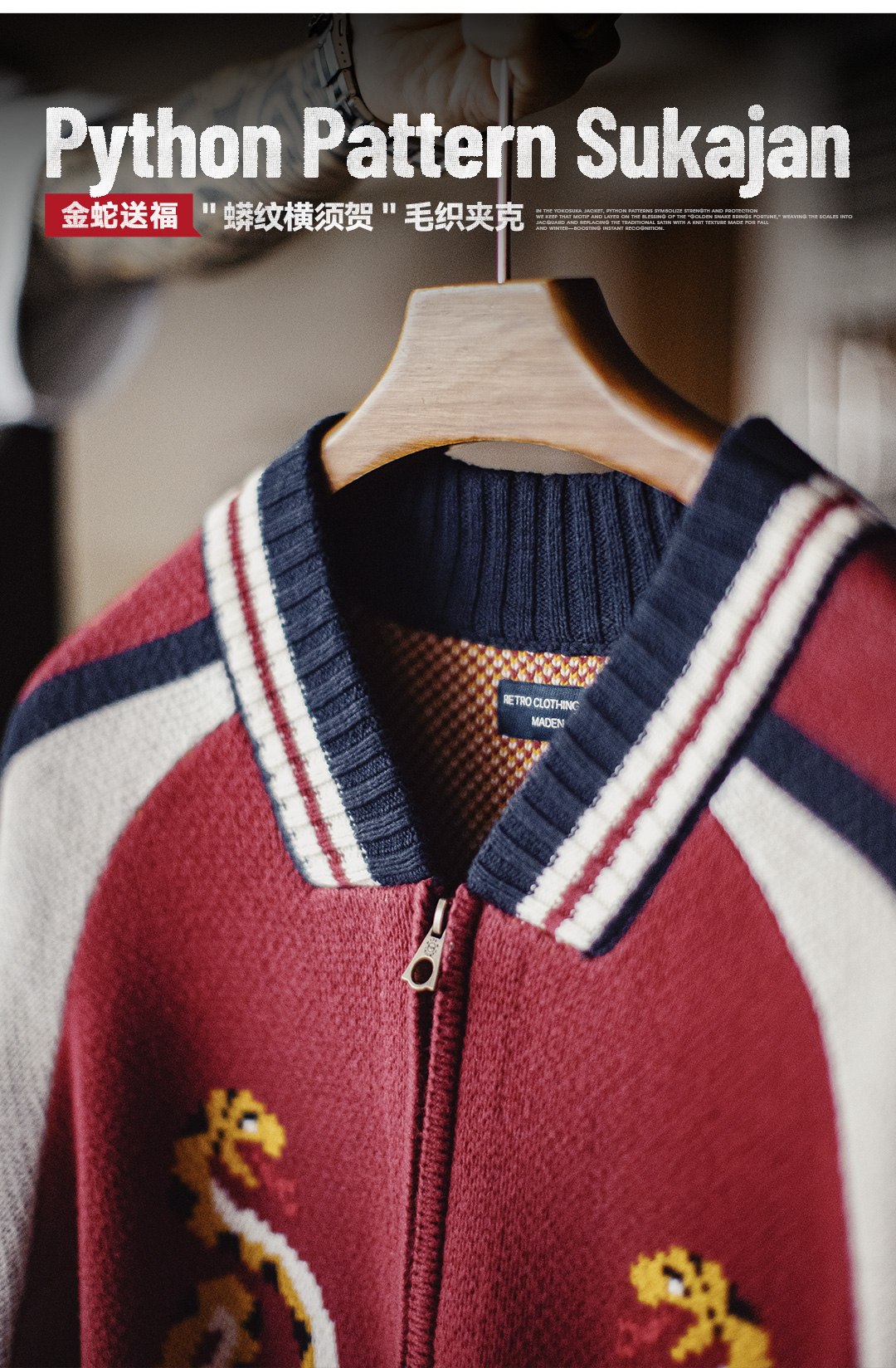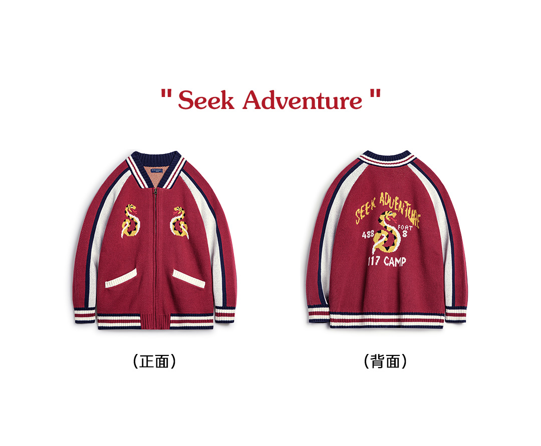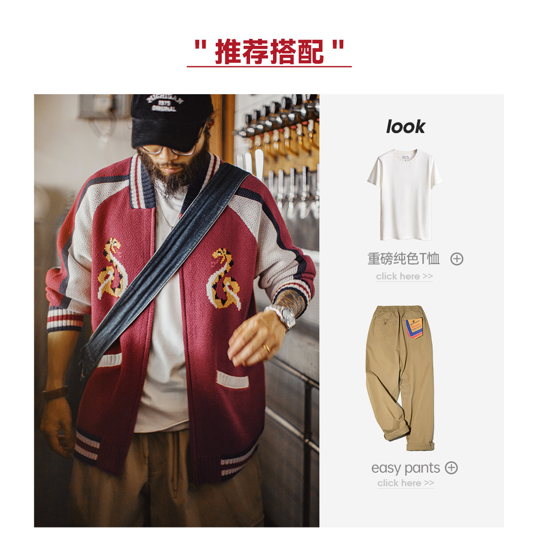 马登工装美式横须贺刺绣夹克日系红色棒球领毛织垂感开衫外套男秋