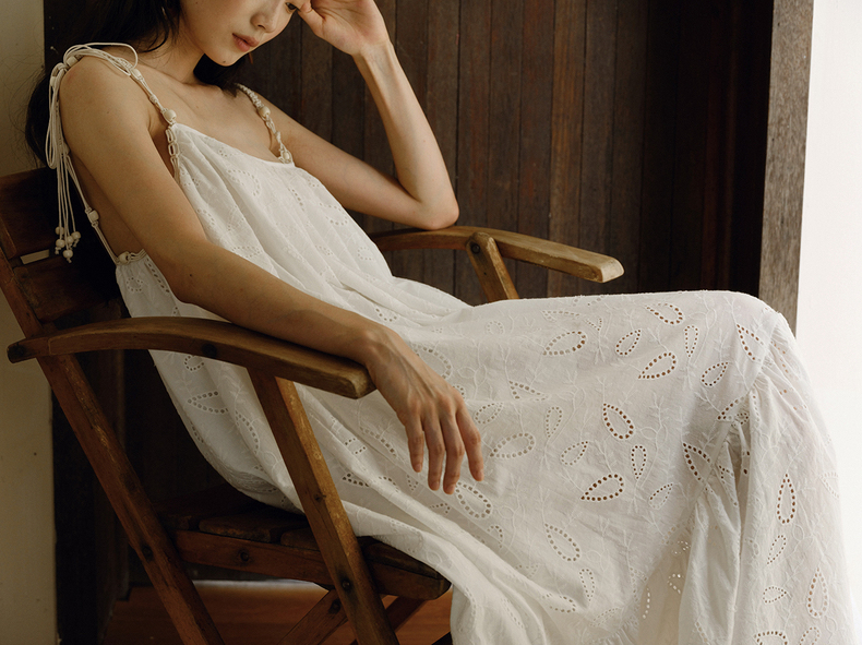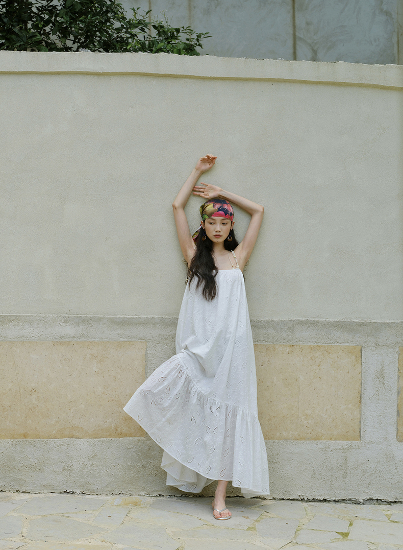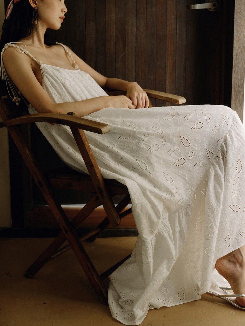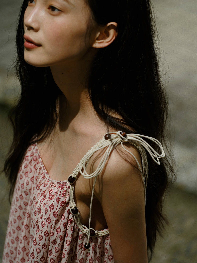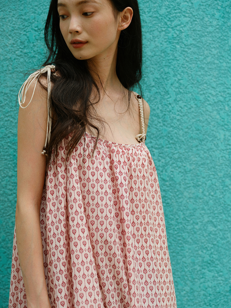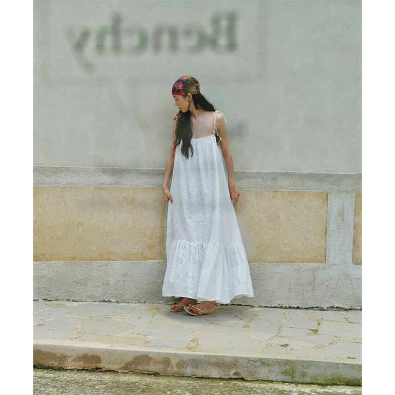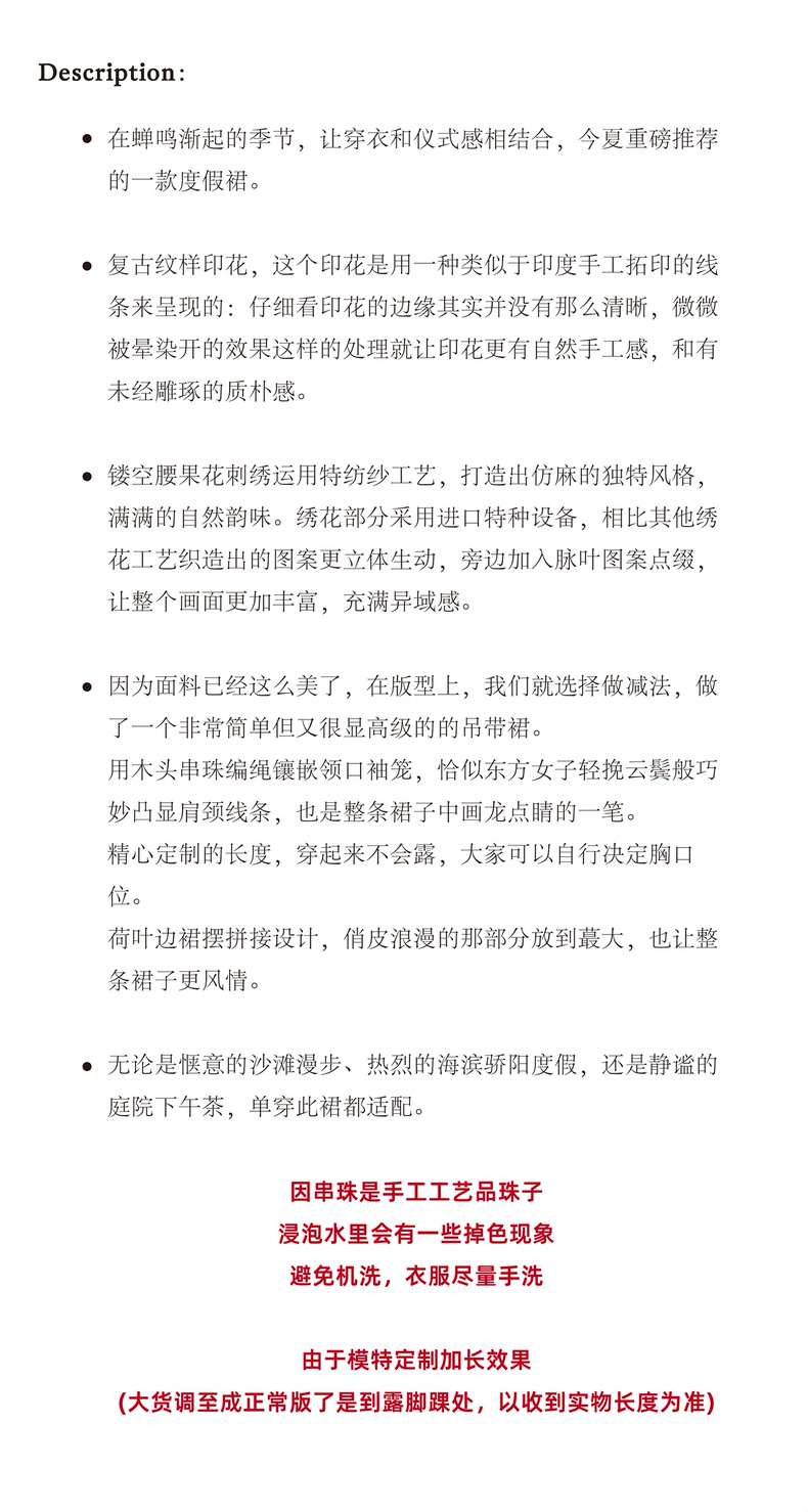 [特价] 夏日都市 手工编织串珠吊带 浪漫阔摆印花氛围感连衣裙 腰果刺绣白/印花铁锈红 100%棉