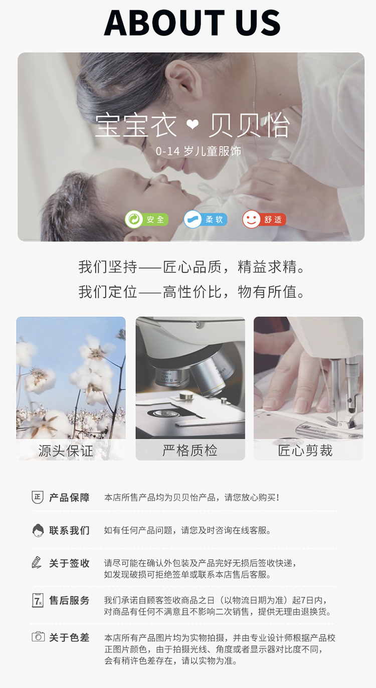 贝贝怡专注0-6岁婴幼儿服饰,坚持安全、柔软、舒适的产品理念,为千万中国家庭提供超高品质、安全可靠的婴幼儿服饰产品,妈妈放心,宝宝开心!