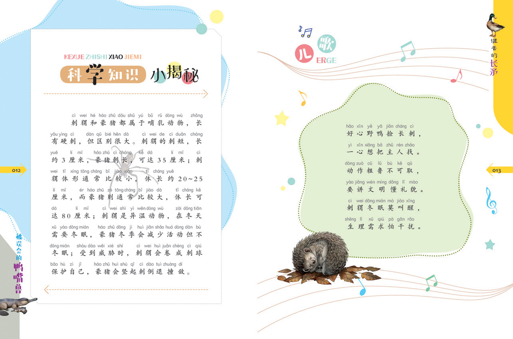自然奥秘很有趣,小小动物告诉你:好心野鸭捡长刺,一心想把主人找;壁虎断尾能再生,蜗牛壳裂可修补;神奇动物鸭嘴兽,奇怪之处藏不住;原生动物鞭毛虫,共生白蚁腹腔中本书由11个单独的童话故事,11个;揭秘科学小知识以及11首郎朗上口的和科普知识粘合度很高的儿歌构成,颇具童话的趣味性和科普的知识性,满足广大小读者;大语文时代新阅读的需求。