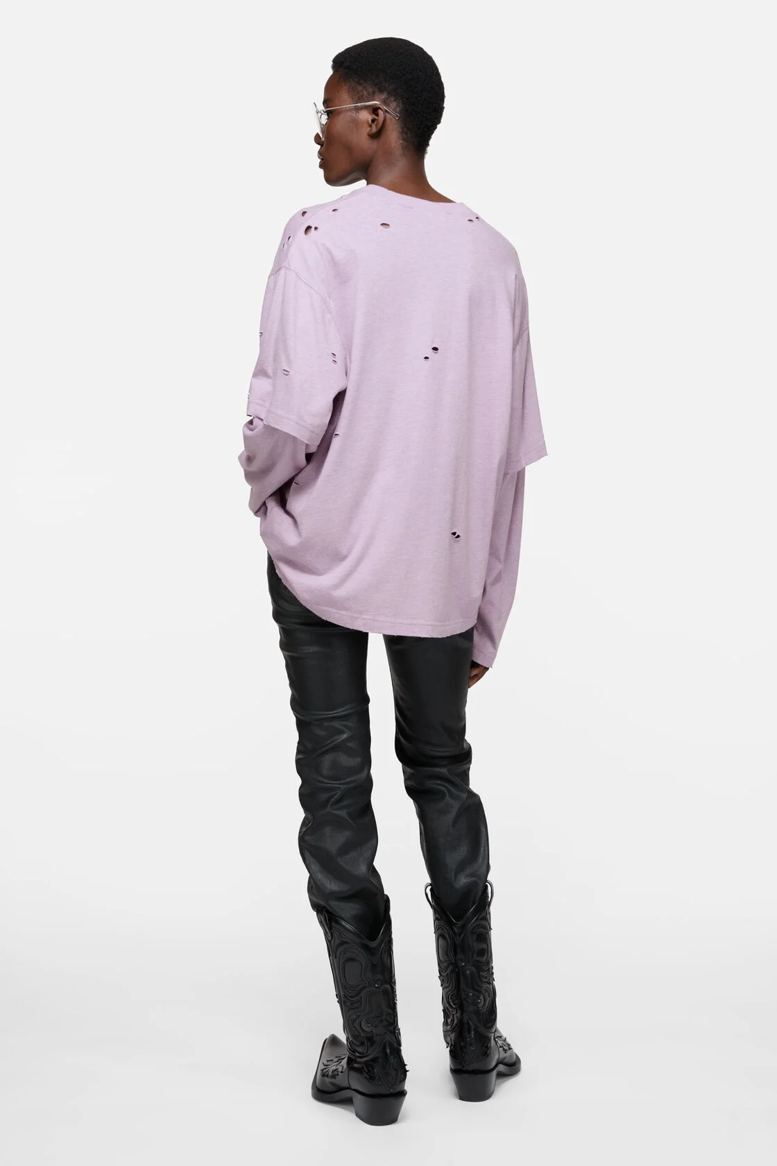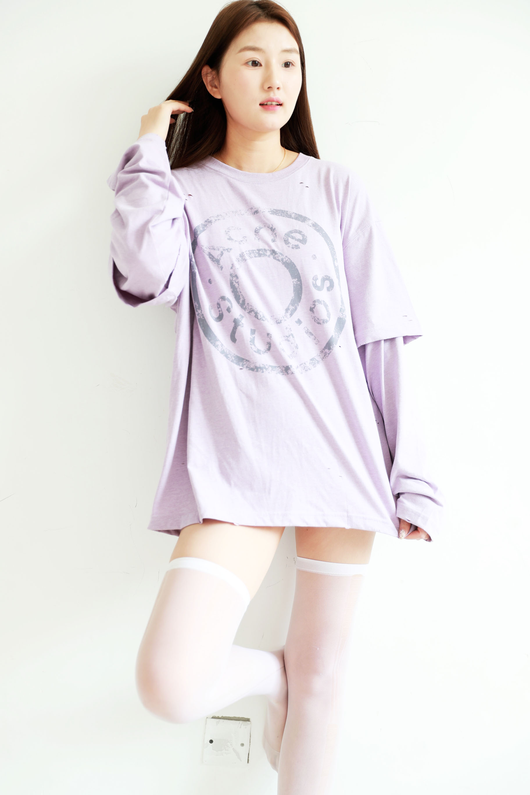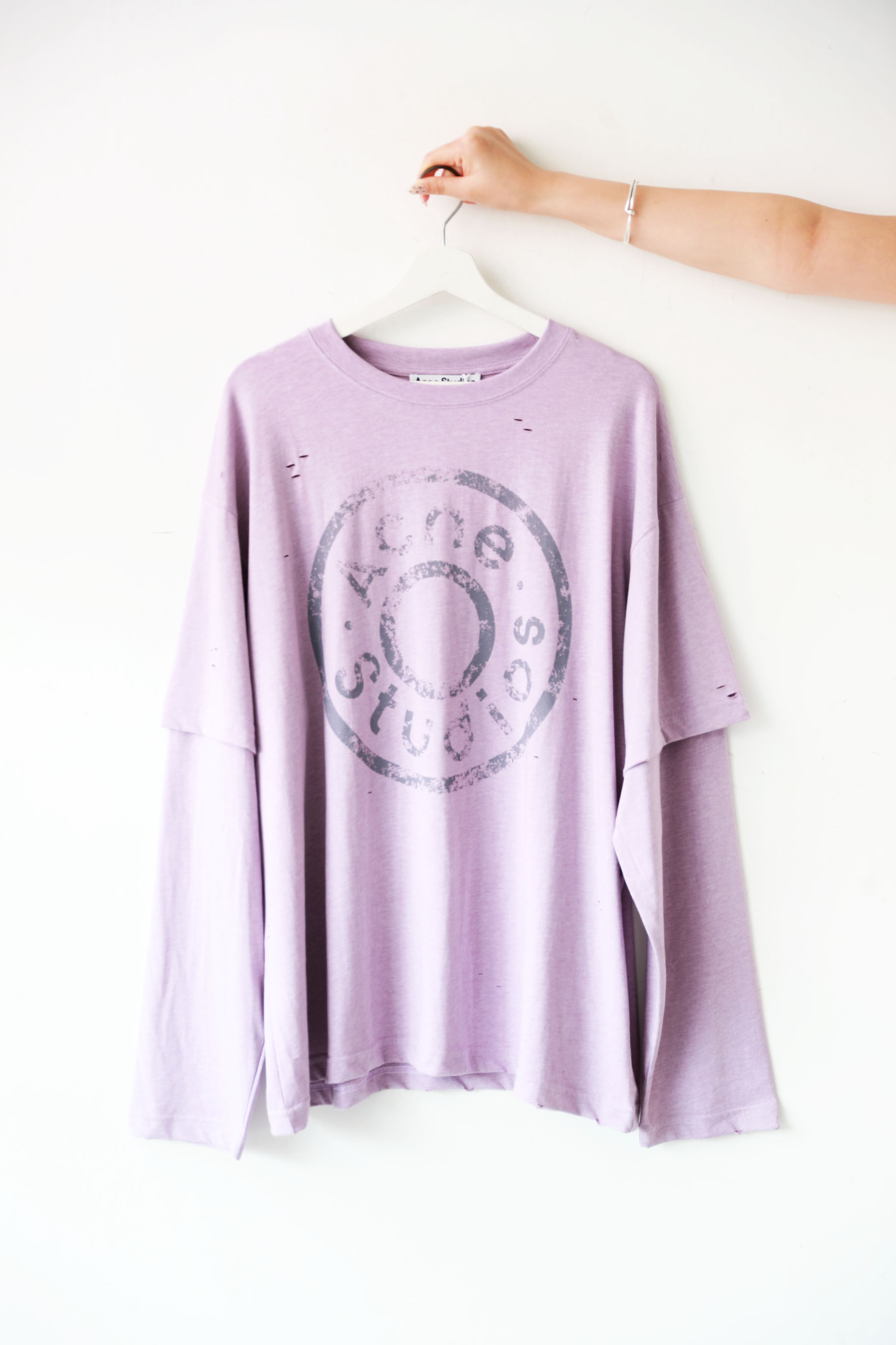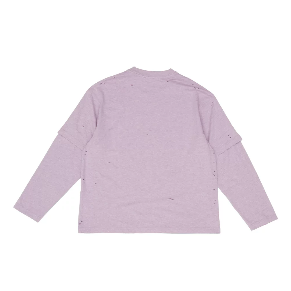 紫霞仙子tee,做旧复古长袖。假两件圆领正肩破洞字母上衣E041660