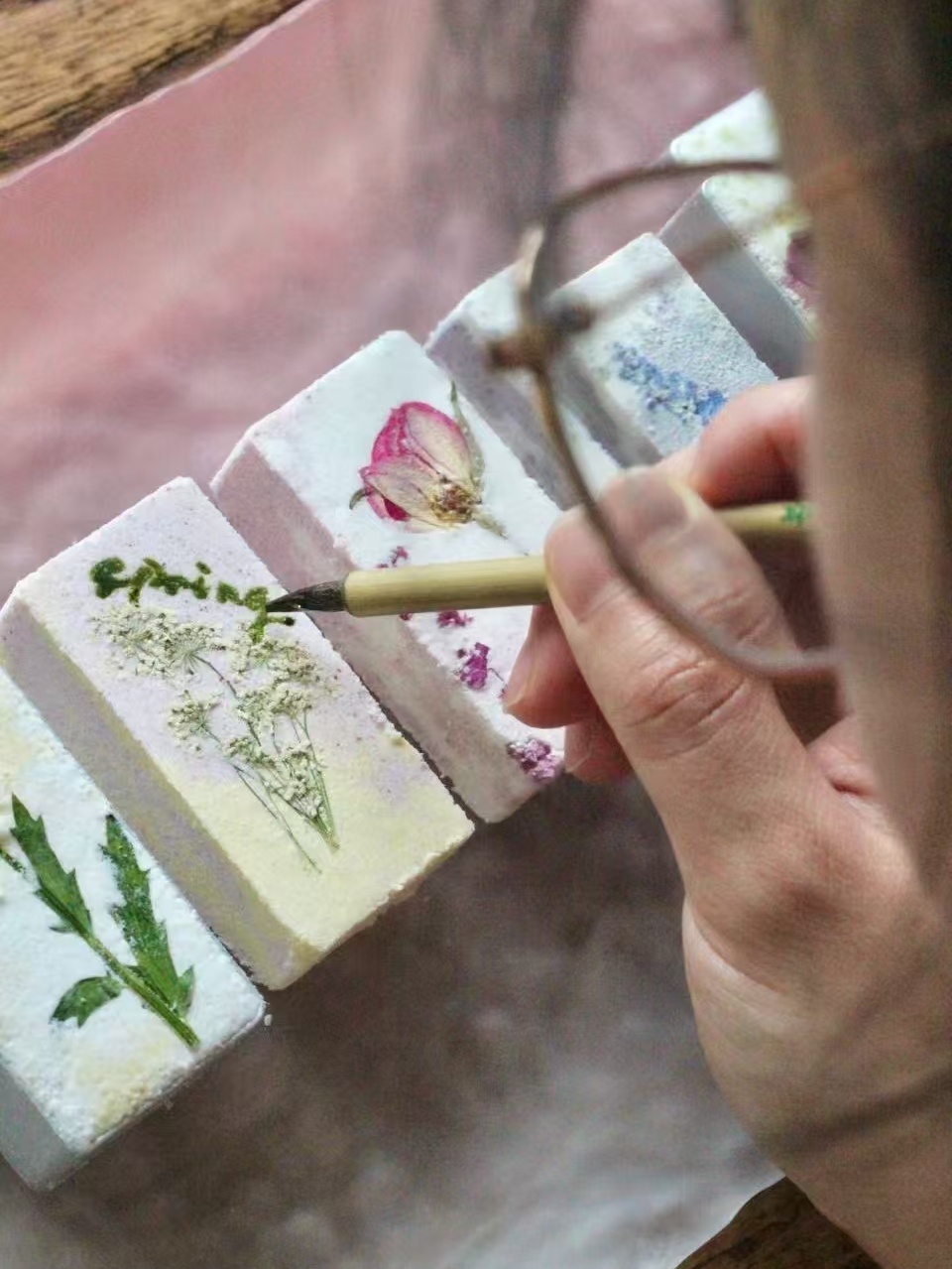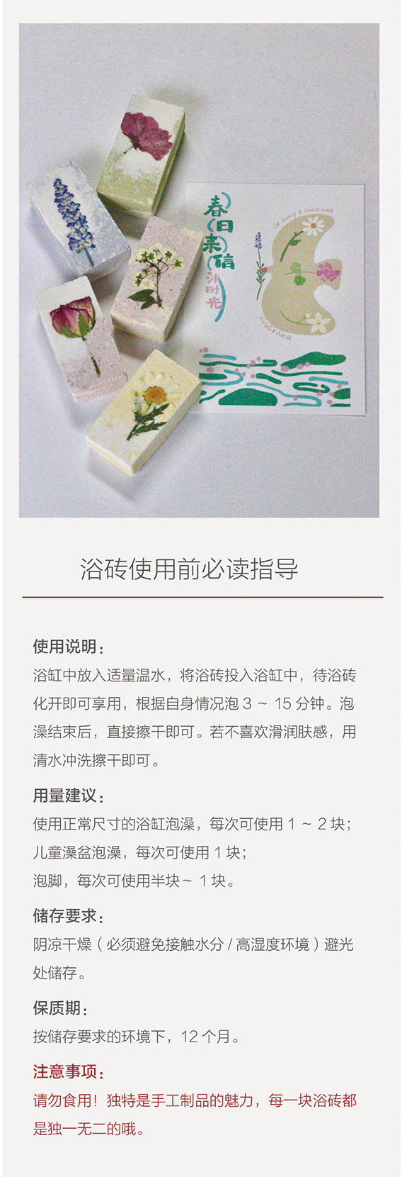 而且浴砖是纯手工制品,每一块都还有着独特的纹理和形状,就像艺术品一样!包装也不是完全统一的,看手上的装饰材料,很随机,但都很美哦!再加上手绘卡片和使用说明,真的好用心,用来送闺蜜都超好!不过一定要注意,这是用来泡澡的宝贝,虽然美丽到像一块小糕点,但千万不能食用,特别是家里有小朋友的老粉们,注意别往嘴里送哦!