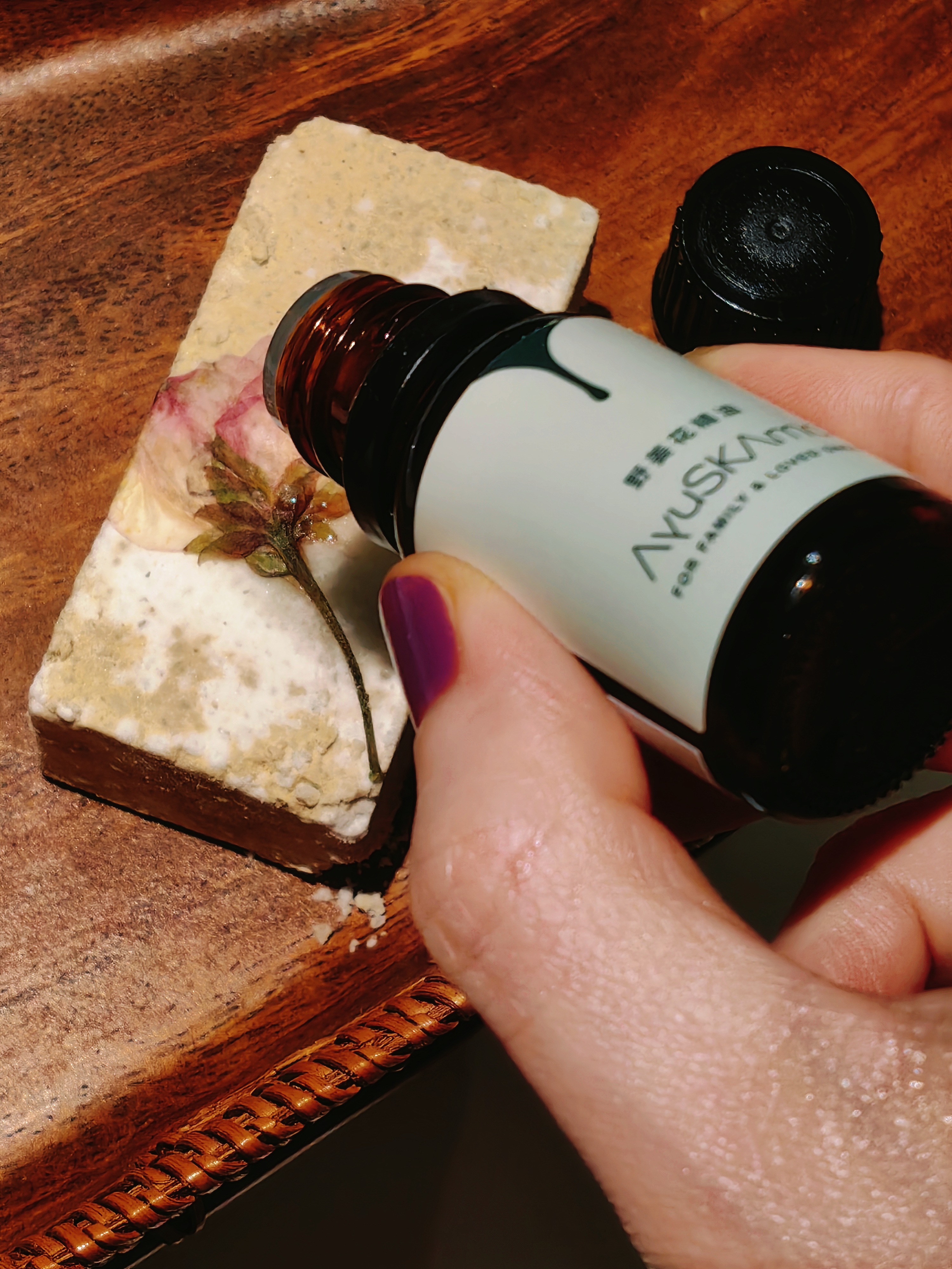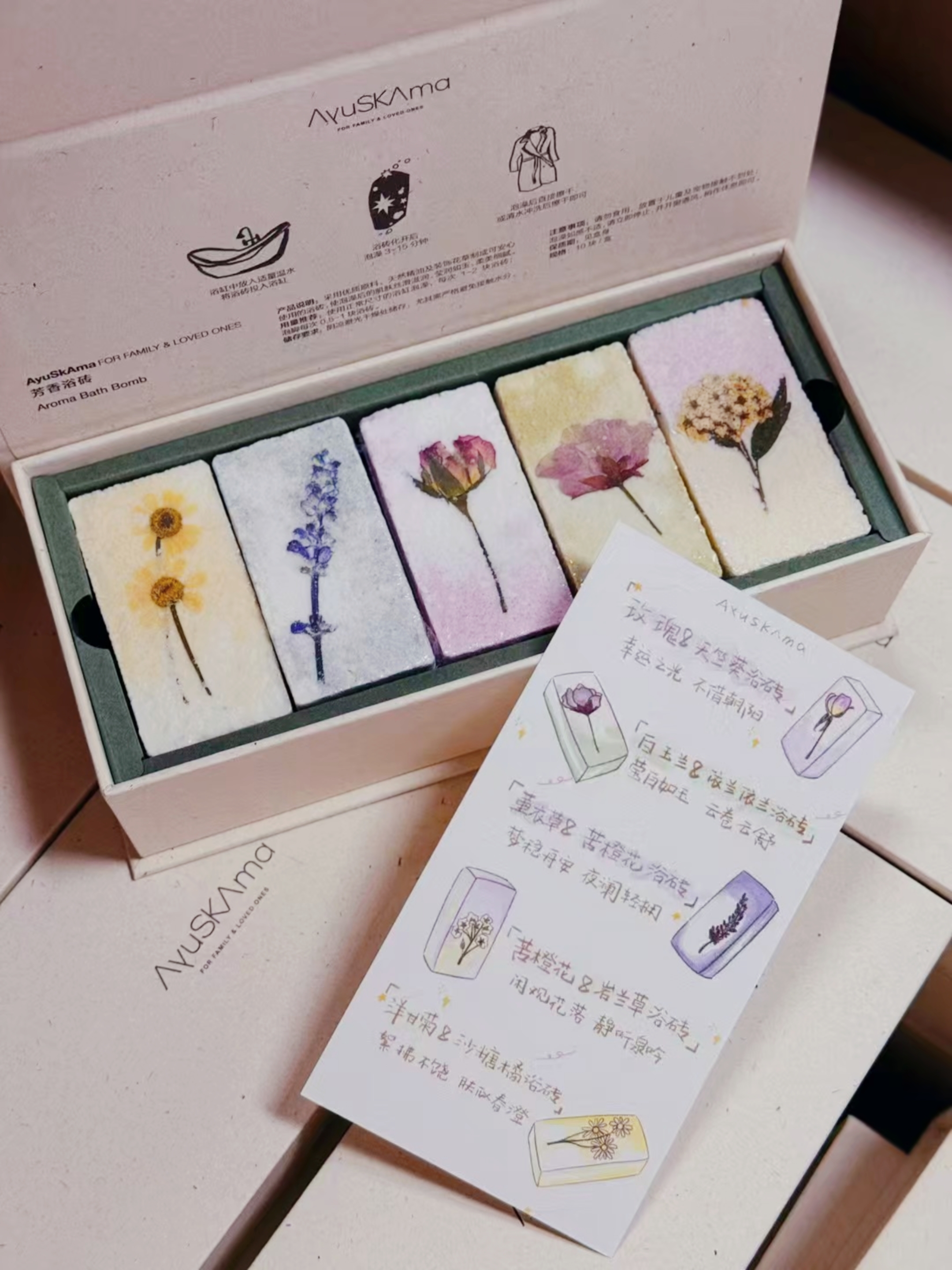 AyuSkAma精油浴砖用的都是食材级别原料、天然精油和装饰花草,泡澡后肌肤丝滑滋润,莹润如玉,柔美细腻。