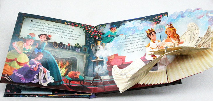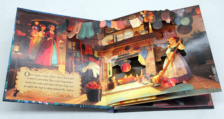 本书每一页都有动态效果,随着关和书页,书中的人物仿佛跳出了纸,来到我们的身边。随着南瓜变成了一辆华丽的金色马车,在宫殿的台阶上看到灰姑娘的玻璃鞋,她的破布变成了一件闪闪发光的舞会礼服……