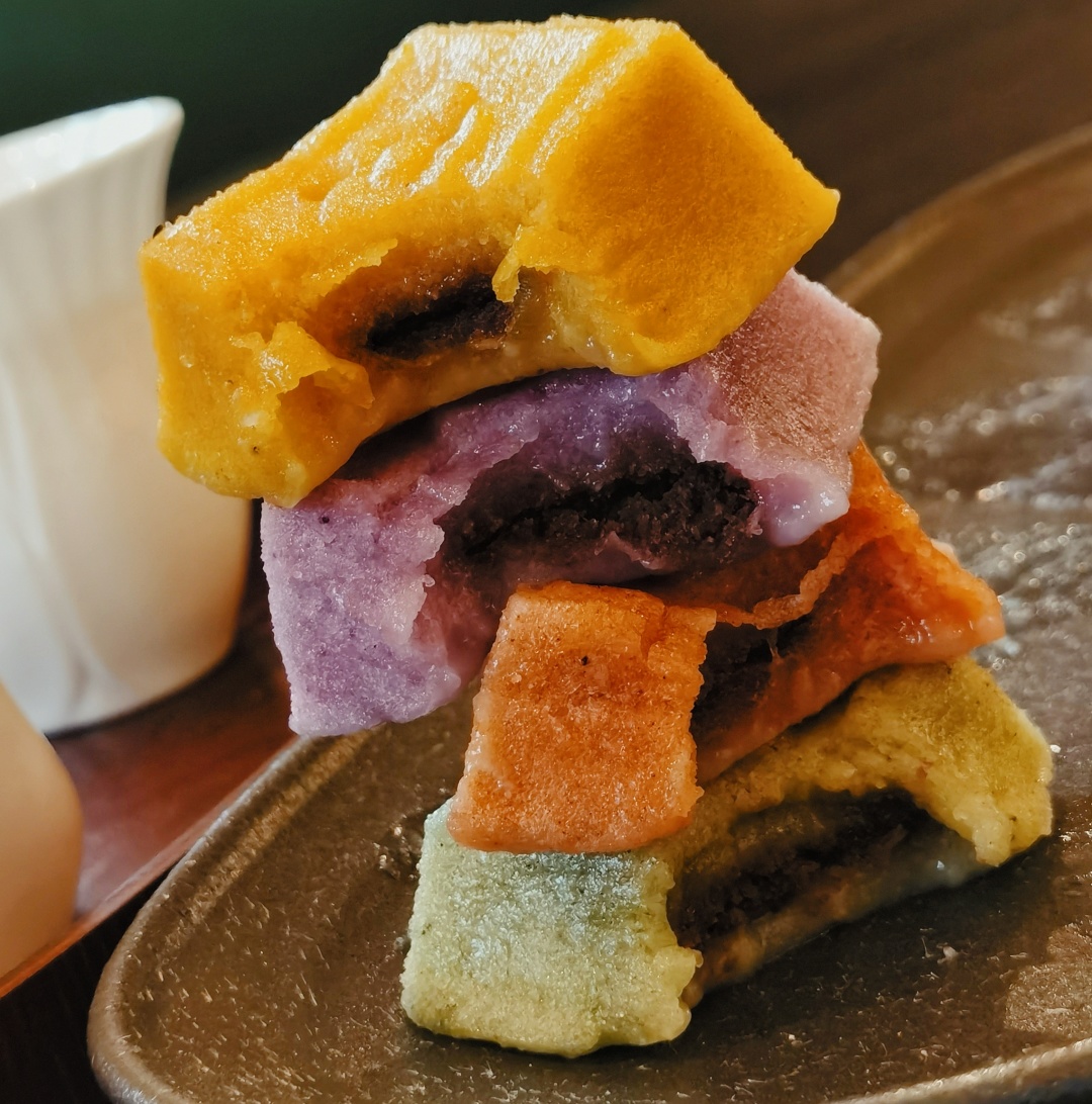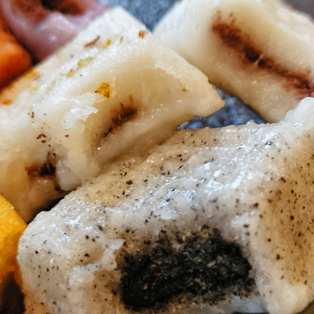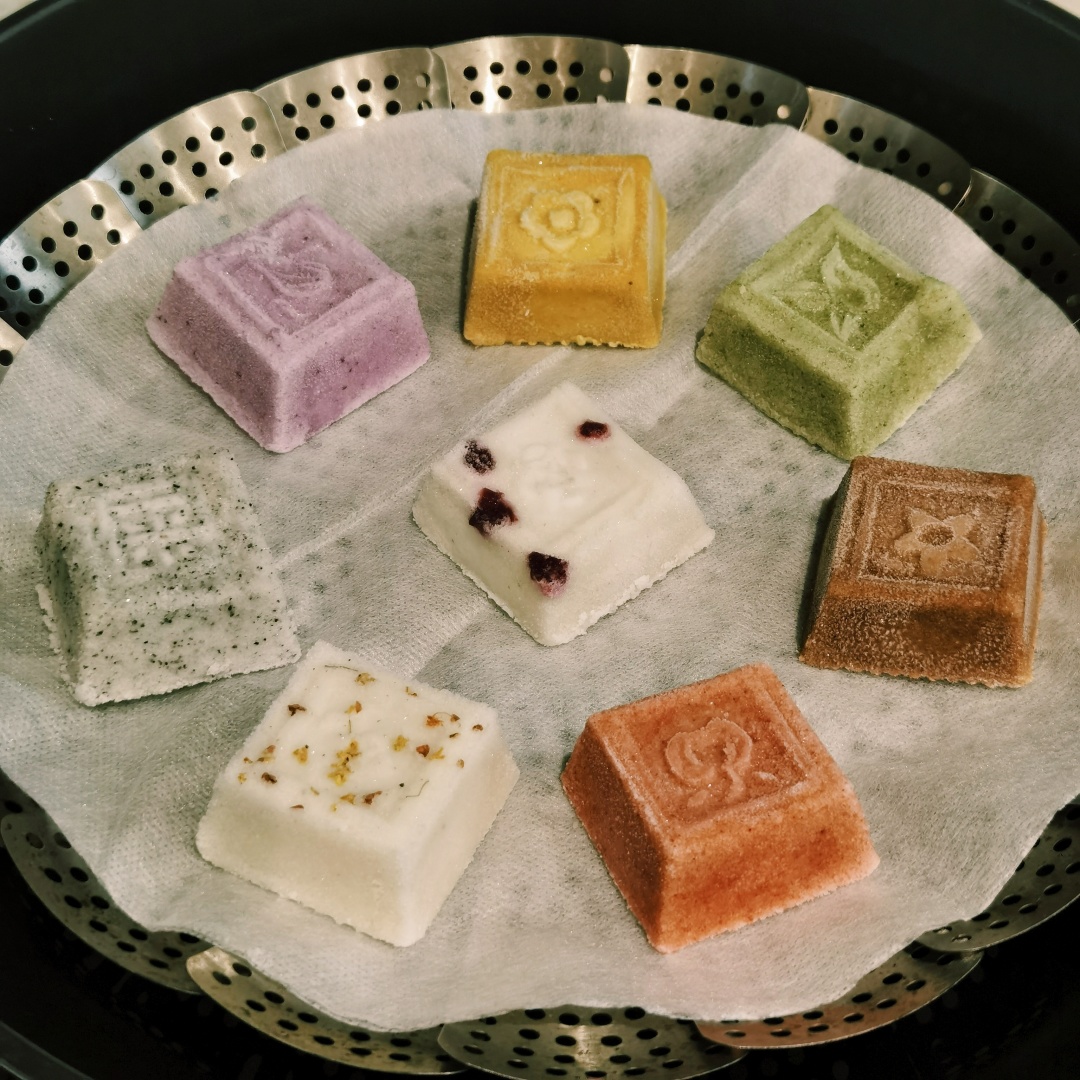 几种口味我都试过啦!桂花口味是新鲜桂花晒干后糖渍入馅,裹入松软雪白的外衣中,是经典江南风味;芝麻口味用了黑芝麻,混杂着米香,很是古朴香甜;白玉尺糕是传统的豆沙馅,再点缀上蔓越莓,口感更加丰富;还有果蔬七彩,就是实打实的颜值担当了,每一颗都各有特色!