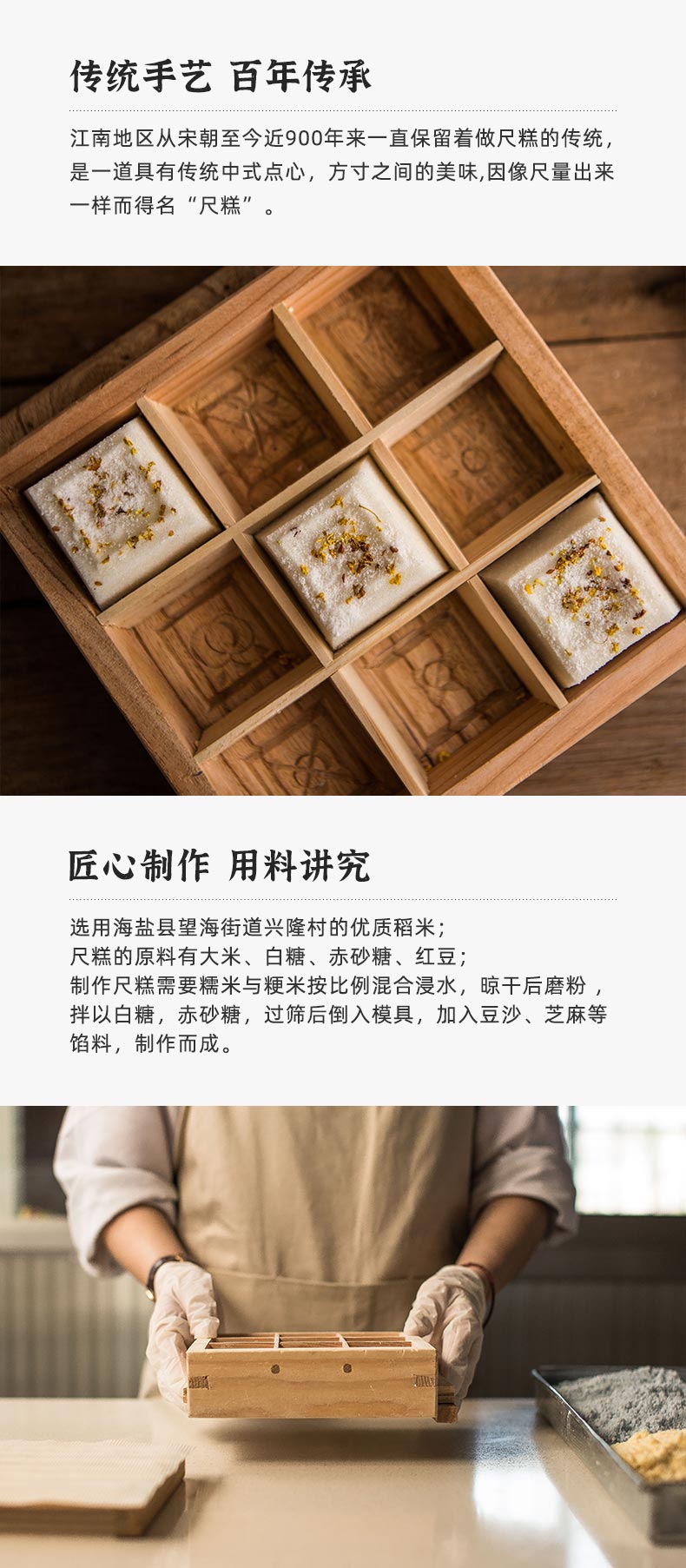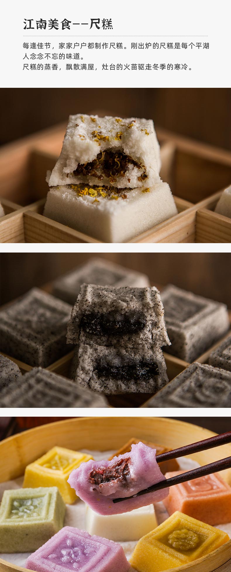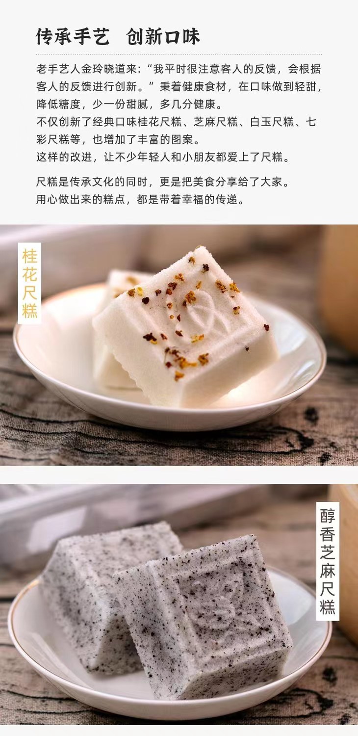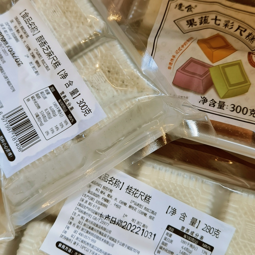 逢时的尺糕,特意找了浙江嘉兴的手作尺糕传承创新者金玲晓帮忙,她的长辈都是制作尺糕的老匠人,因此也很熟悉这门传统手艺,并且在传承的同时还进行了改良,尺寸上更小巧,并降低了甜度,在口味上也做了创新,包括桂花、芝麻、白玉、果蔬七彩,都是手工制作,不额外添加任何防腐剂,配料表很干净,其中的七彩,也并没有添加色素,彩虹般绚丽的色彩是添加了果蔬粉,黄的是南瓜、绿色是菠菜、紫是紫薯、红是甜菜,老人小孩都可以放心吃!