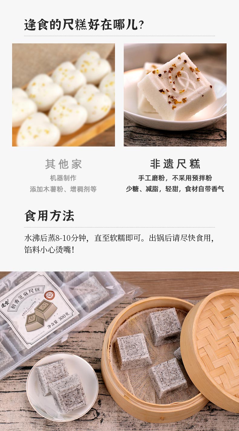 尺糕是需要-18°C冷冻保存的,比较推荐蒸着吃,口味更为还原,淡淡米香特别诱人,咬上一口,就能感受到它的松软,但同时又带着一股“劲”,和松散的糕点不同,是粘粘的哦,软糯香甜,绵密不腻,甜度也真的是恰到好处!当然啦,大家也可以煎着吃煮着吃,也相当有风味啦!