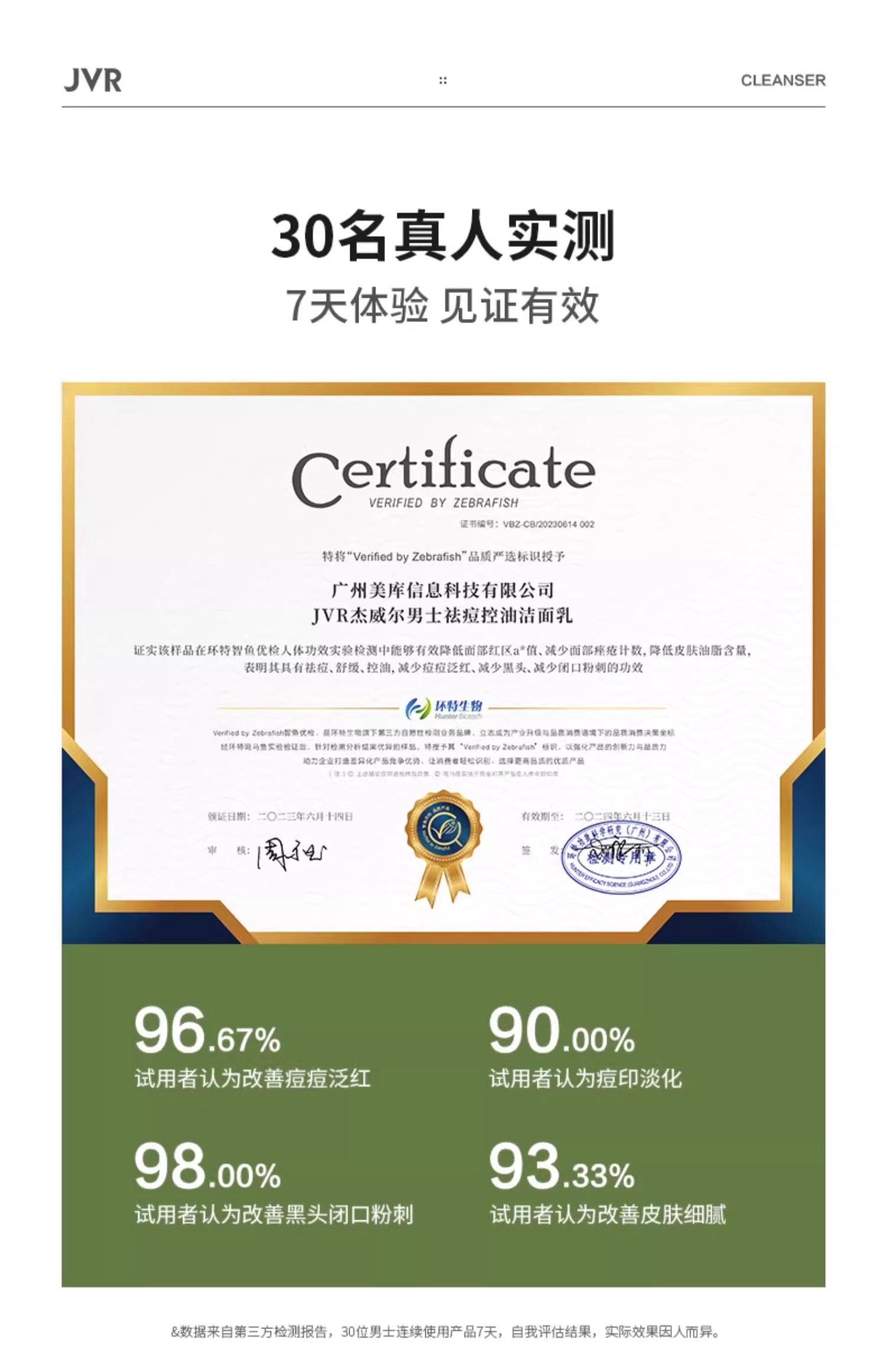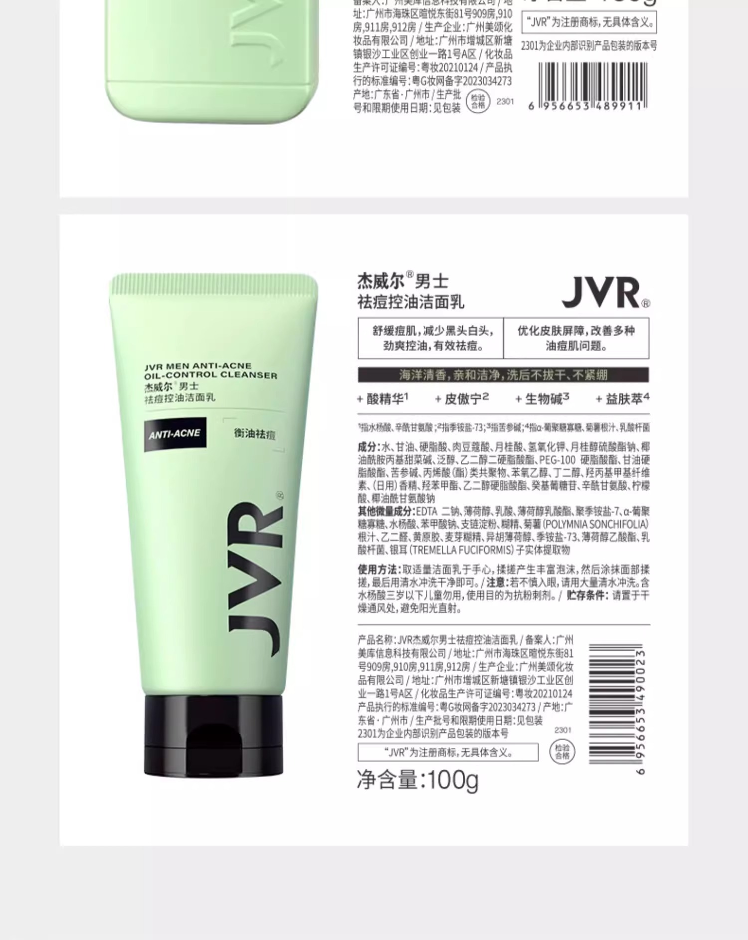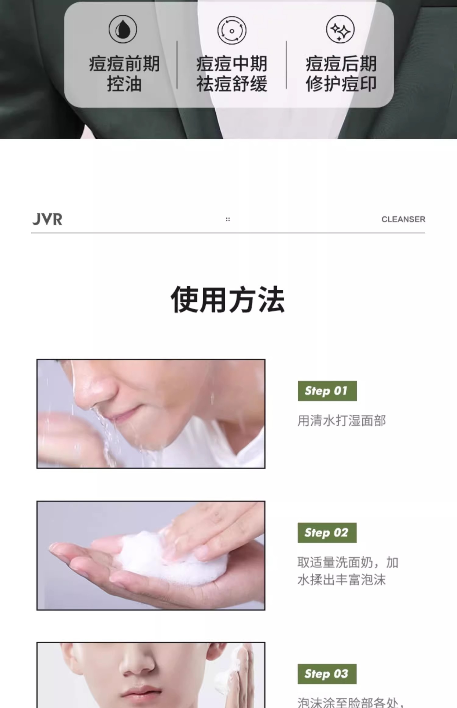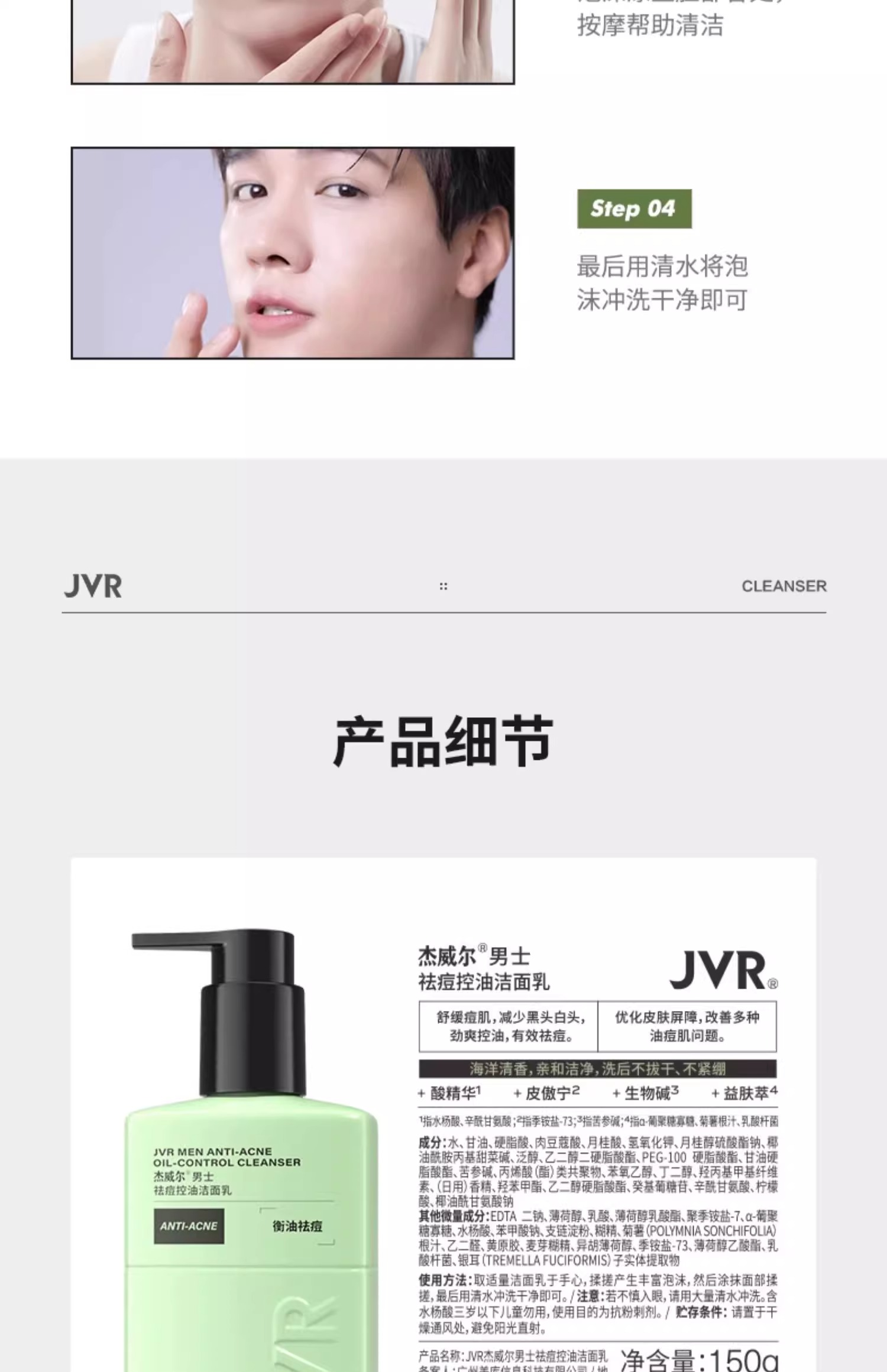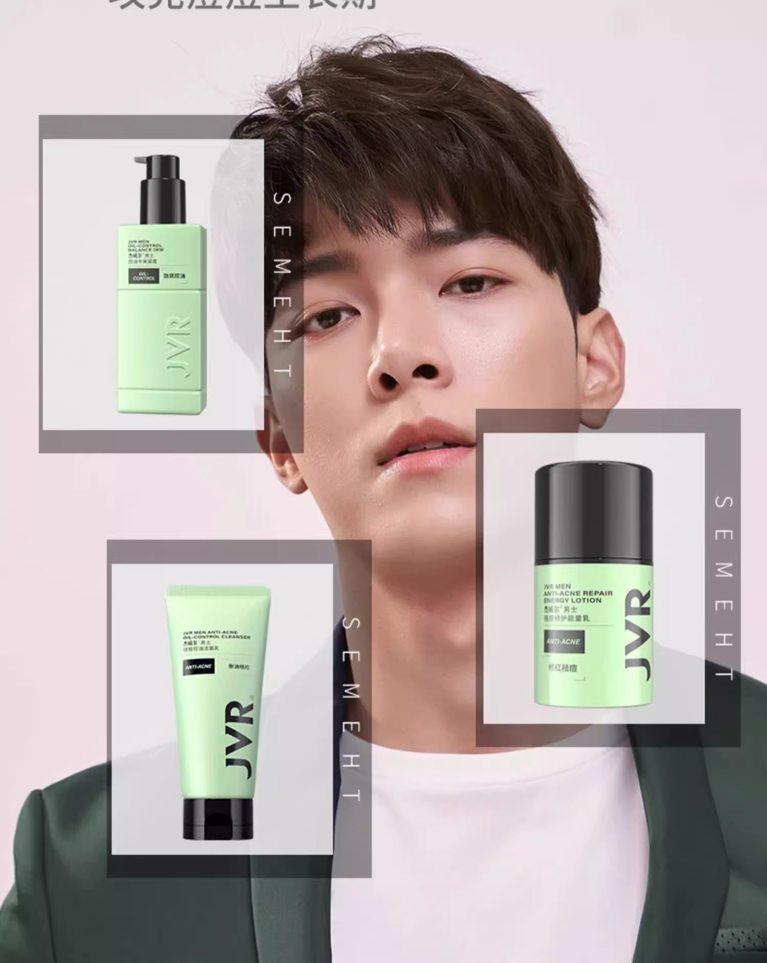 JVR杰威尔男士专用洗面奶祛痘控油去黑头洁面乳膏乳霜护肤品套装夏季