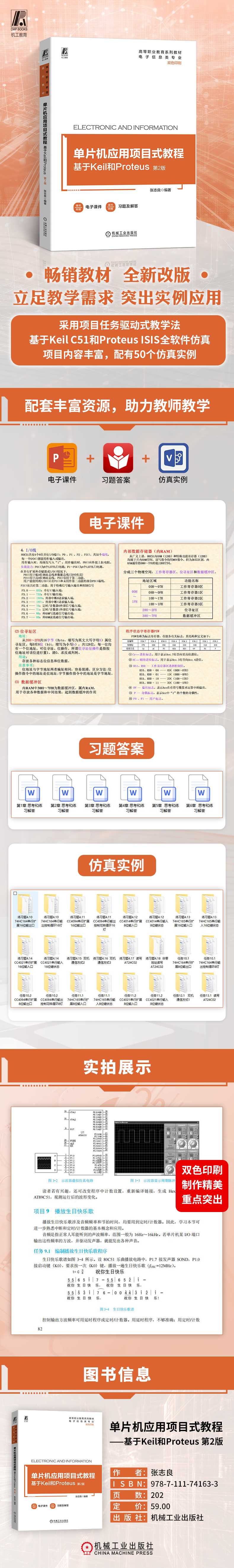 【前言】科技兴则民族兴,科技强则国家强。党的二十大报告指出,必须坚持科技是第一生产力、人才是第一资源、创新是第一动力,深入实施科教兴国战略、人才强国战略、创新驱动发展战略,开辟发展新领域新赛道,不断塑造发展新动能新优势。单片机应用领域之广,几乎到了无孔不入的地步,自动化、数字化、智能化、信息化均离不开单片机的应用。因而高职院校工科类专业普遍开设了;单片机应用课程,它既是一门非常重要的公共专业课,又是一门比较难学的课程。对目前高职层次的学生来说,选用项目任务驱动式的教材和教学方法,有利于取得较好的教学效果。编者在编写本书时力求做到以下几点。1)采用项目任务驱动式教学法。暂先避开庞大繁杂的;原理理论,边;操作、边直观感受单片机应用电路和程序运行过程,便于学生对照电路和程序,逐步深入理解,提高学习兴趣。2);基础知识相对集中。为避免单片机;原理理论的碎片化,本书将理论部分相对集中,编为;基础知识,分布在每一章中。由于本书案例程序每条语句均已给出注释,因此建议;基础知识以学生阅读为主,教师讲解答疑为辅。3)基于Keil C51和Proteus ISIS全软件仿真。;单片机应用是一门实践性很强的课程,需要实验,但实验需要配备价格不菲的开发装置,相对不便,且各校硬件实验设备各不相同。本书编写基于Keil C51和Proteus ISIS软件,读者可在PC上虚拟调试运行单片机应用电路和目标程序,不涉及具体硬件实验设备。这样既能供教学演示,又可让学生课后边学边练,进行实验操作。4)项目内容丰富,便于选择。本书编有常见常用教学案例项目23个(共30个实例),基本上能满足绝大多数高职院校和专业的教学需求。教师可根据本校本专业需要和课时安排的实际情况,选择部分案例教学。此外,还编有与教学案例相近的可模仿、可扩展的练习题,以便于学生课后练习。5)编有配套的;单片机项目式教程仿真50例。为配合教学,将书中项目案例(包括练习题)整合为仿真文件包,内含Proteus仿真电路DSN文件和驱动程序Hex文件,全部通过Keil调试和Proteus虚拟仿真,不设门槛,供读者免费获取。6)将思考与练习题解答编为配套的电子资源,供读者免费获取。需要说明的是,Proteus虚拟仿真电路虽然非常接近单片机实际硬件应用系统,但毕竟有所区别,不宜完全替代单片机实际硬件实验。因此,编者建议,有条件的院校和读者还应选择几个典型案例进行硬件实验。本书由上海电子信息职业技术学院张志良编著。限于编者水平,书中错误和不妥之处恳请读者批评指正(编者的E_mail:zzlls@126.com),来信必复。