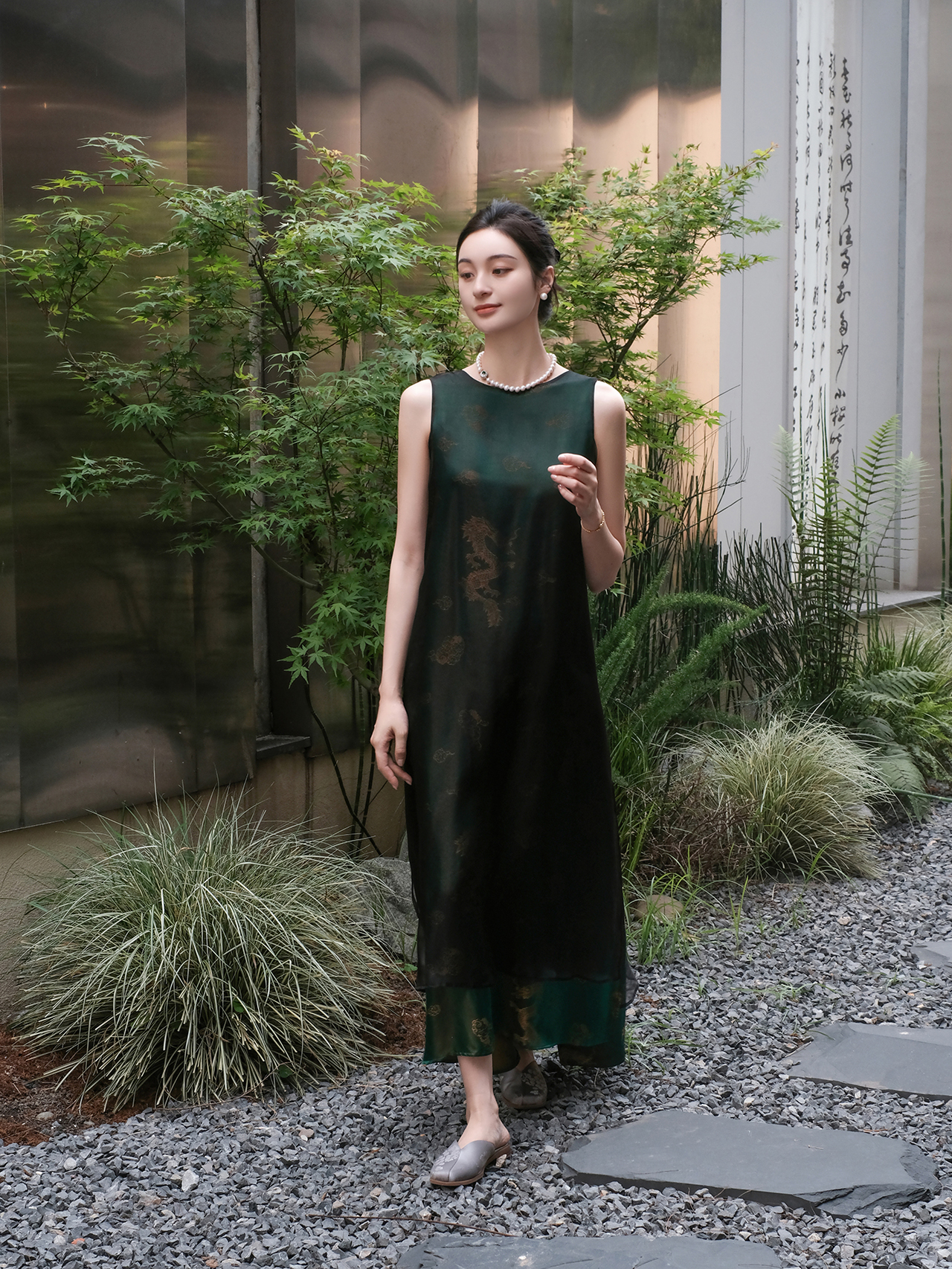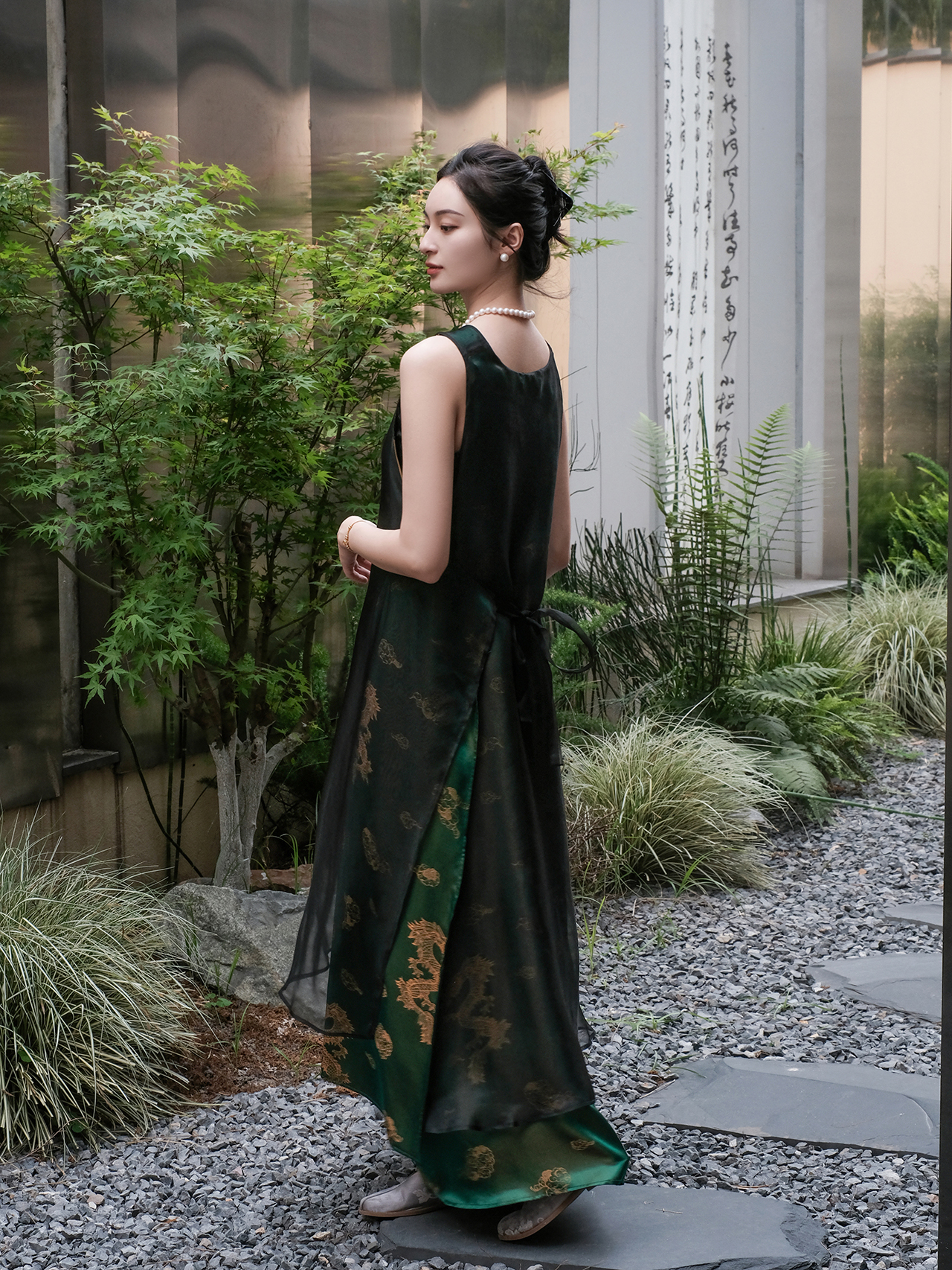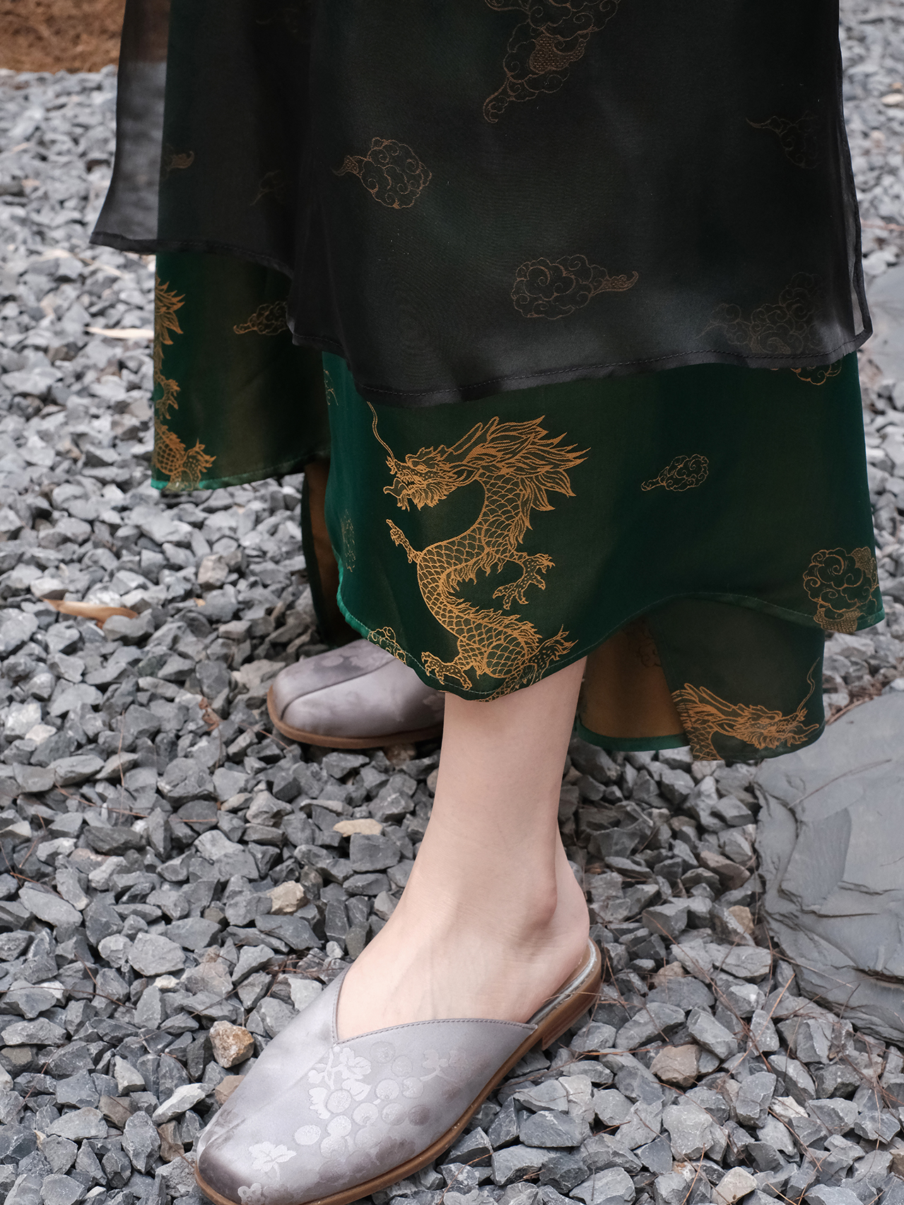盛唐牡丹 |孔雀绿龙纹真丝绡长款三穿马甲